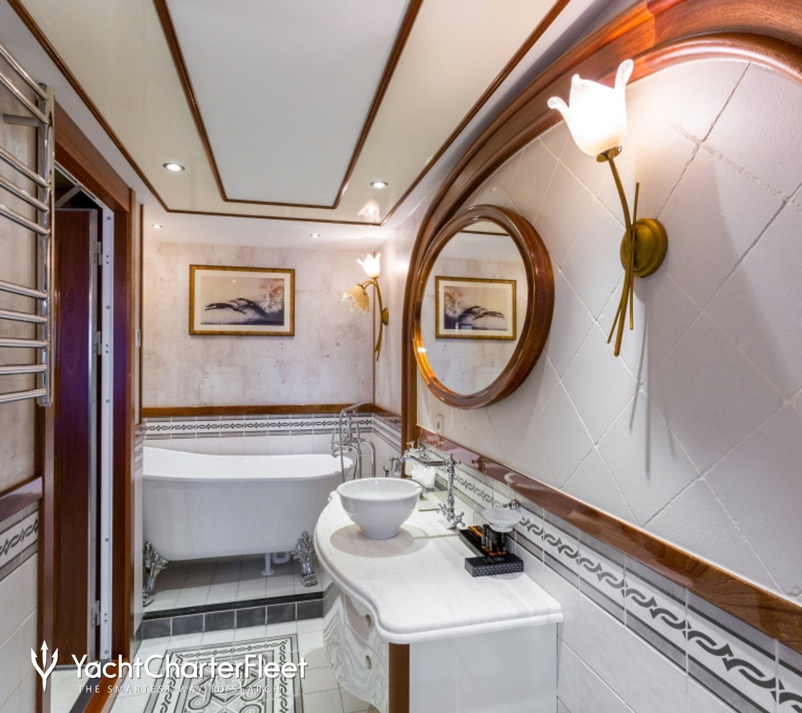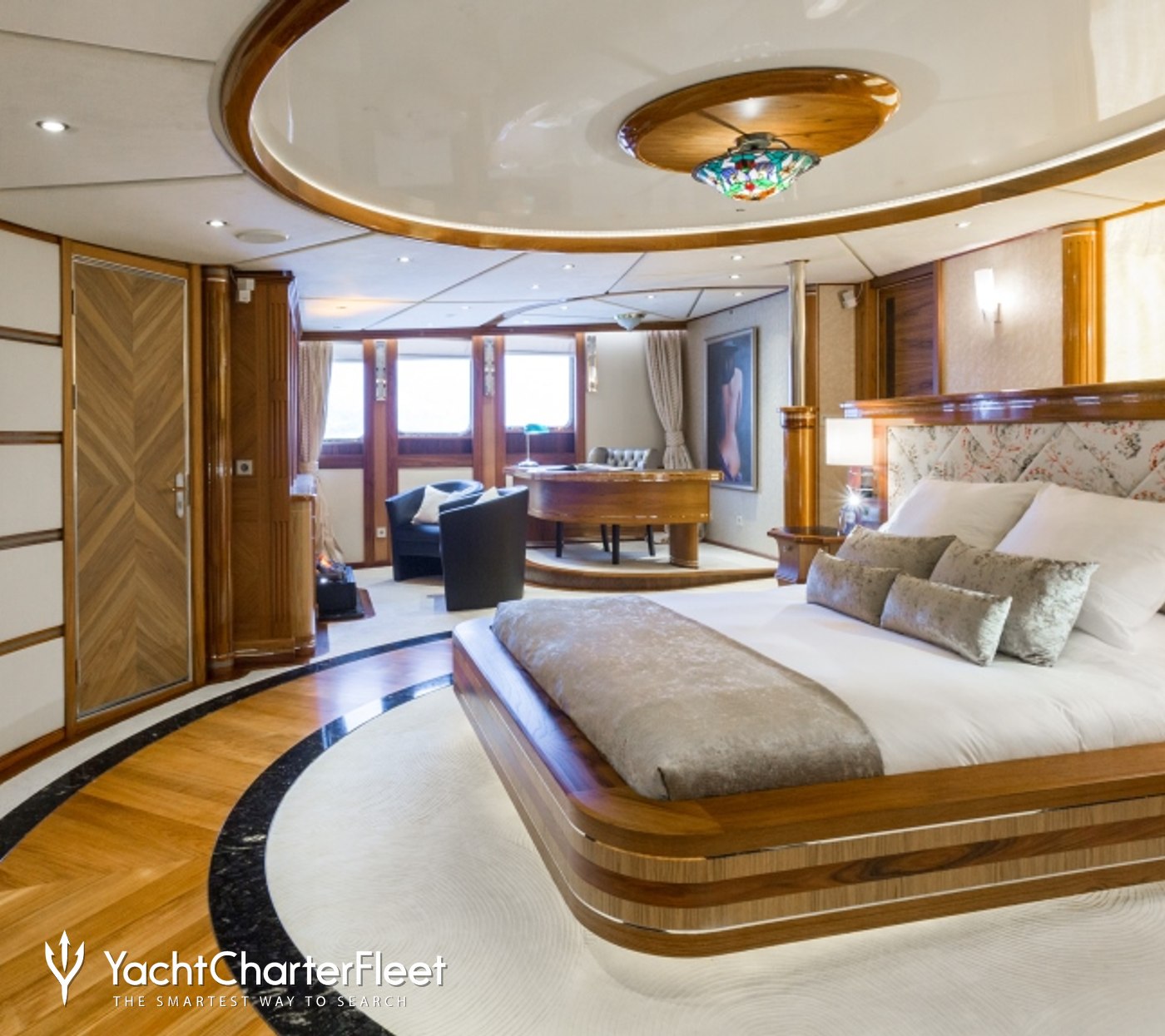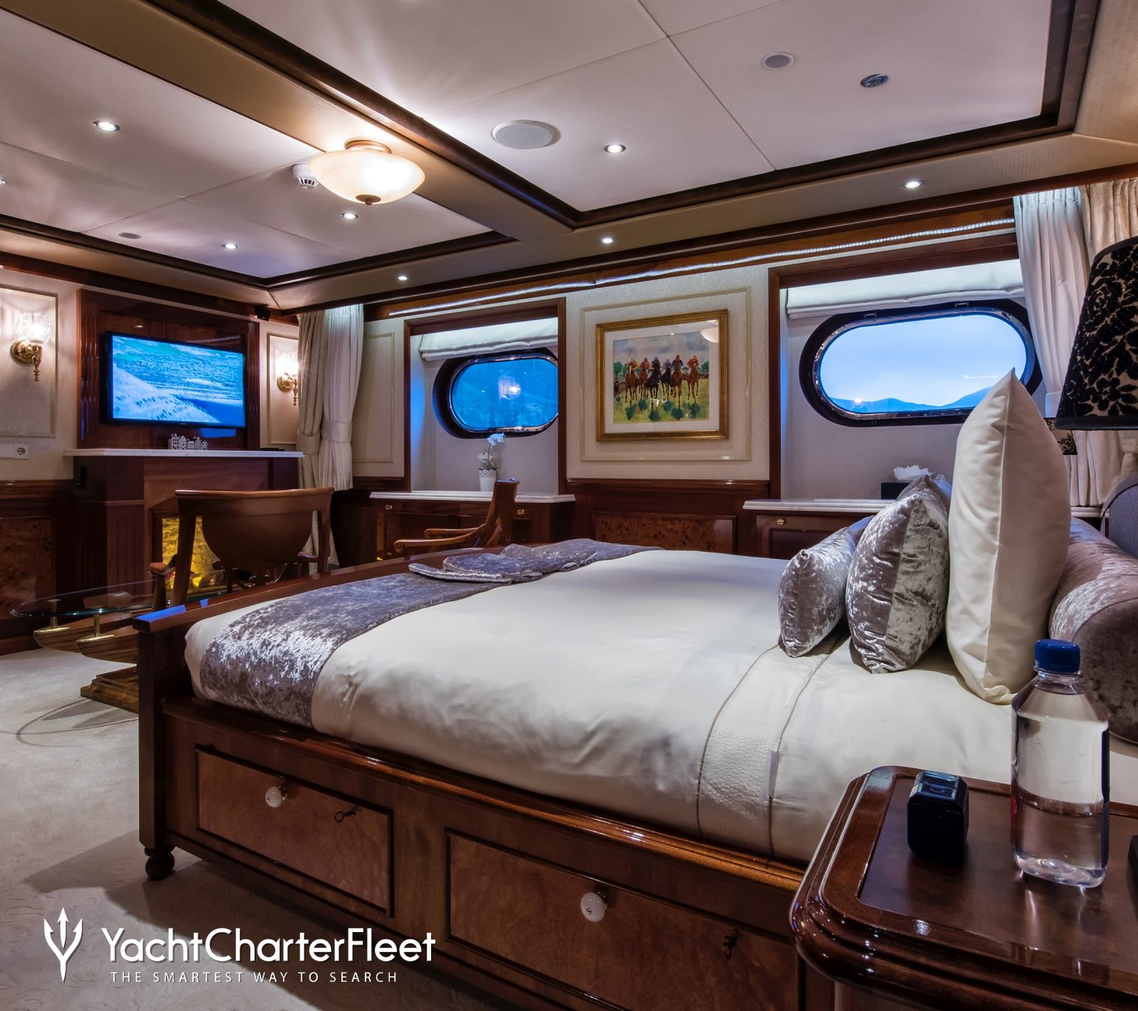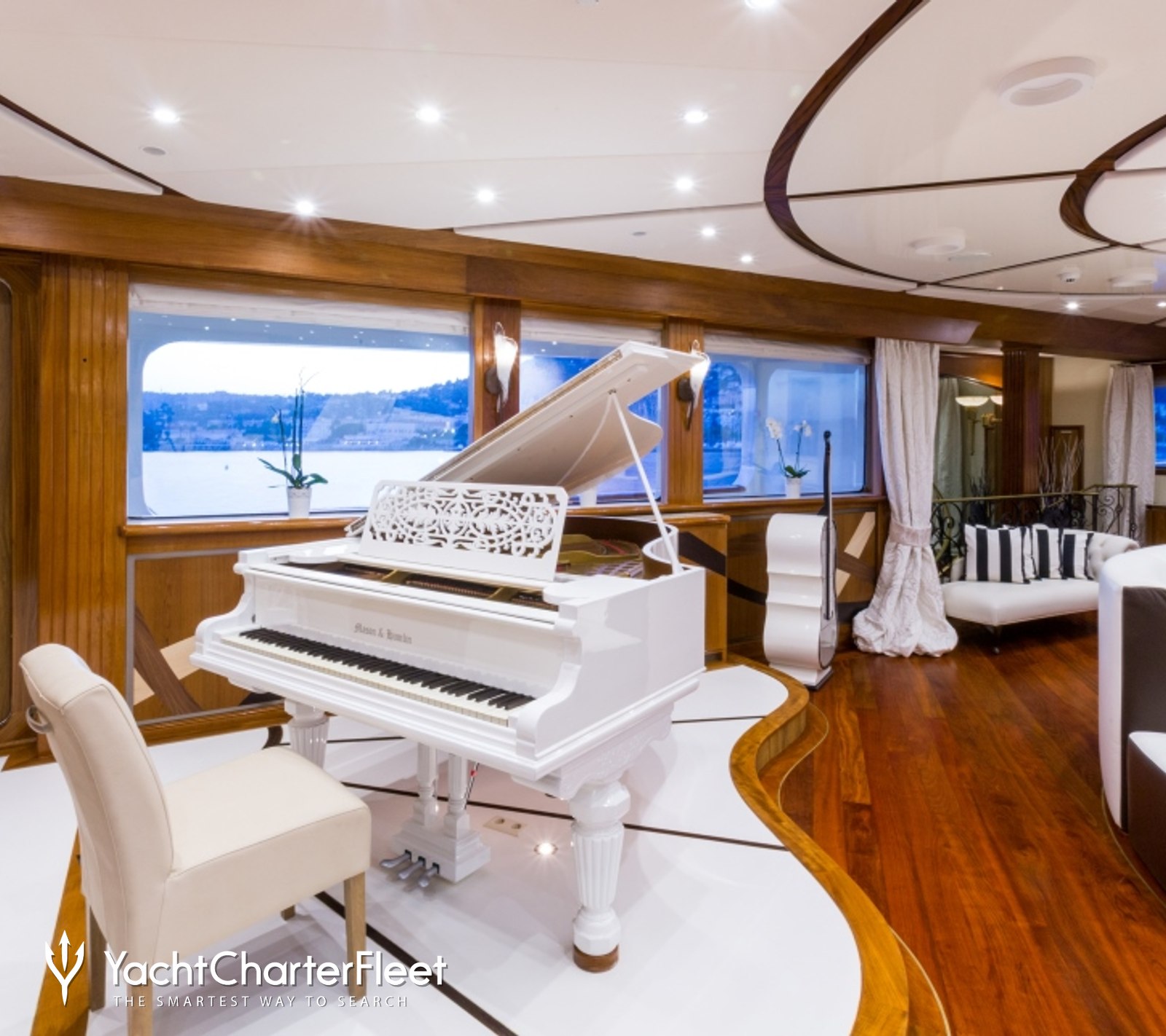 The charter yacht also features a plush 14-seat cinema, a whisky bar, and a cigar lounge, creating luxurious retreats for evenings onboard.