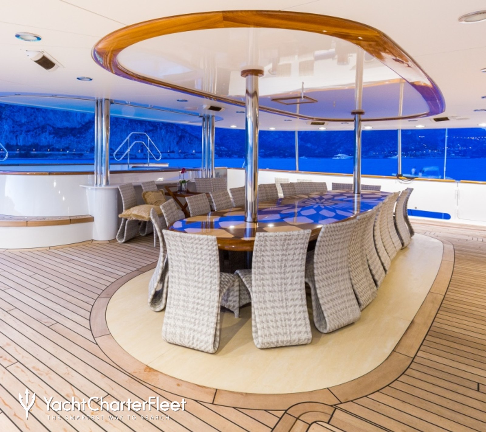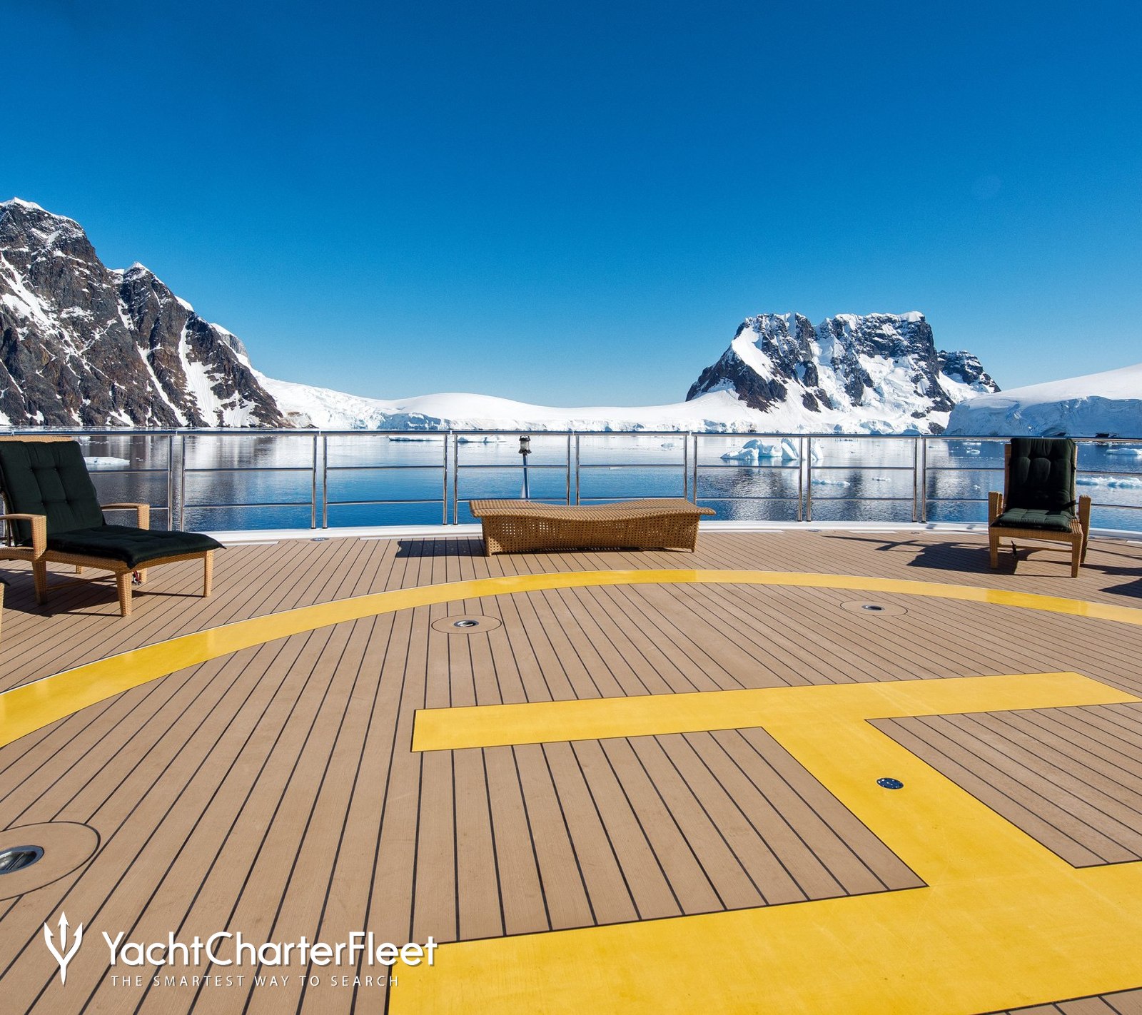 Multiple outdoor decks provide sweeping vantage points for iceberg viewing, wildlife spotting, and, of course, the eclipse itself. These open-air areas include a helipad, versatile lounging spaces, and alfresco dining zones, all crafted to blend the thrill of expedition with contemporary yacht luxury.