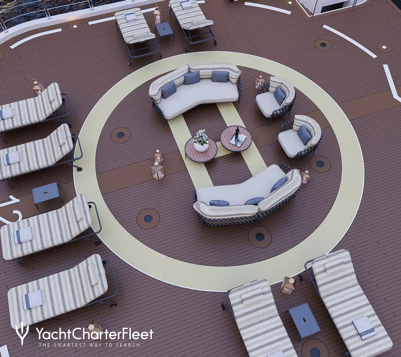 Refreshed lifestyle spaces onboard yacht rental AQUA LARES will include a panoramic sundeck with a lounge and bar, a cinema and boutique, and versatile dining areas both inside and alfresco style.