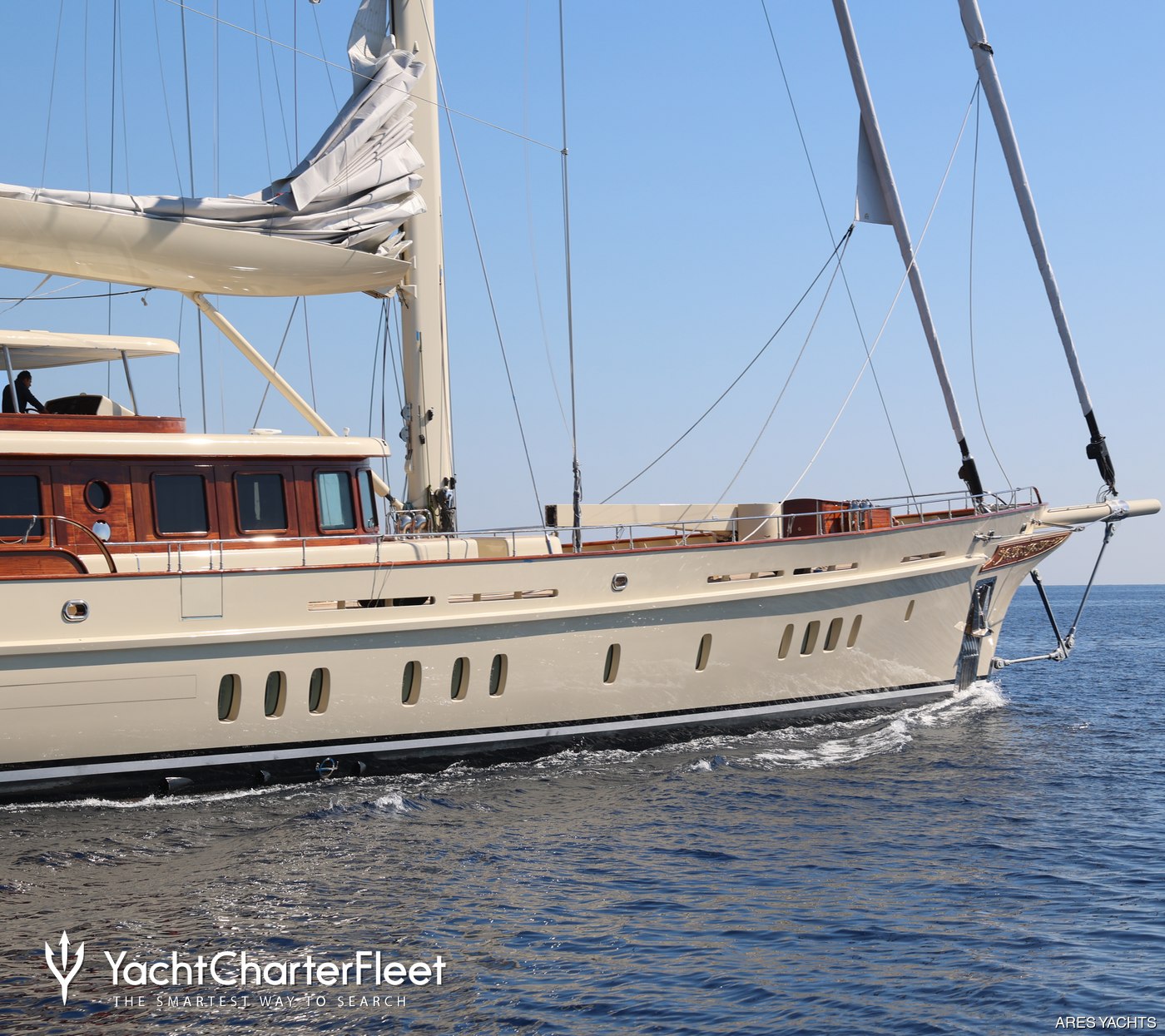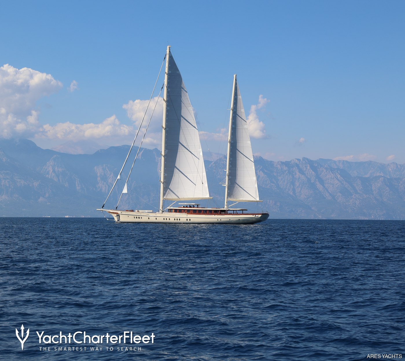Her sweeping deck lines, impressive twin masts, and traditional laid teak decks evoke the timeless romance of authentic sailing, while the yacht’s onboard comfort aligns with the expectations of today’s luxury charter yachts.