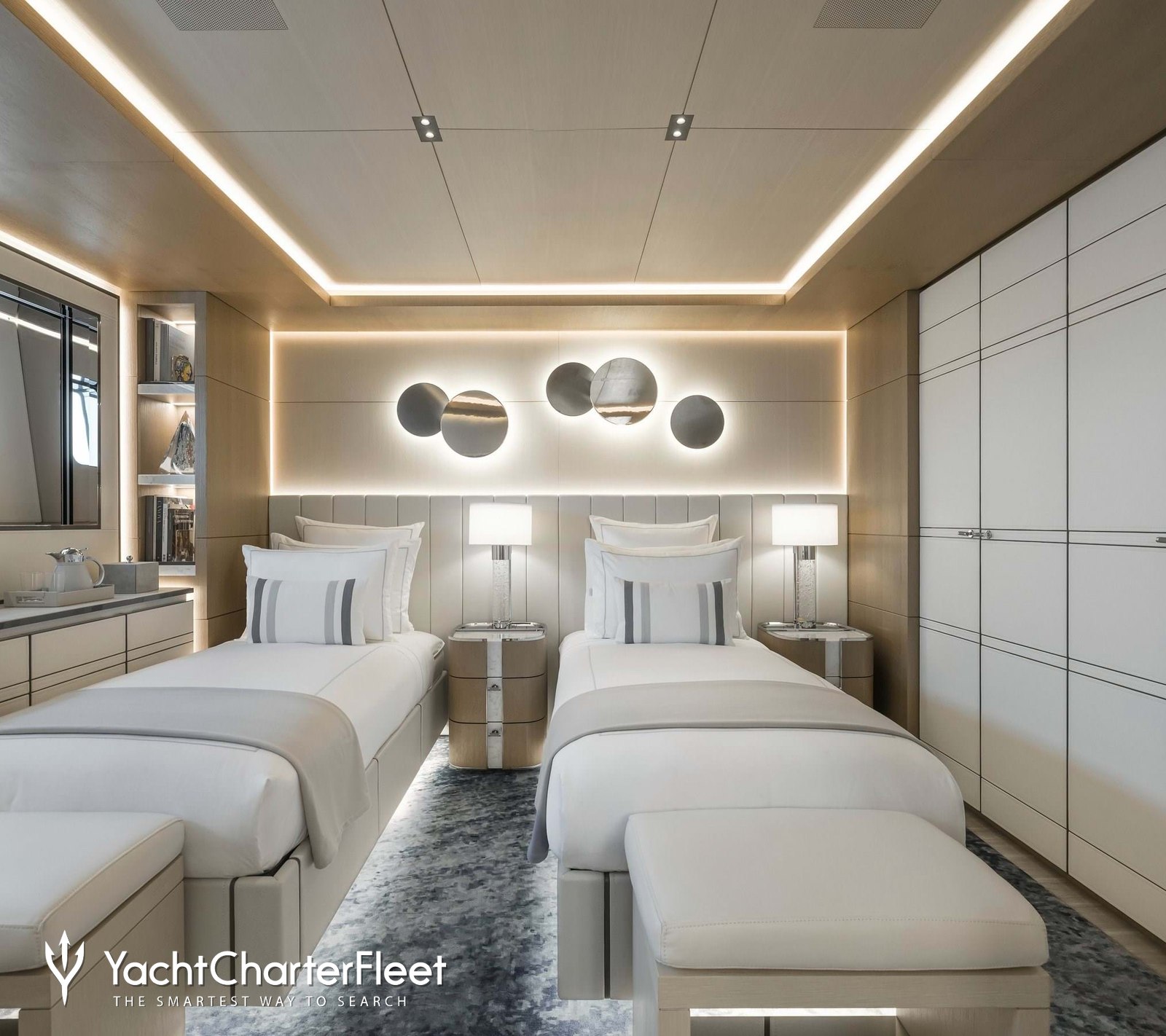 Overnight accommodation continues the same elegant, neutral aesthetic as the social areas, with the six-cabin composition hosting a sophisticated master cabin, and a selection of guest cabins, all with their own private ensuite facilities.