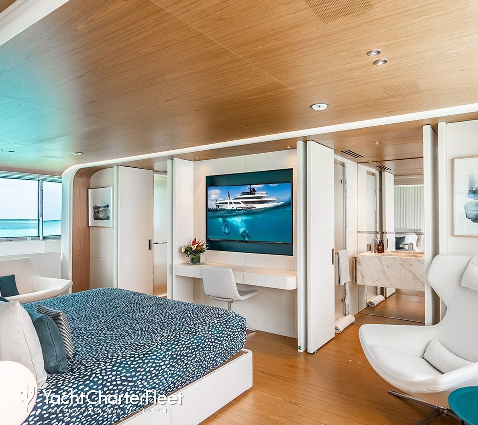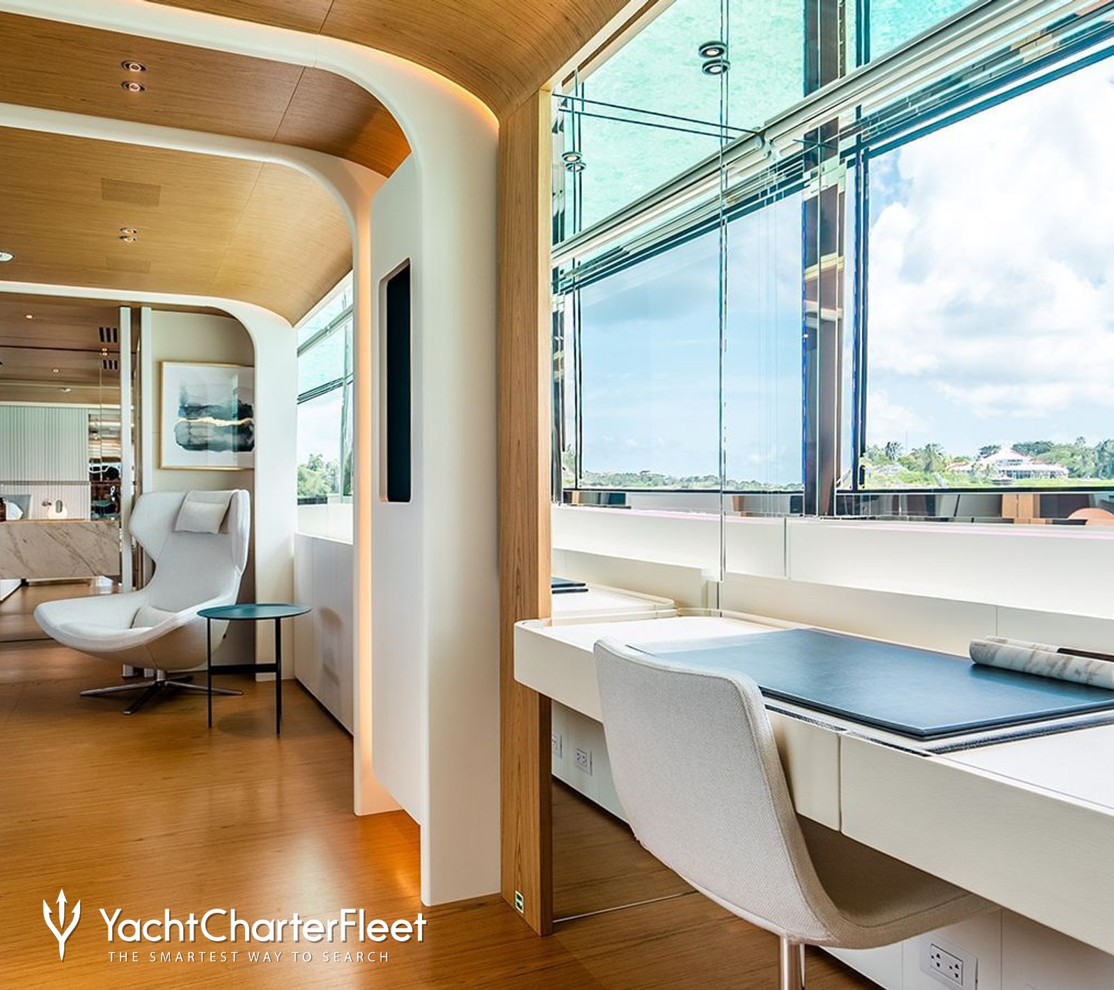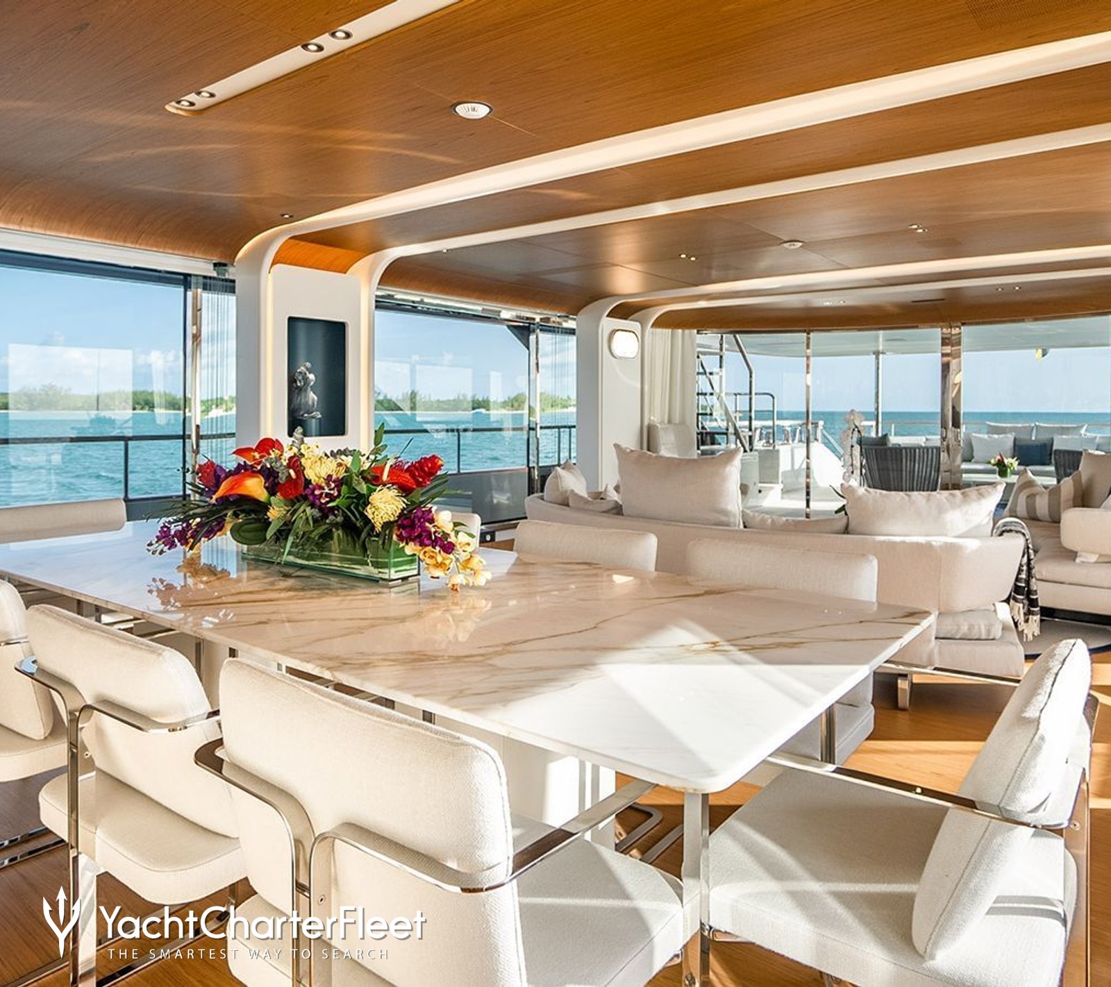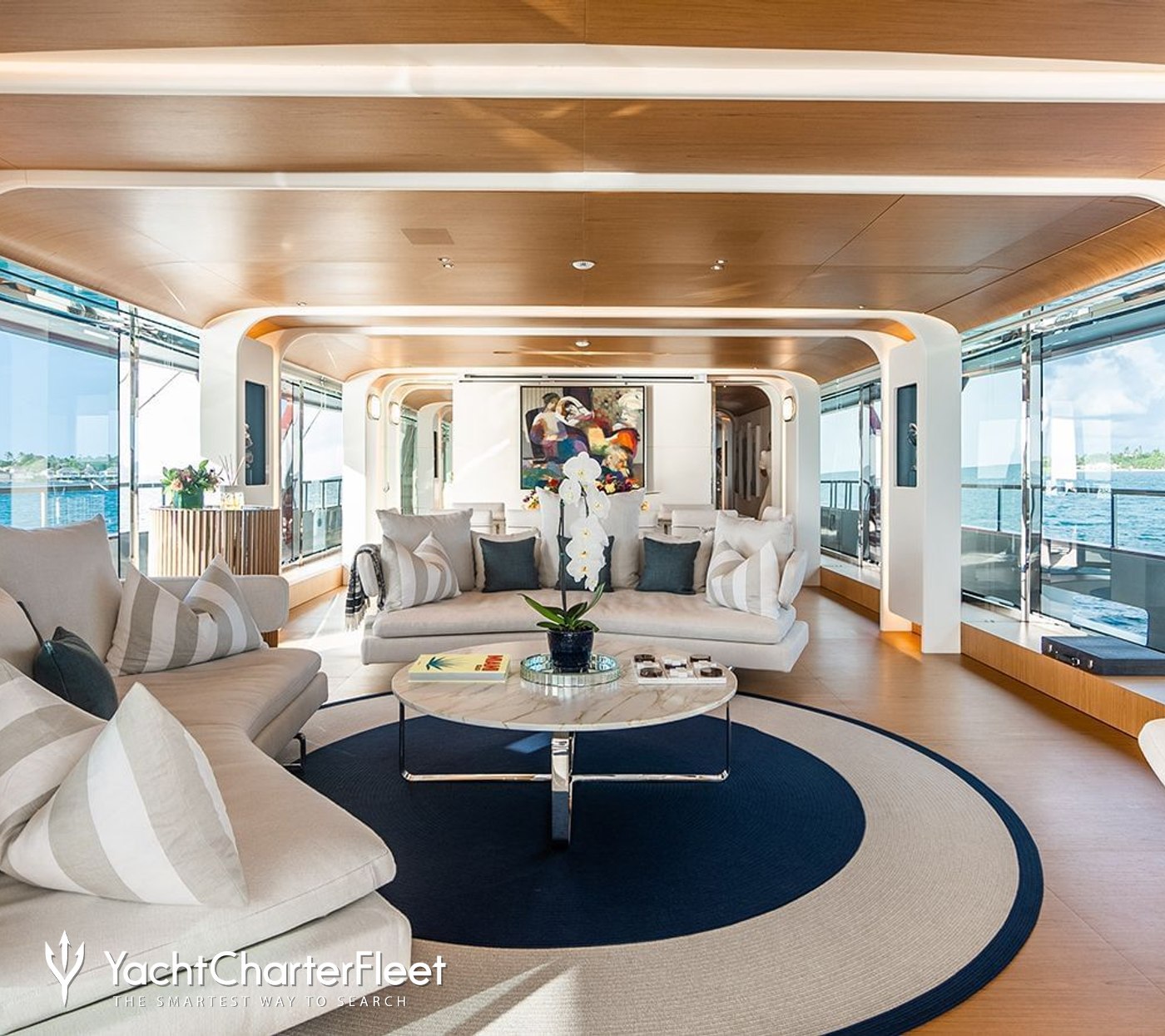 Large windows throughout the main salon and living spaces bring in natural light and uninterrupted views, reinforcing the connection to the surrounding seascape. The overall layout is designed to feel open and social, while still offering private areas to unwind.