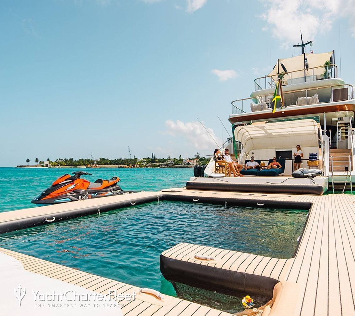 The swimming pool creates a natural focal point, ideal for cooling off between activities, while the beach club provides a direct connection to the sea, perfect for launching water toys or simply relaxing at the water’s edge. As evening falls, underwater lighting enhances the atmosphere, creating an inviting setting for nights at anchor during charter vacations in the Bahamas.