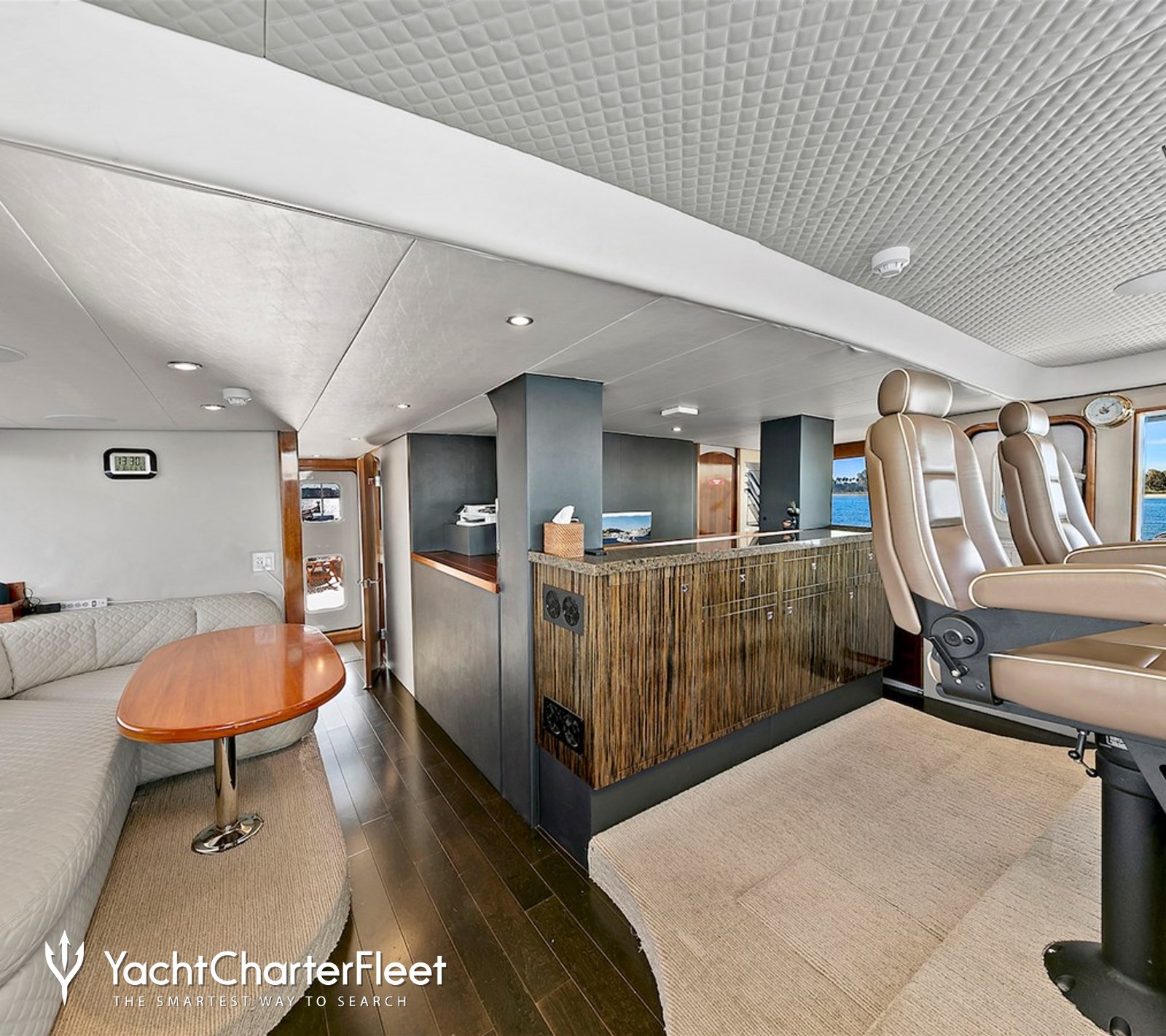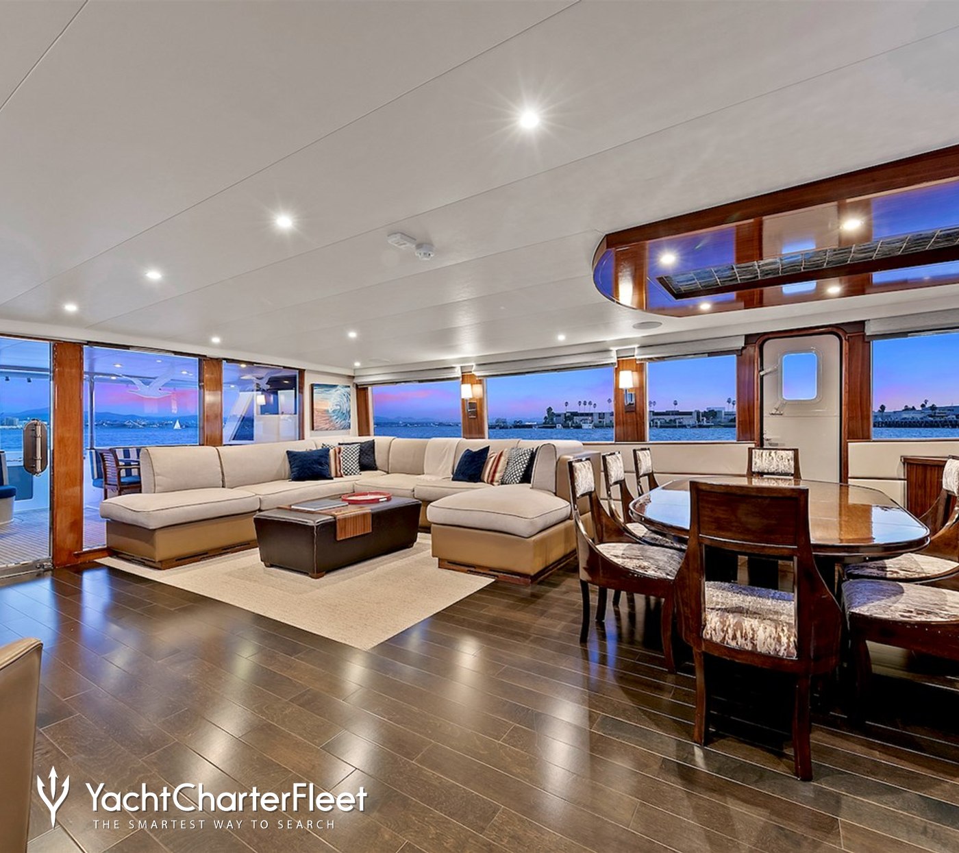 Vast stretches of glazing allow plenty of natural light to filter through the main salon, with all seating areas conveniently placed for optimal views when the weather is less agreeable. Featuring a comfortable lounge area, a formal dining setup, and quiet nooks, the open-plan layout makes this luxury yacht a great choice for family yacht charters.