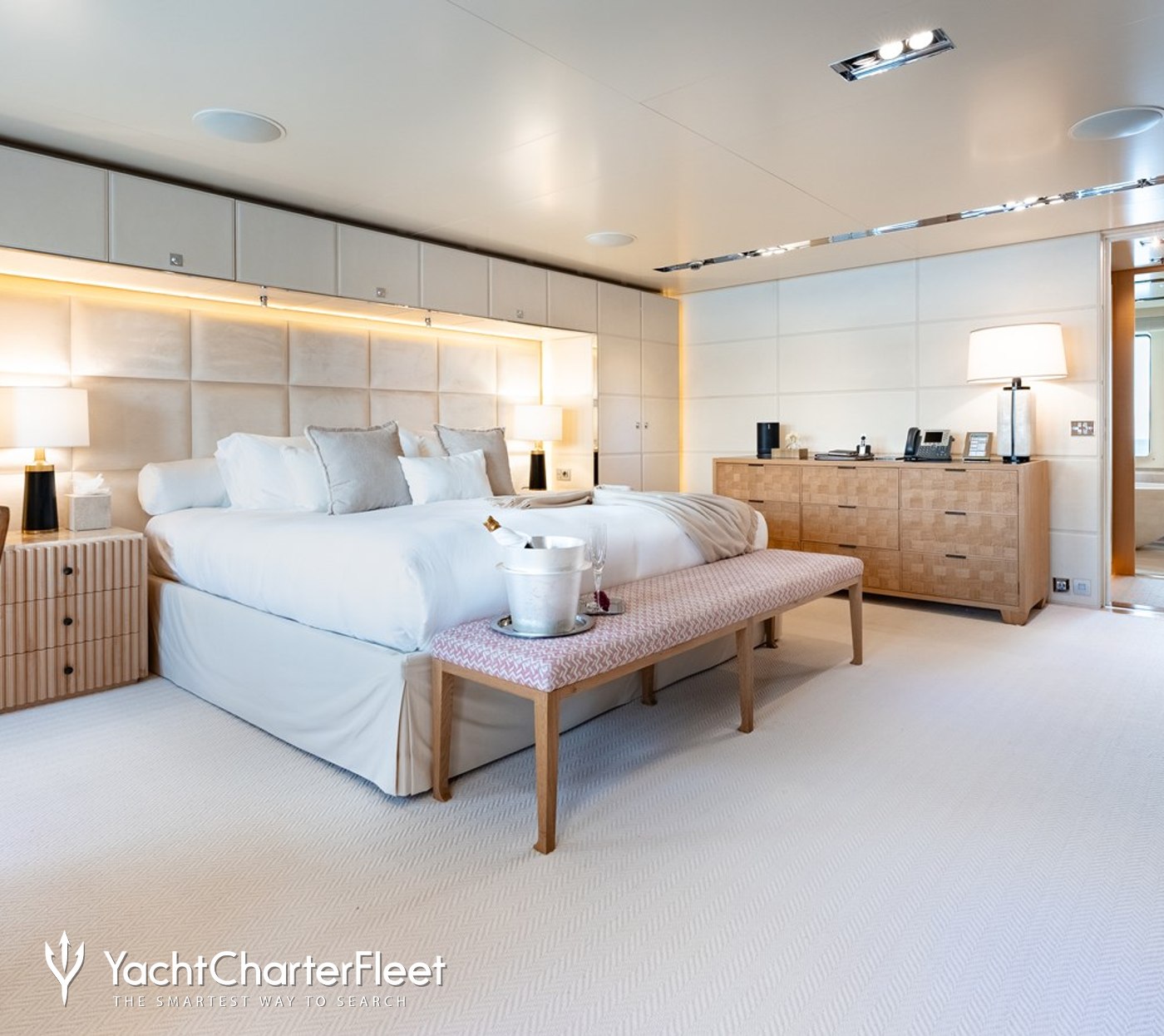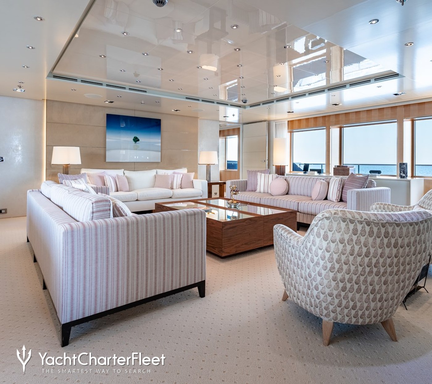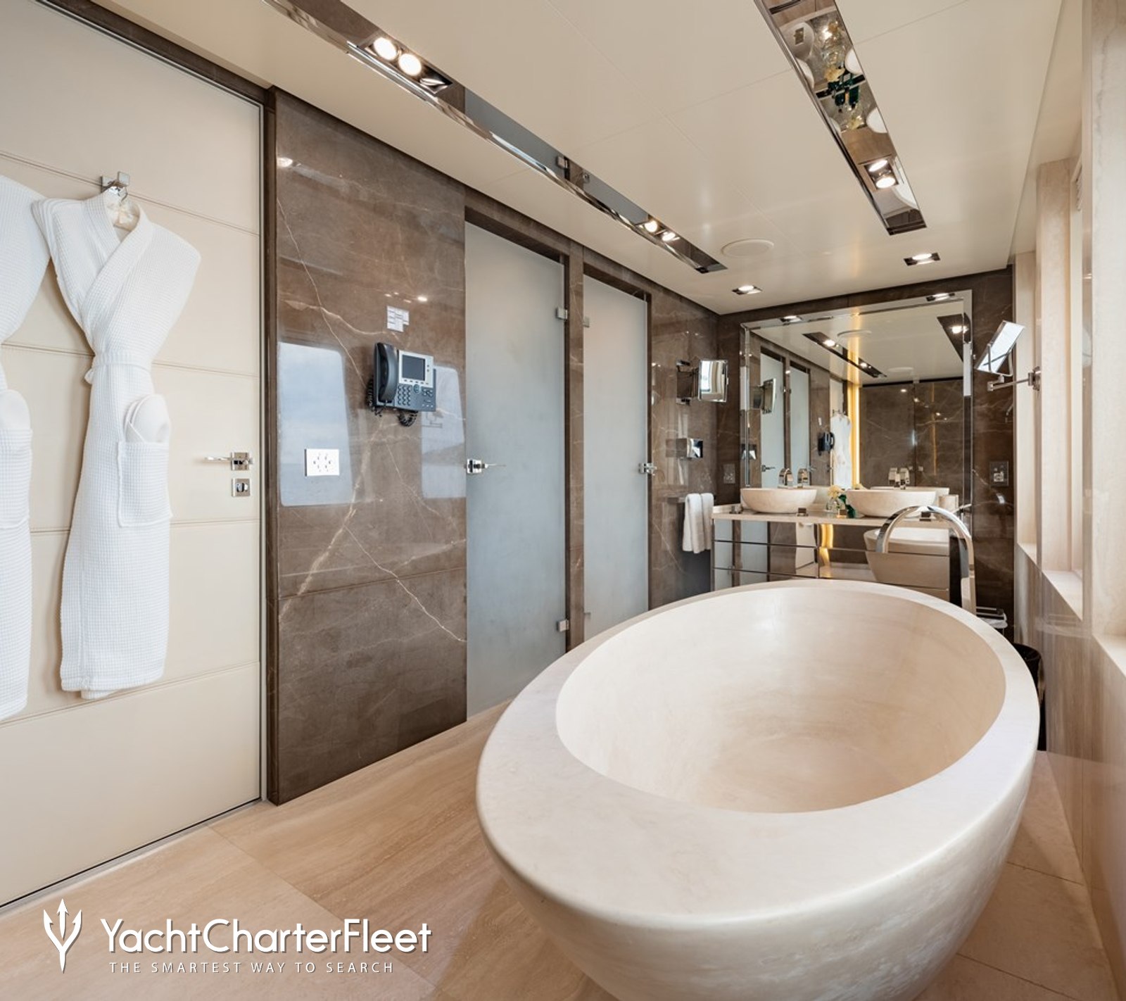 A standout feature is her retractable beach club, positioned beneath the infinity pool, providing seamless access to the sea. Combined with wide swim platforms and flexible seating arrangements, the yacht’s exterior spaces allow guests to enjoy long days on the water throughout East Mediterranean yacht charters, whether anchored off a secluded island or moored in a lively harbour.