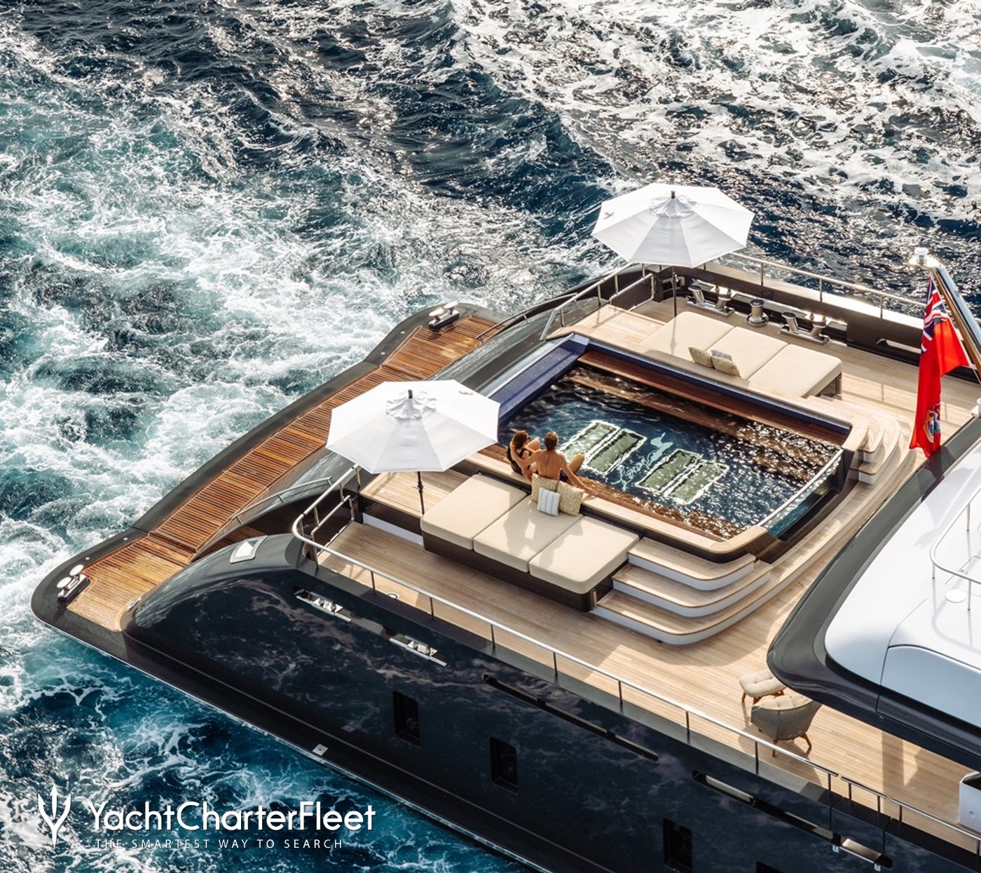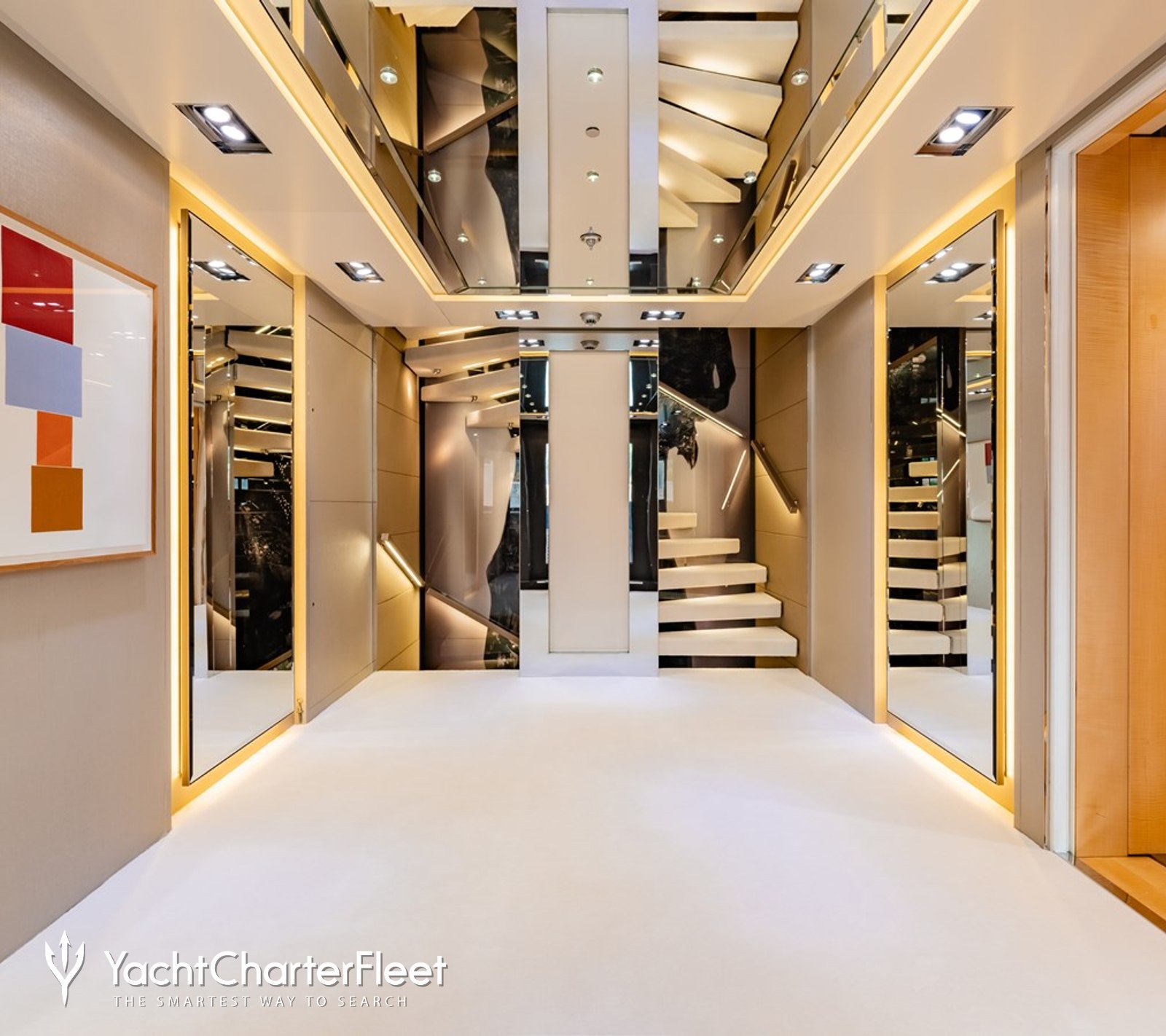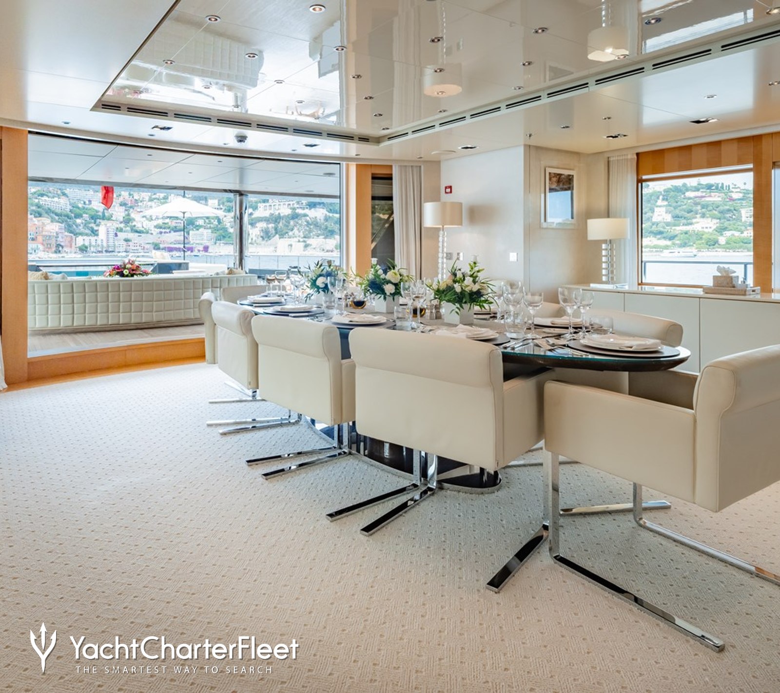 A standout feature is her retractable beach club, positioned beneath the infinity pool, providing seamless access to the sea. Combined with wide swim platforms and flexible seating arrangements, the yacht’s exterior spaces allow guests to enjoy long days on the water throughout East Mediterranean yacht charters, whether anchored off a secluded island or moored in a lively harbour.