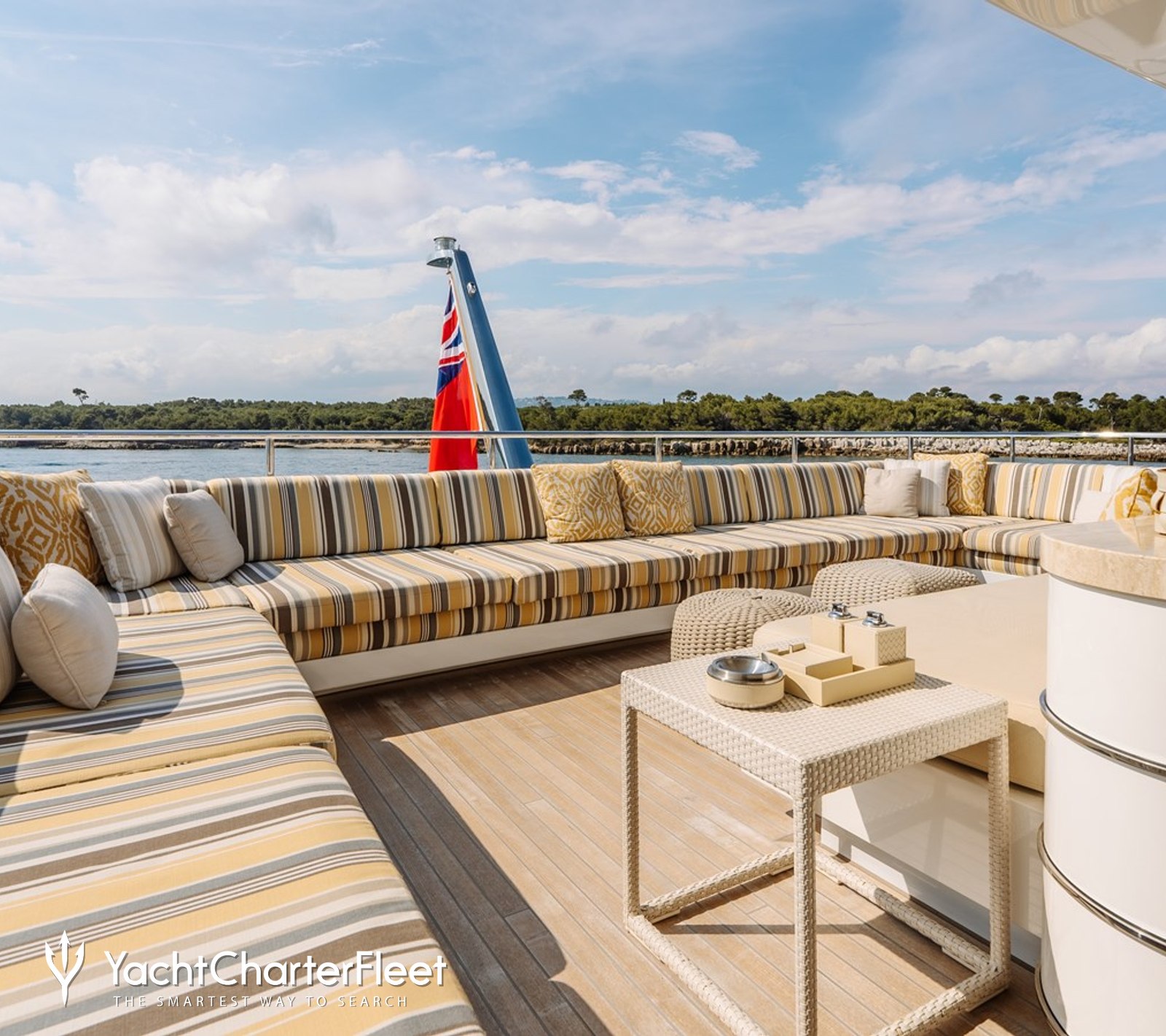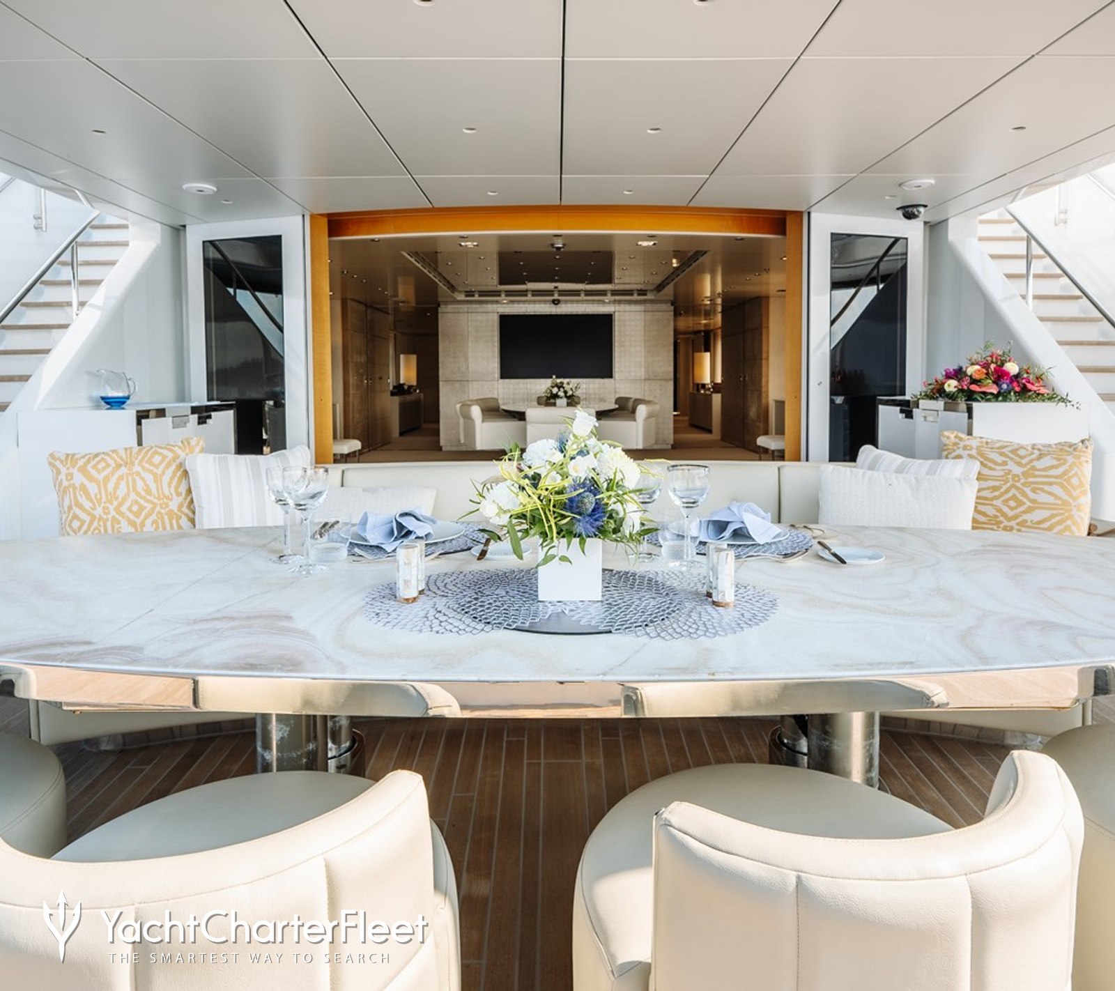 Charter yacht LOON offers expansive exterior decks arranged to support both social gatherings and quiet relaxation. Designed for effortless outdoor living, her layout includes multiple lounge areas, shaded dining spaces, and generous sunbathing zones.