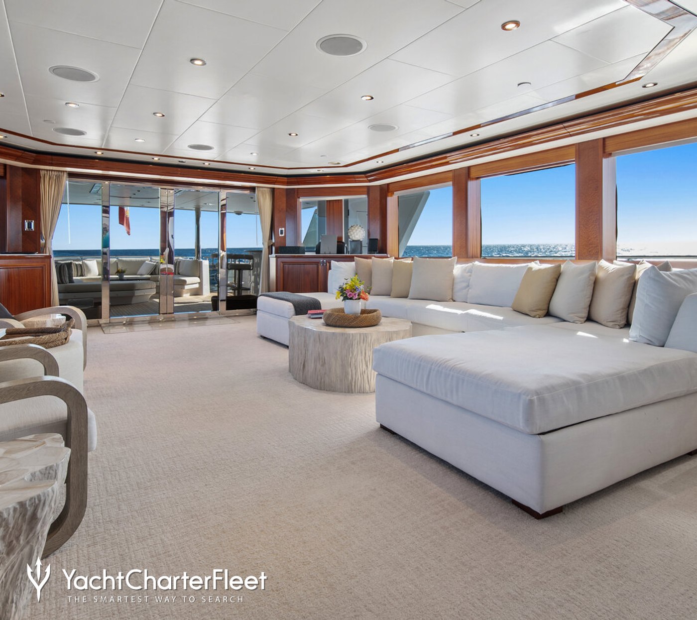 The main salon offers a welcoming social hub with plush seating and large windows that allow natural light to fill the space. Neutral tones and elegant finishes create a relaxed atmosphere where guests can gather after a day on the water.