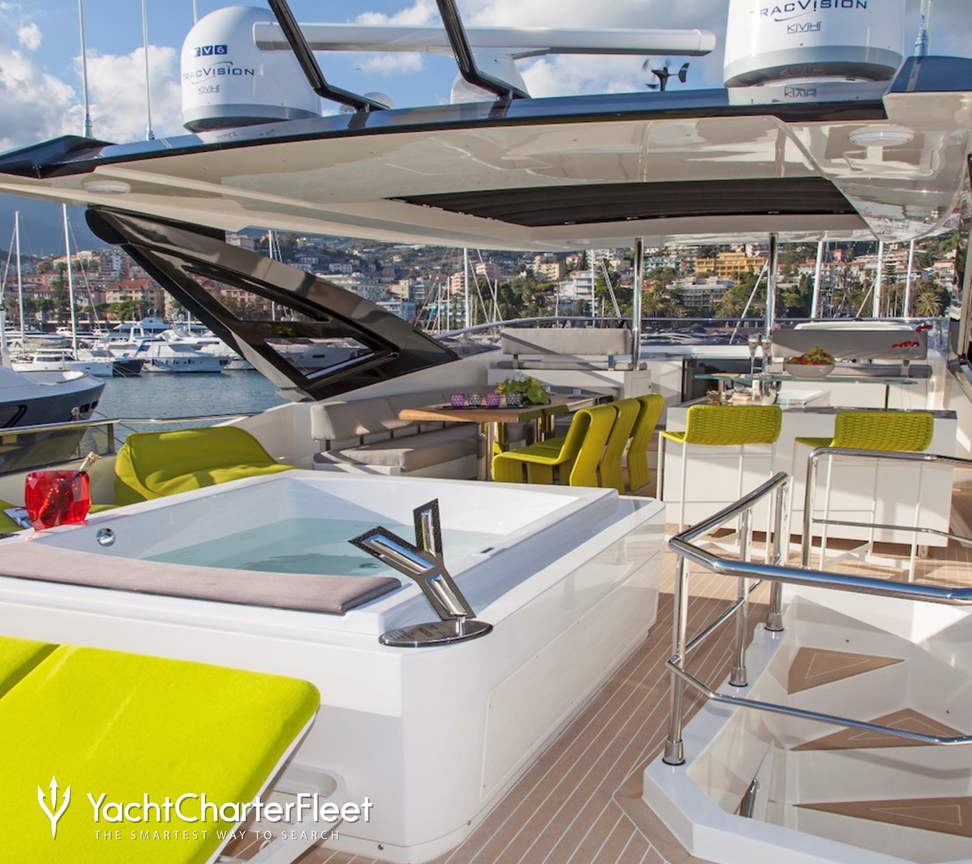 A deck Jacuzzi offers a standout place to unwind while admiring coastal views, whether anchored off Capri or cruising between destinations along popular charter routes in the West Mediterranean.