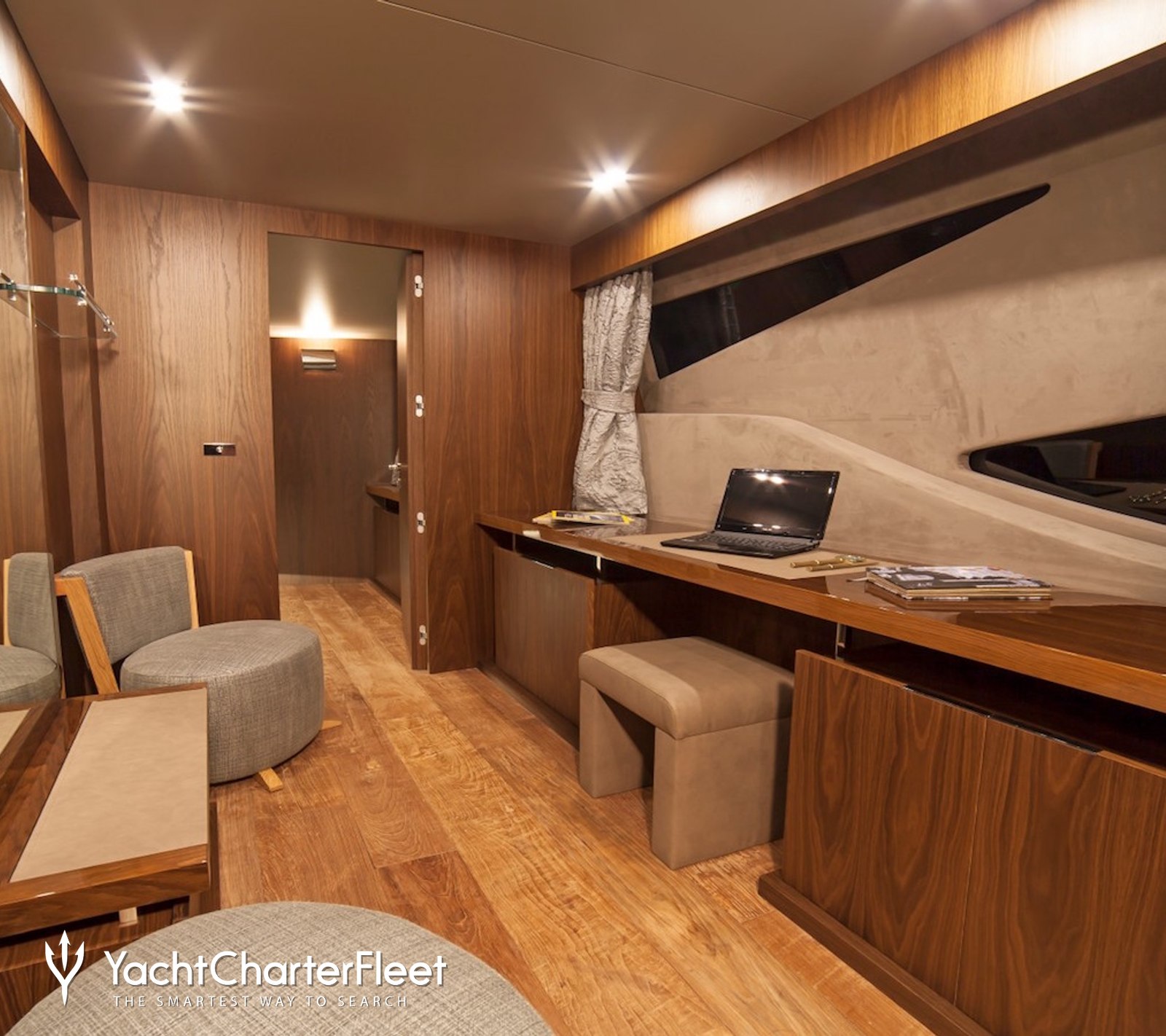 Neutral tones, light wood finishes, and large windows fill the main salon with natural light, creating an inviting space to relax between destinations.