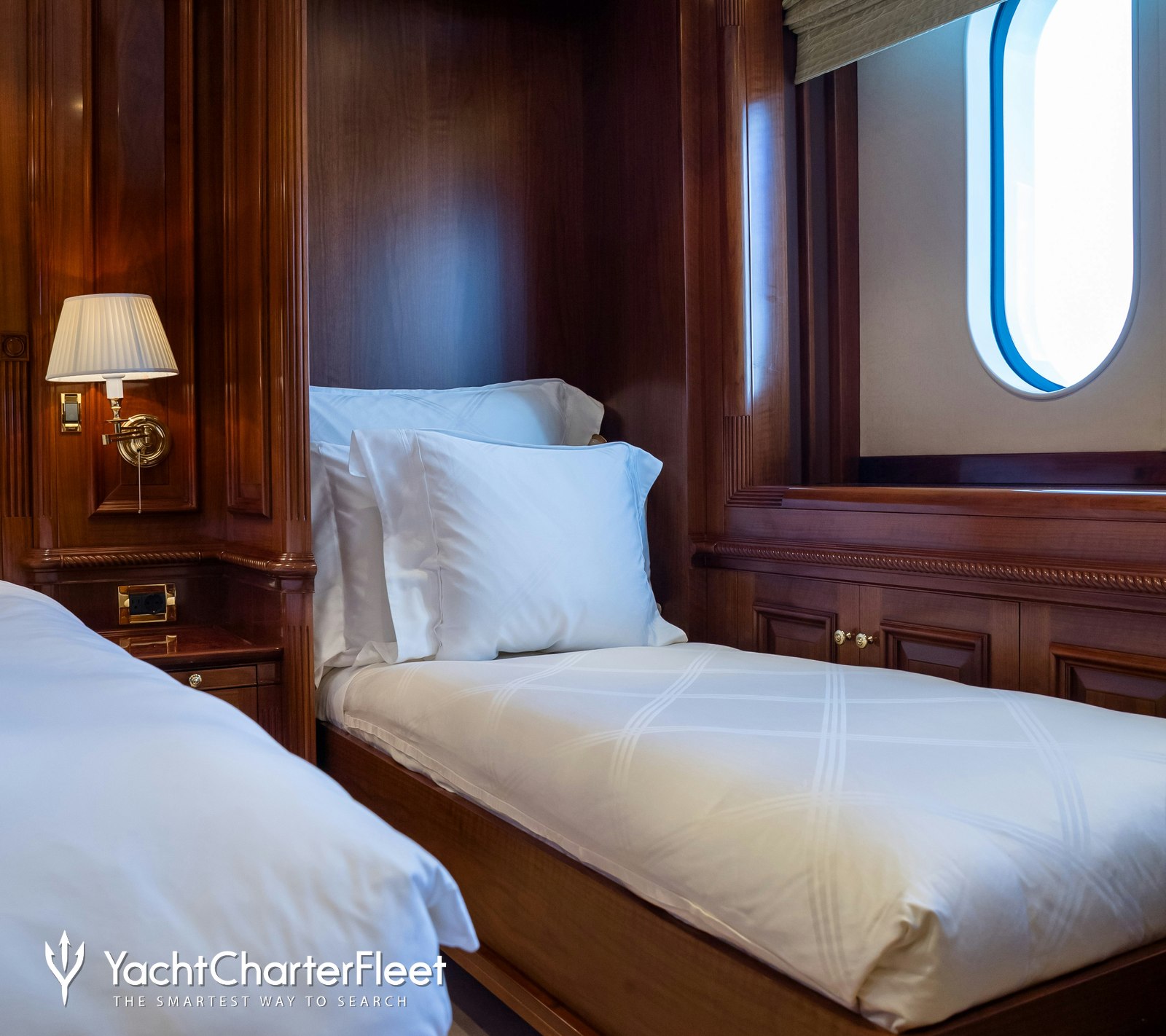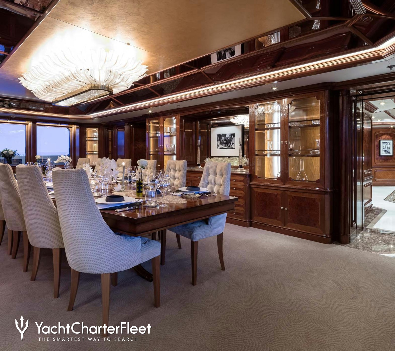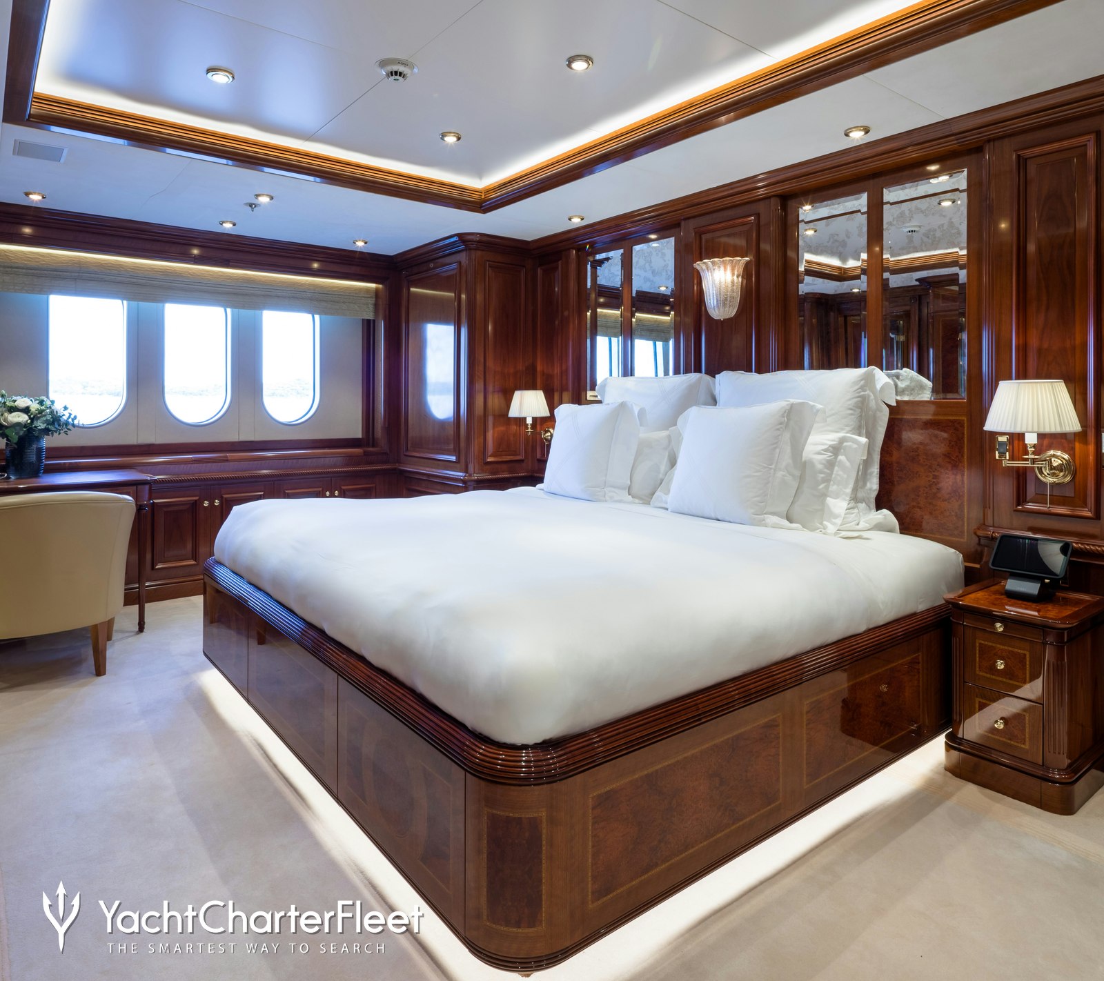 Charter yacht STARFIRE accommodates up to 12 sleeping charter guests across seven refined cabins, including a full-beam master suite complete with a private study, dressing room, and dual ensuite bathrooms.