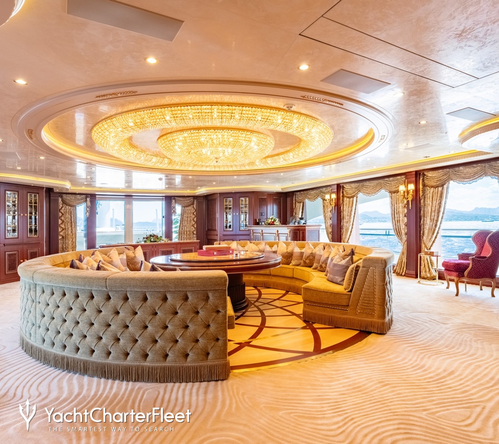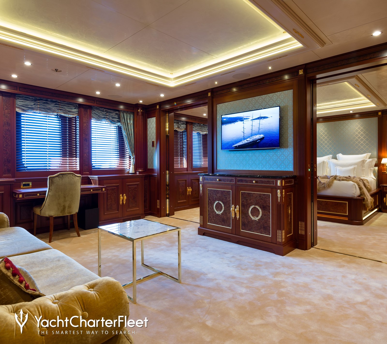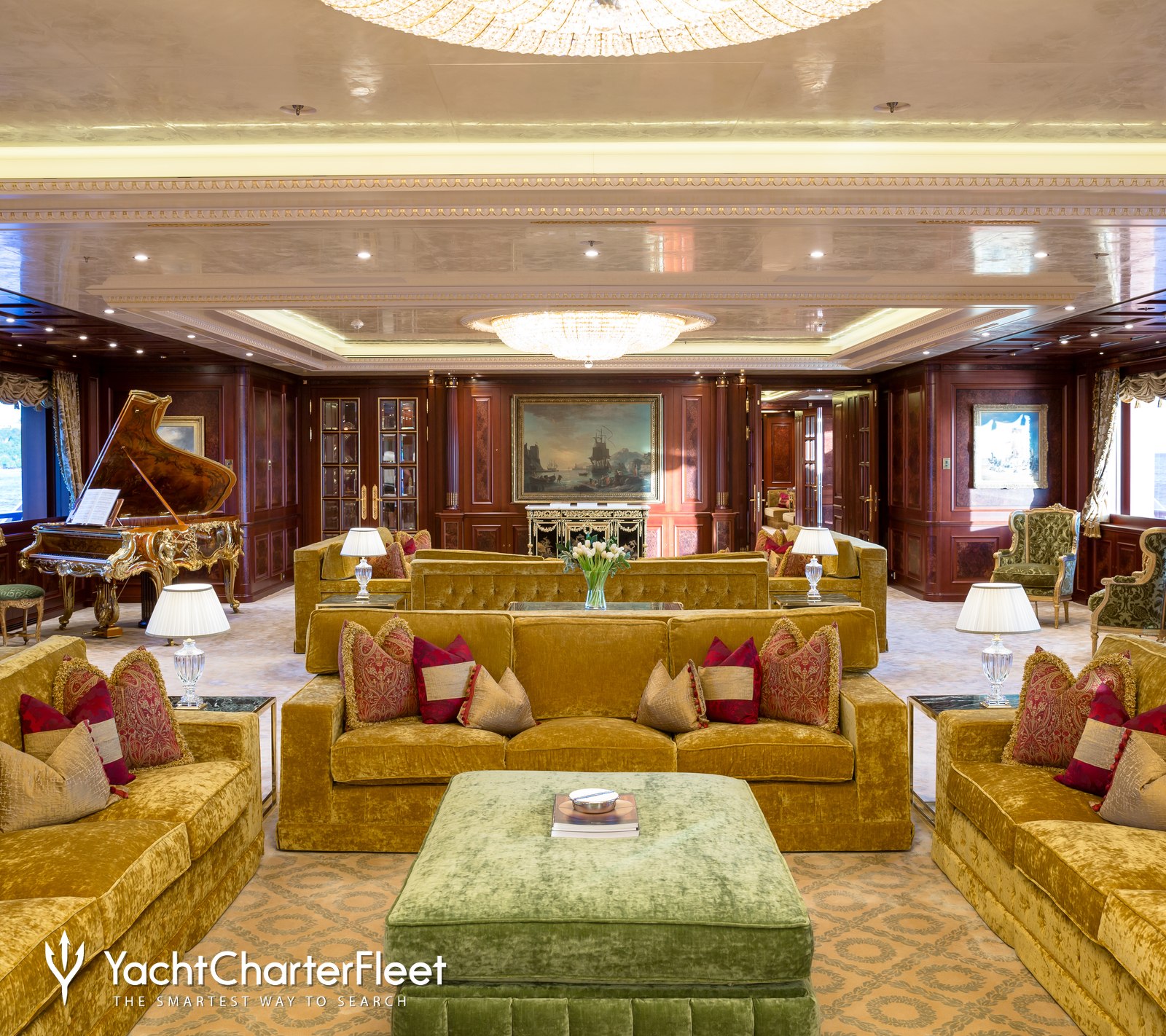 Spacious, palatial, and overflowing with character, the interior environment throughout the main salon is adorned with rich woods and deep hues, with an open-plan layout ideal for family yacht charters.