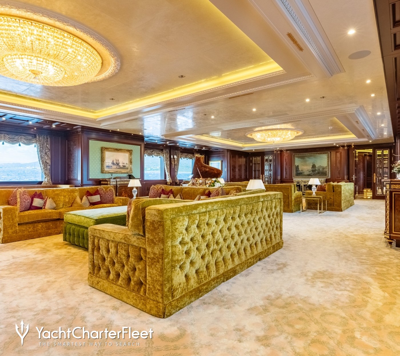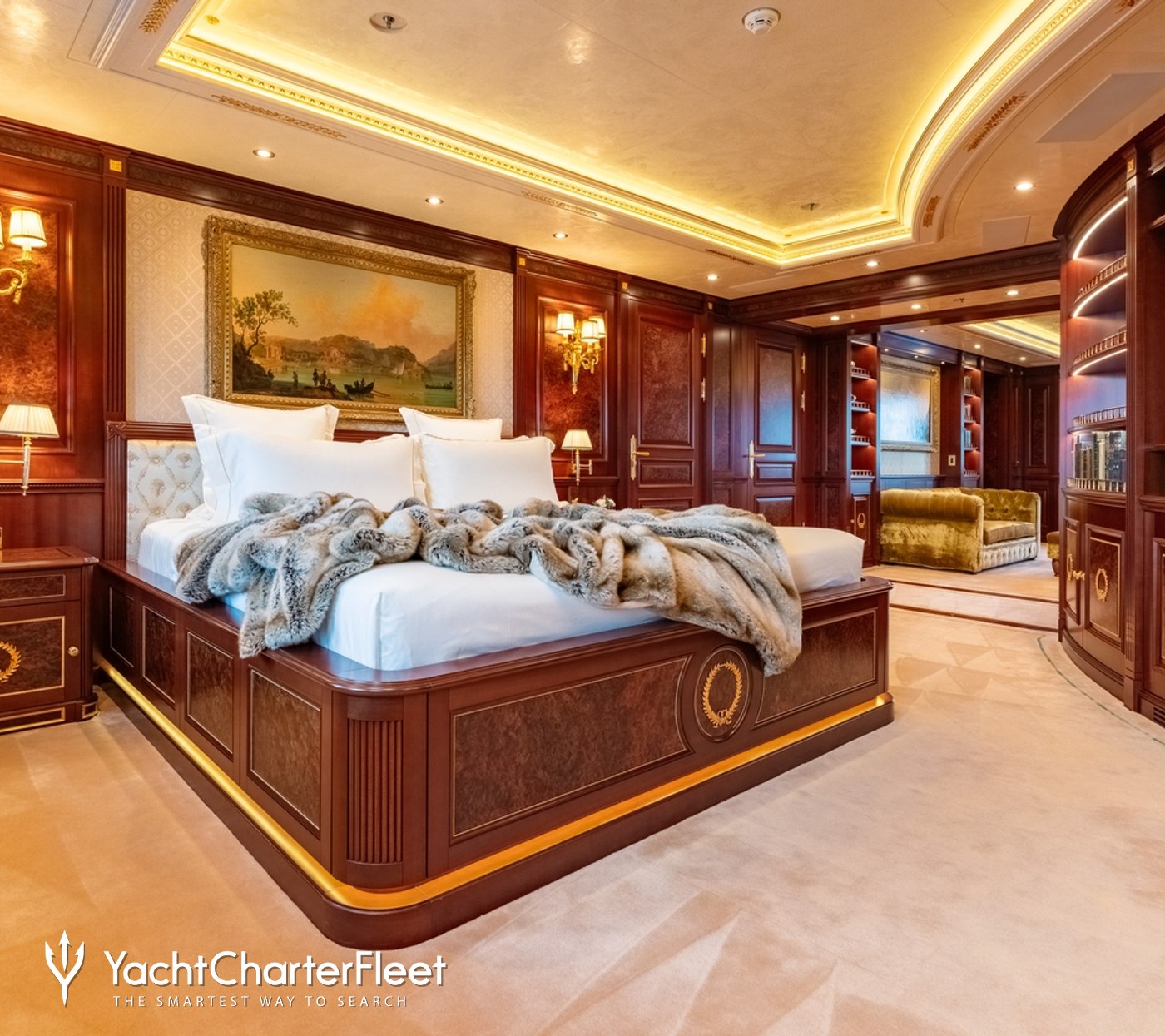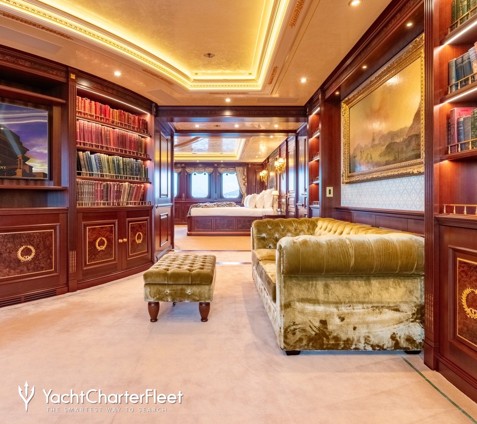 Spacious, palatial, and overflowing with character, the interior environment throughout the main salon is adorned with rich woods and deep hues, with an open-plan layout ideal for family yacht charters.