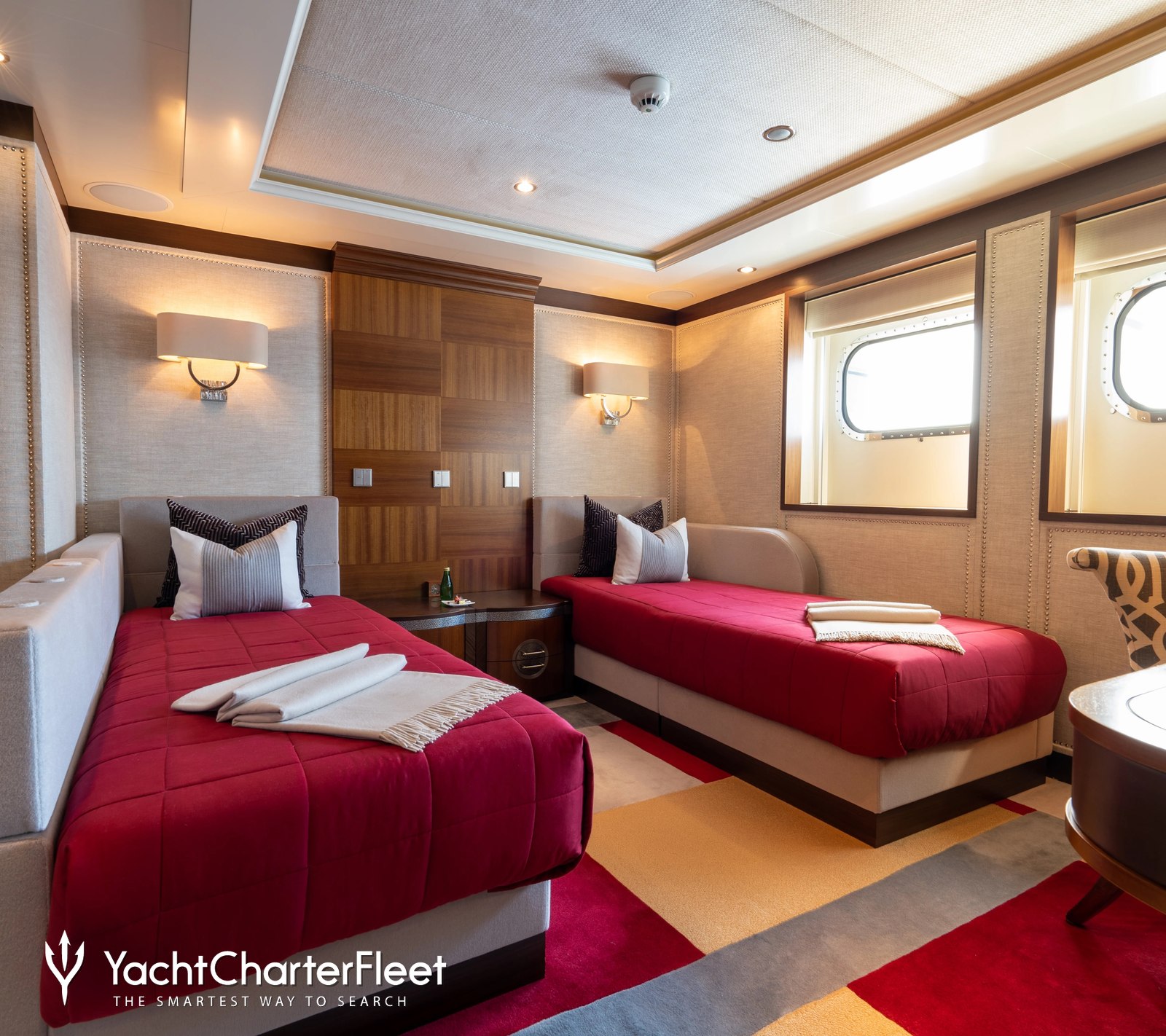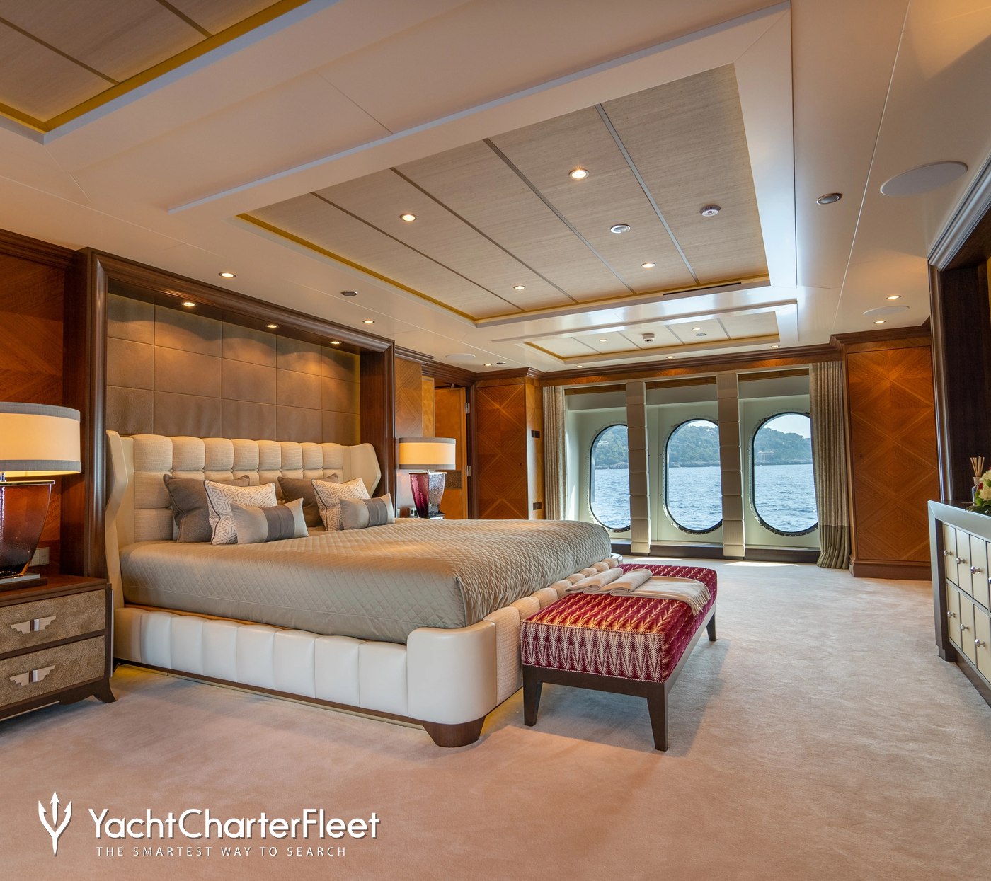 Offering a welcome retreat after long days of exploring on Mediterranean yacht charters, accommodation onboard yacht rental KAISER comprises a six-cabin layout, with the same familiar aesthetics seen throughout the social areas.