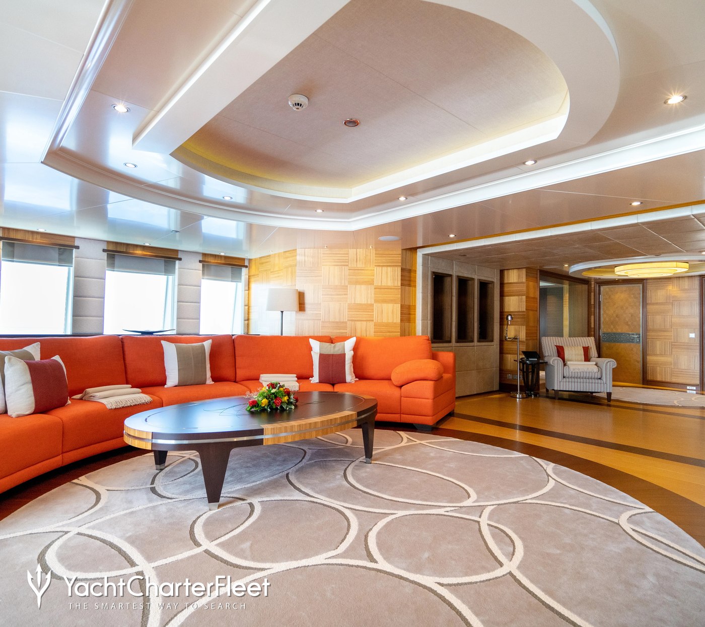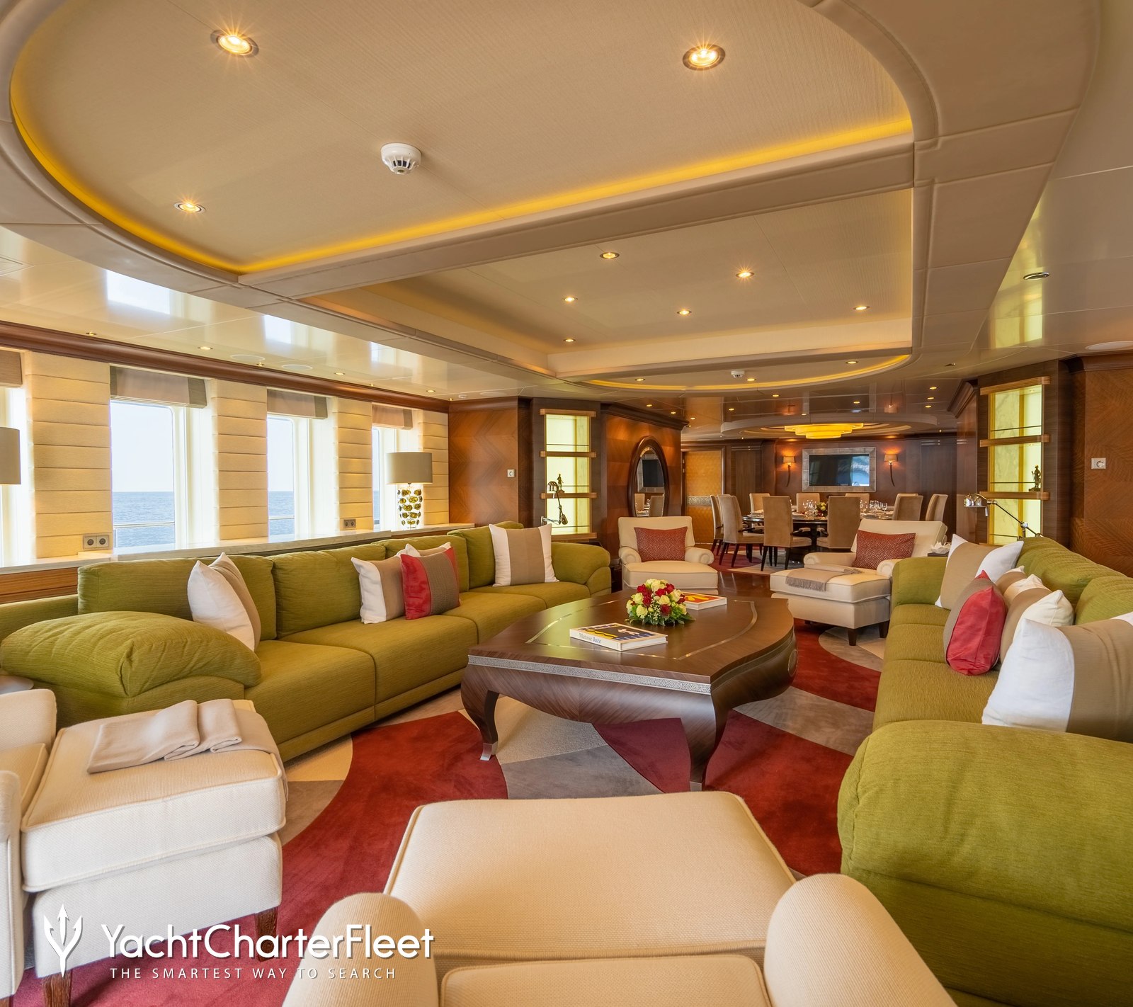 Interiors onboard motor yacht charter KAISER, penned by Bannenberg & Rowell, are dominated by vibrant yet earthy tones, with mixed hues of red, green, and cream creating continuous contrasts that exude character throughout.