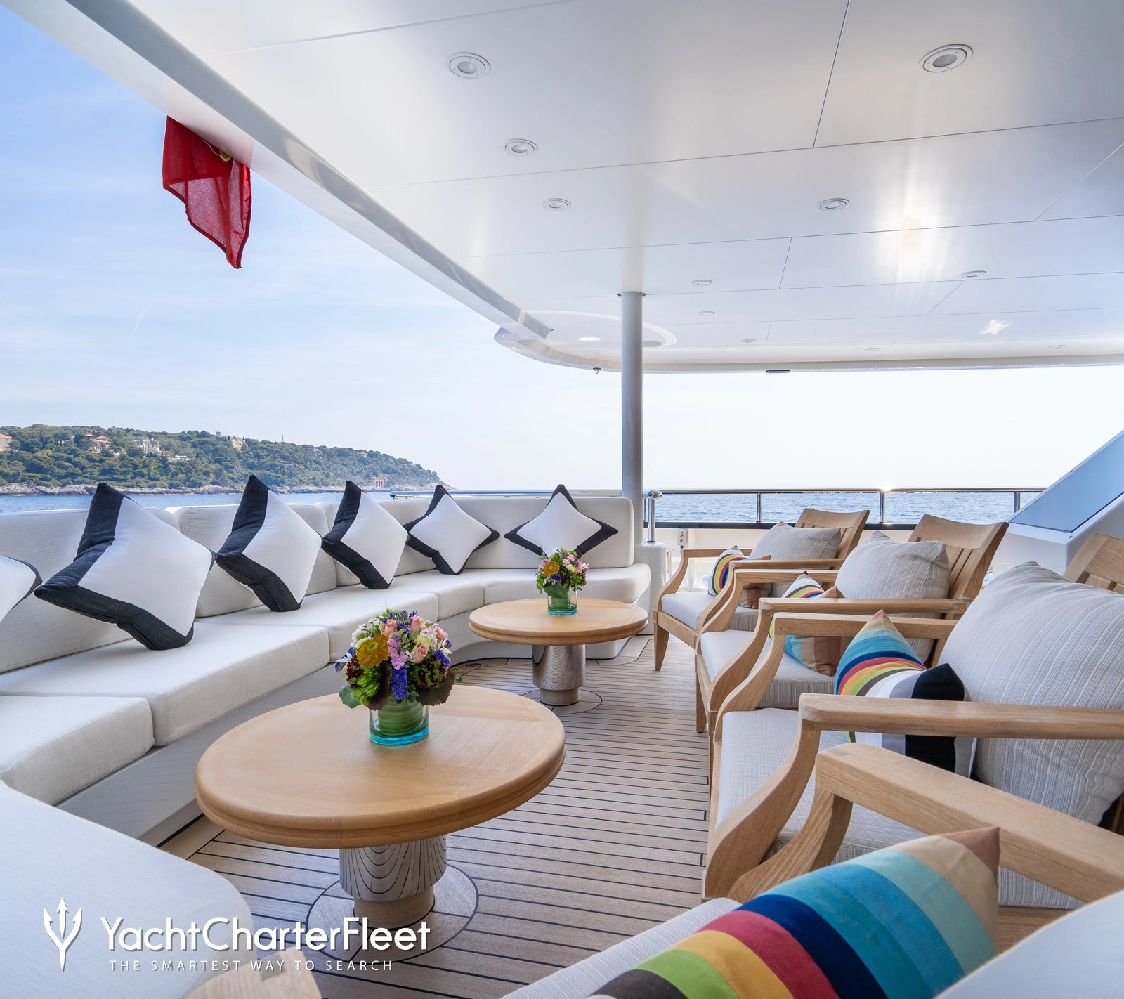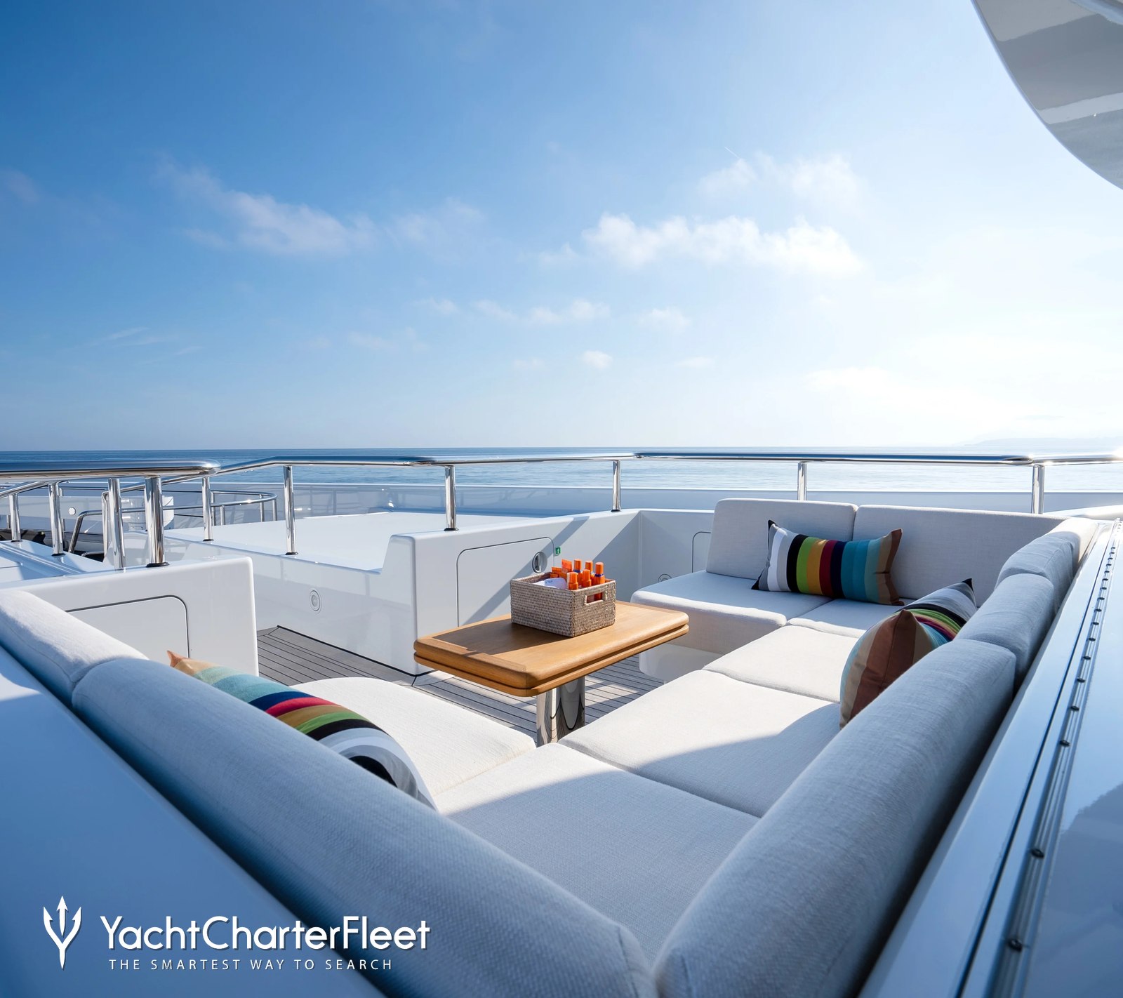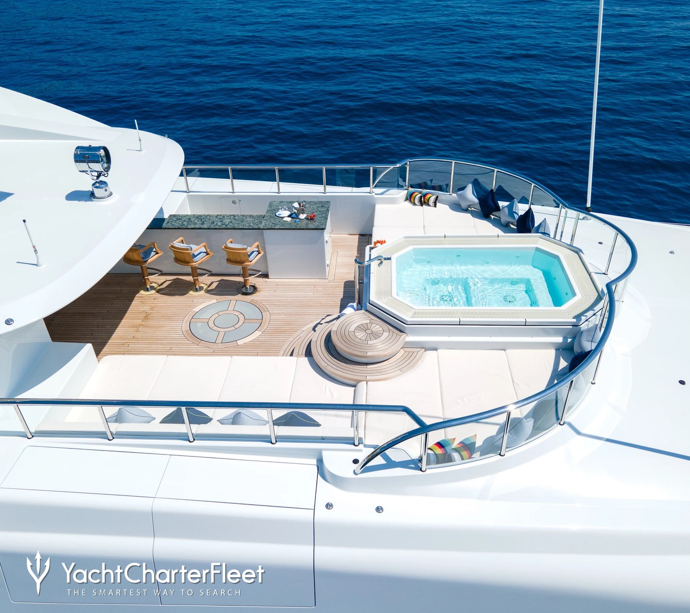 Her sun deck has a well-appointed layout for indulgent afternoons in the sun, with a deck Jacuzzi making the most of the views forward, with ample sunbathing space looking out over the stern.