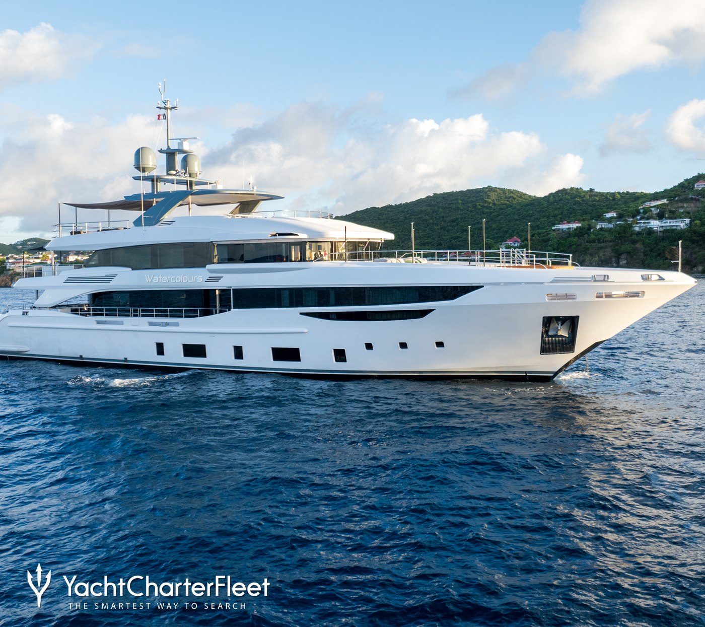 A contemporary choice for a memorable St Barts and Antigua yacht charter, 145ft (44.2m) luxury yacht rental WATERCOLOURS hosts a broad range of premium amenities for charter guests of all ages, with spacious decks for soaking up the sweeping seascapes, and all the extras you come to expect from a Benetti charter yacht.