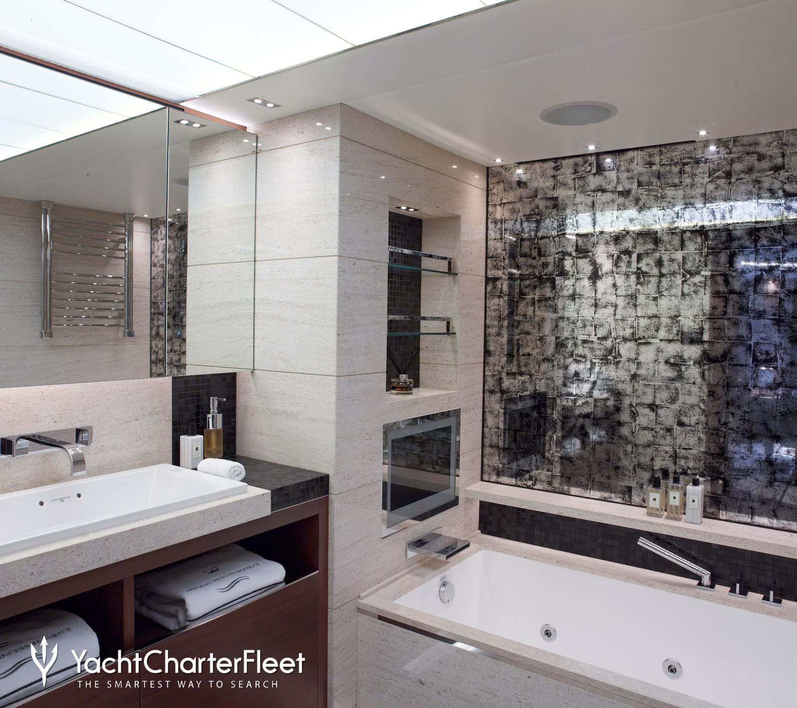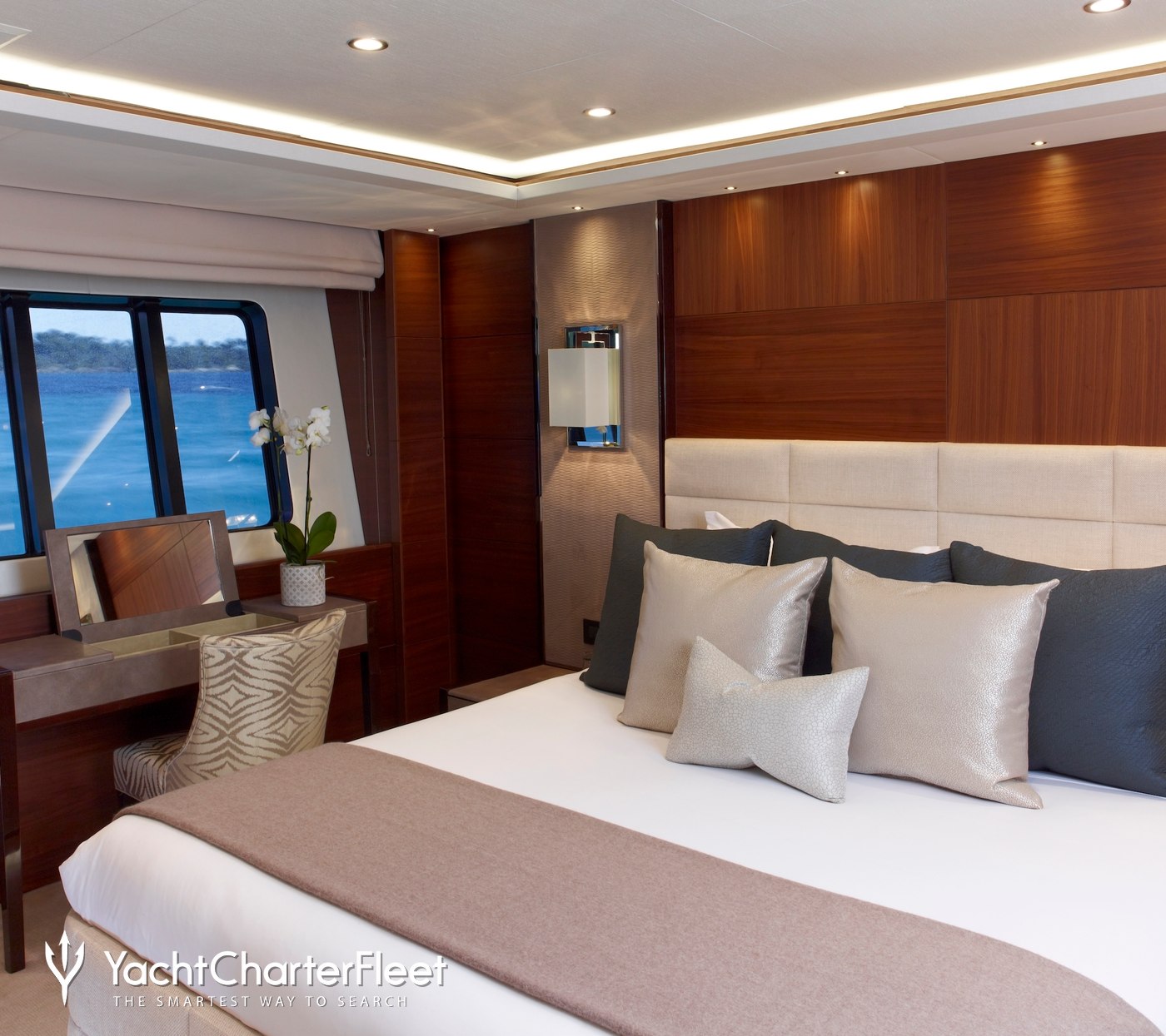The overnight area layout onboard includes a full-beam master with a dressing room and his-and-her ensuite, two VIP cabins, and a pair of twin cabins.