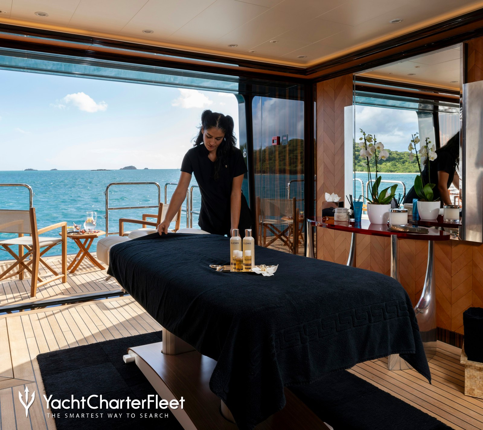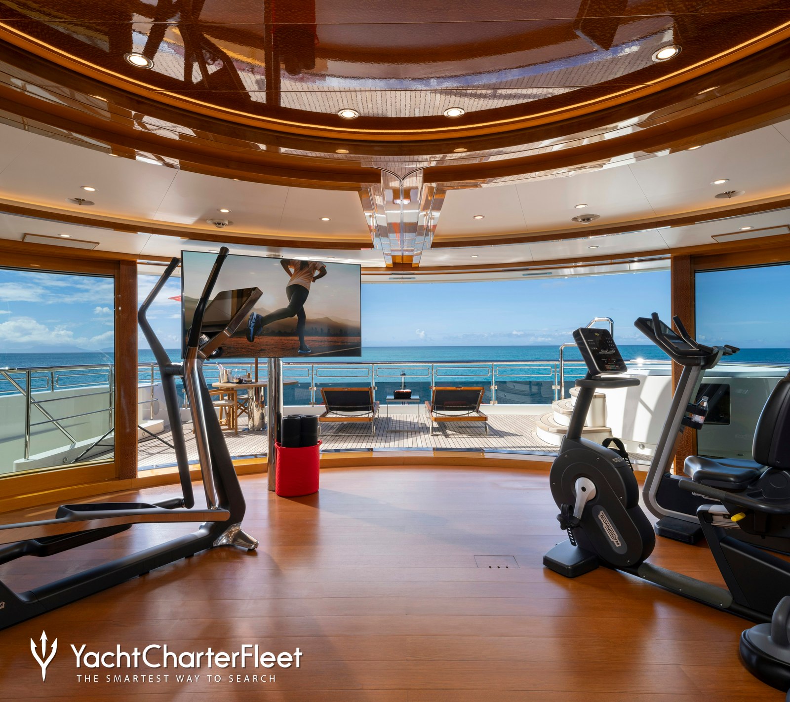Stand-out interior amenities include a fully equipped gym, beauty and hair salon, elevator access between decks, and seamless Wi-Fi connectivity throughout.