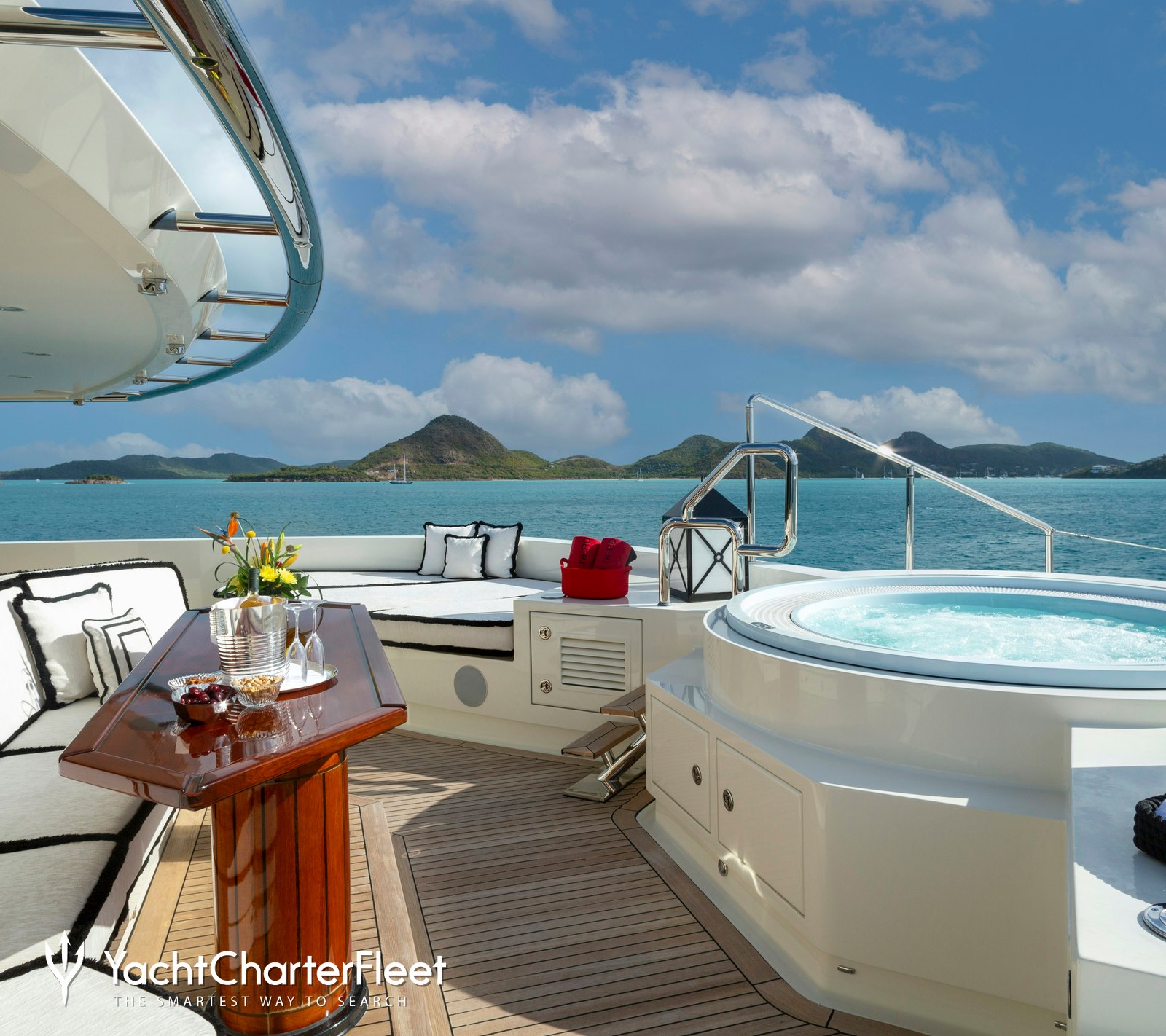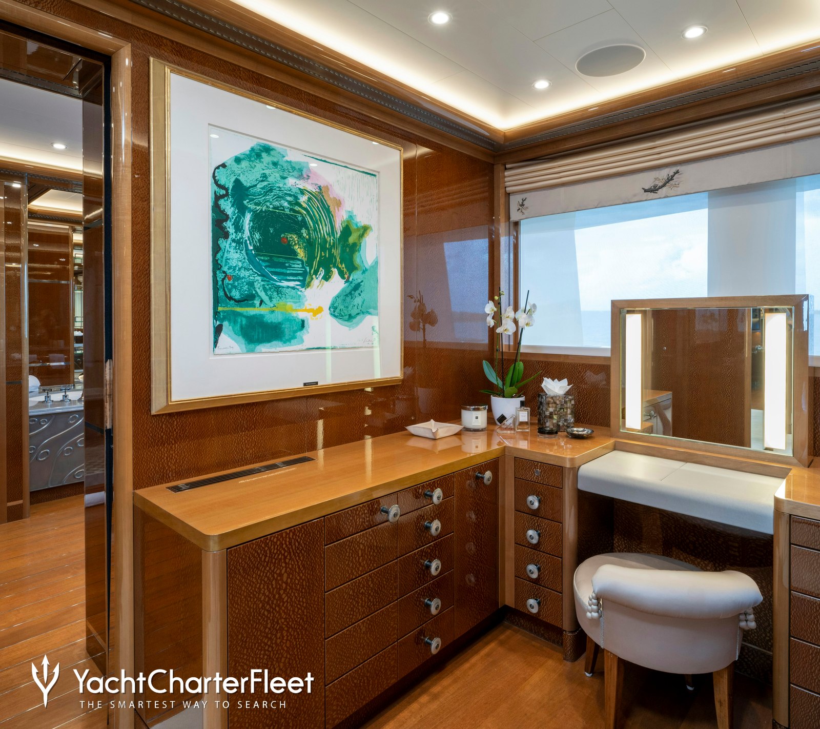 The master cabin is particularly impressive, offering generous proportions, a plush seating area, and direct access to a private exterior deck complete with a Jacuzzi, a rare and highly desirable feature for primary charter guests. Additional guest cabins include a mix of doubles and twins, all finished to the same high standard for peaceful retreats on Mediterranean or Caribbean yacht charters.
