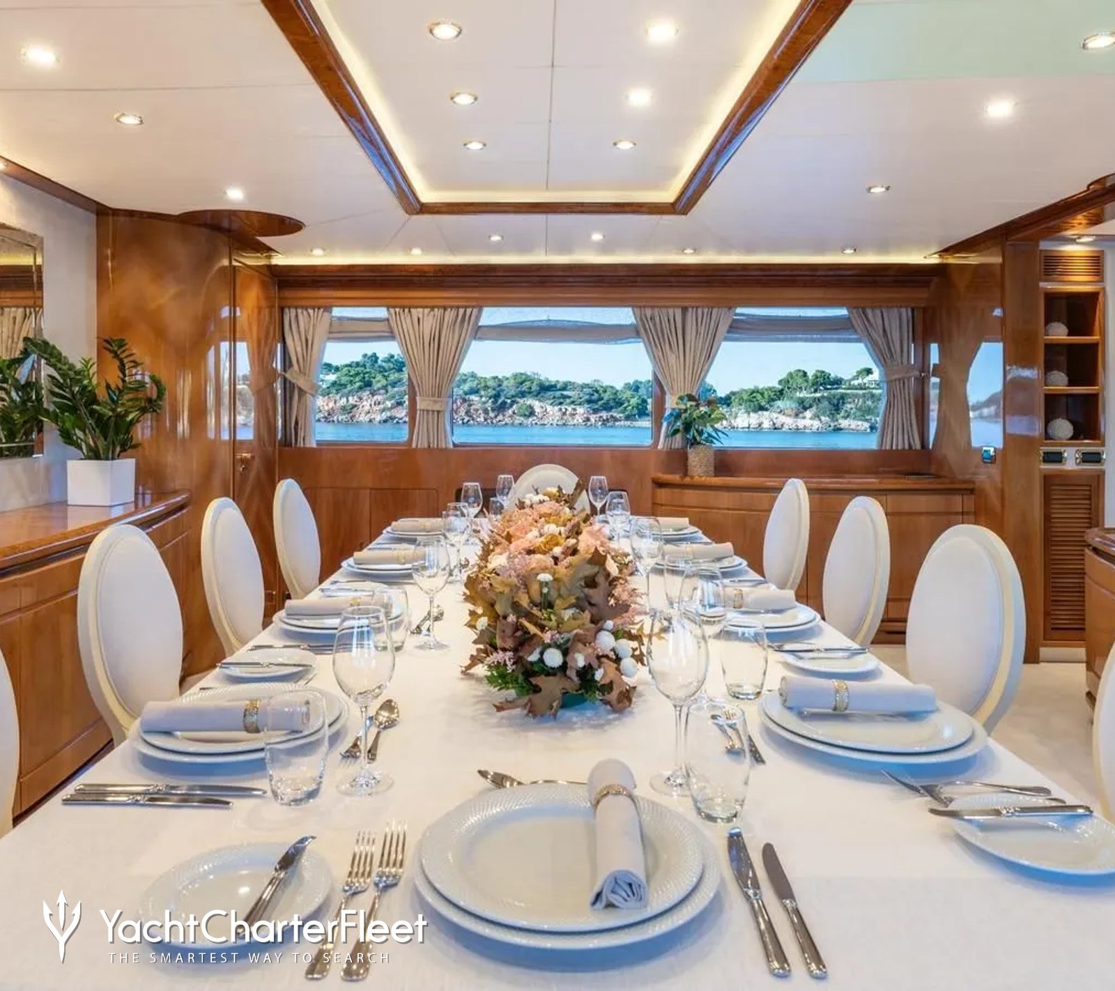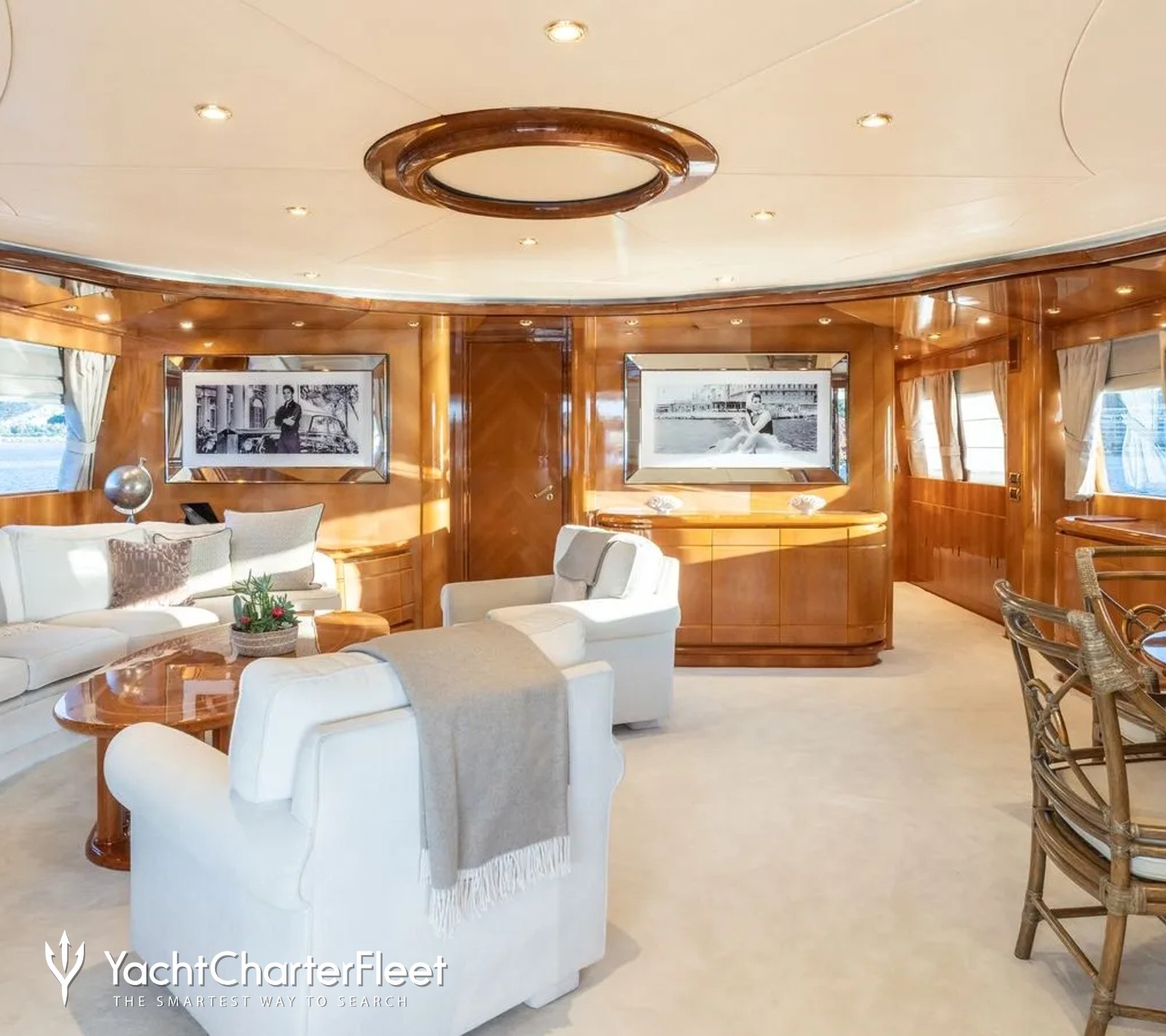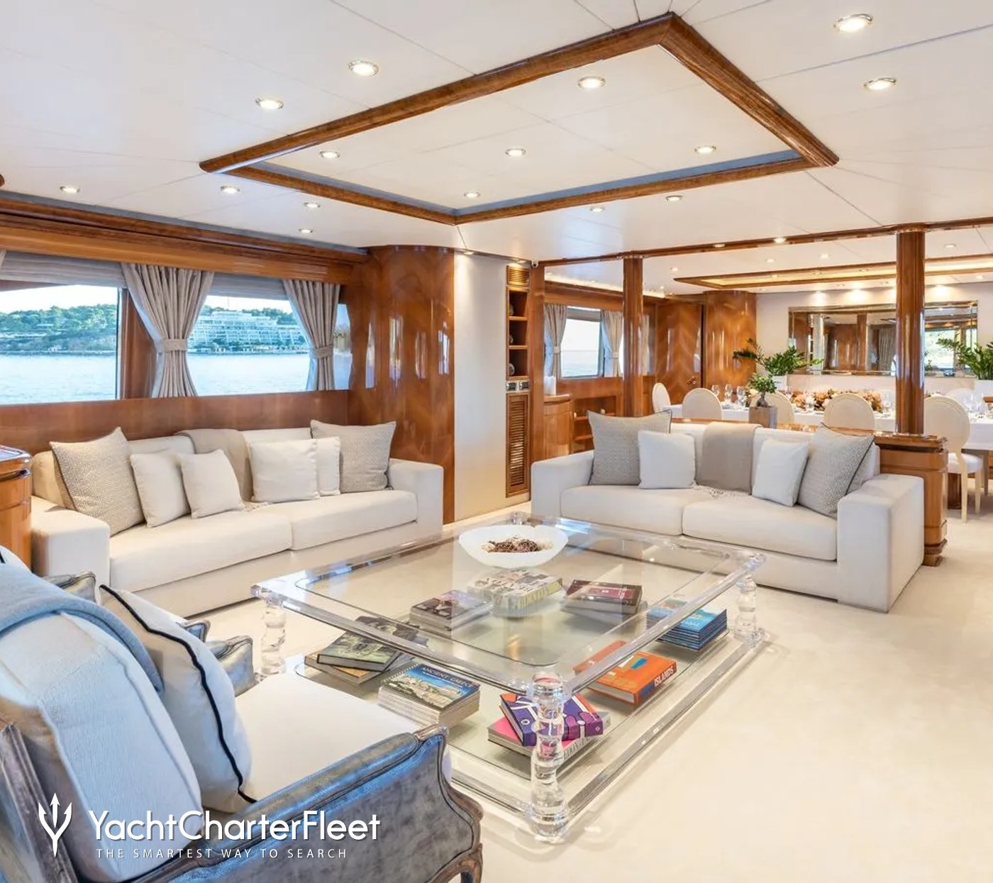 Inside, Mondo Marine charter yacht LADY G II offers a calm and inviting atmosphere designed for extended time onboard. Large windows bring natural light into the main salon, creating a bright social space where guests can gather for conversation, dining, or evening entertainment.