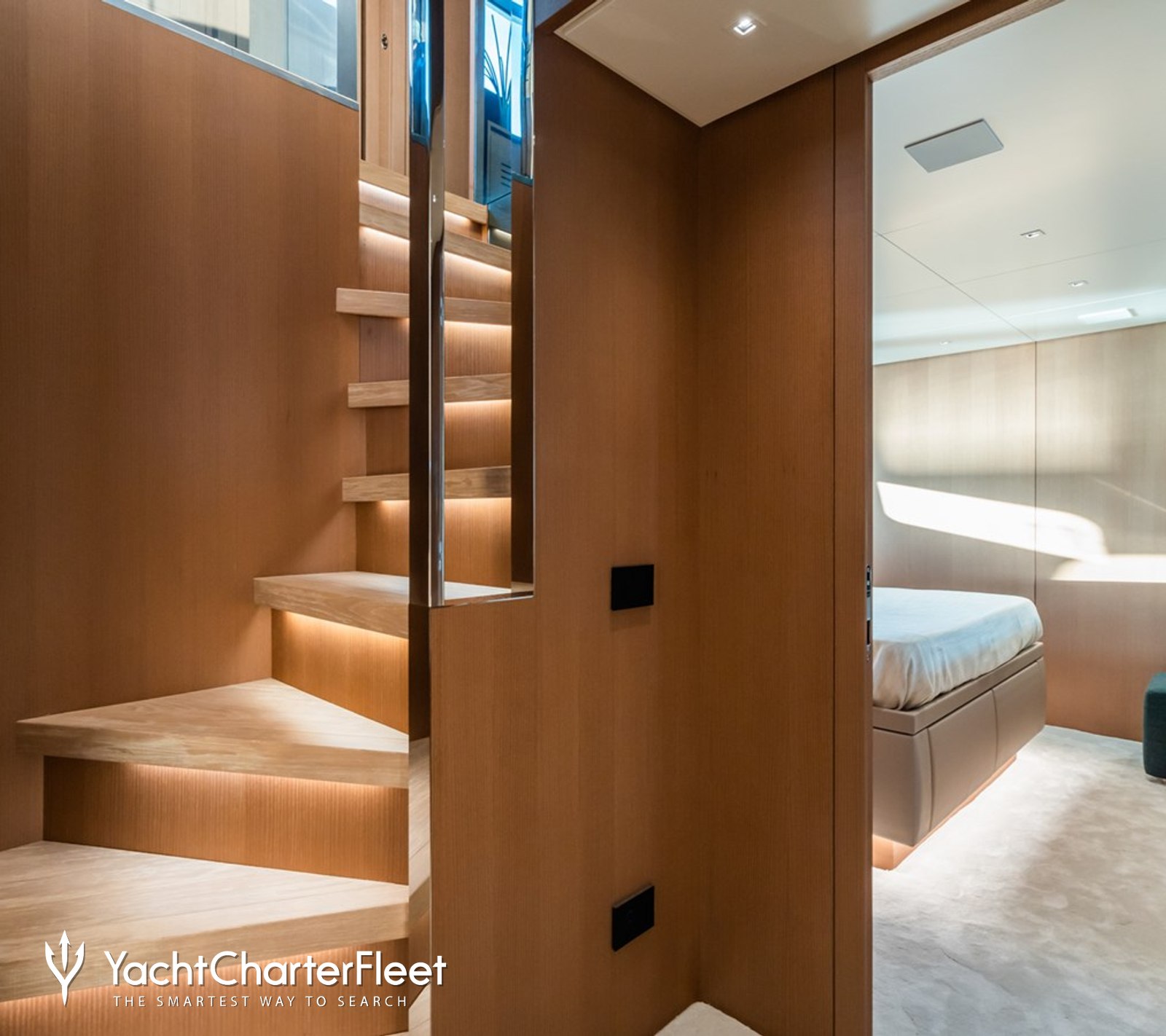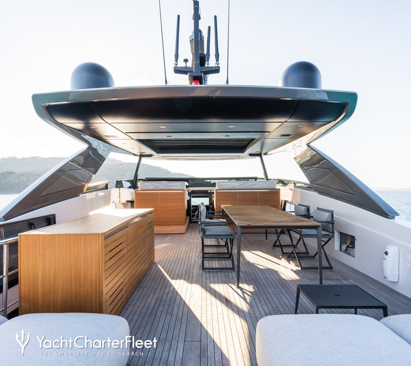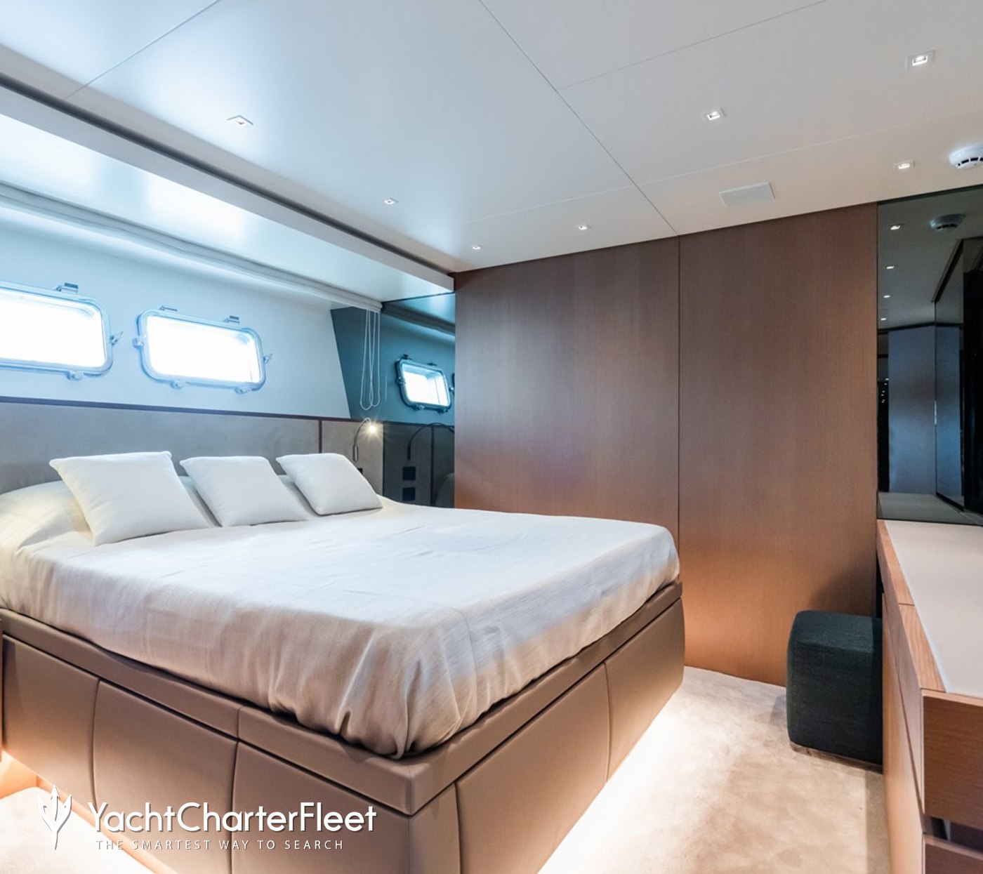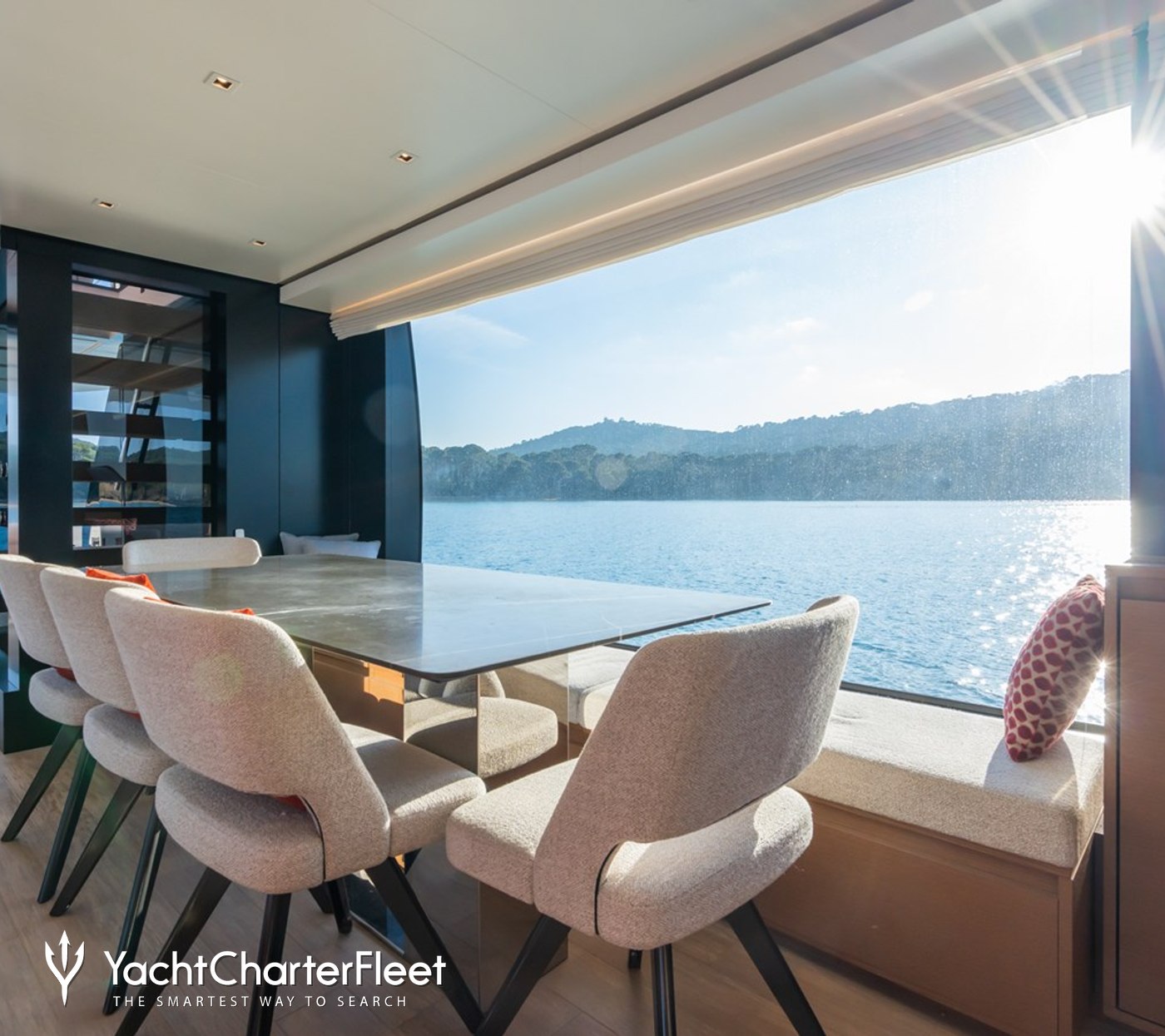 Interior styling by Zuccon reflects the contemporary design language often associated with Sanlorenzo SL90 Asymmetric charter yachts, with clean lines, balanced proportions, and a calm color palette that complements the surrounding seascape.