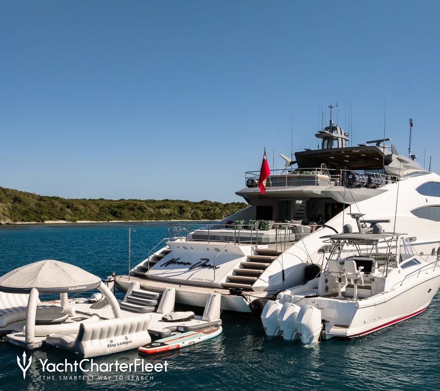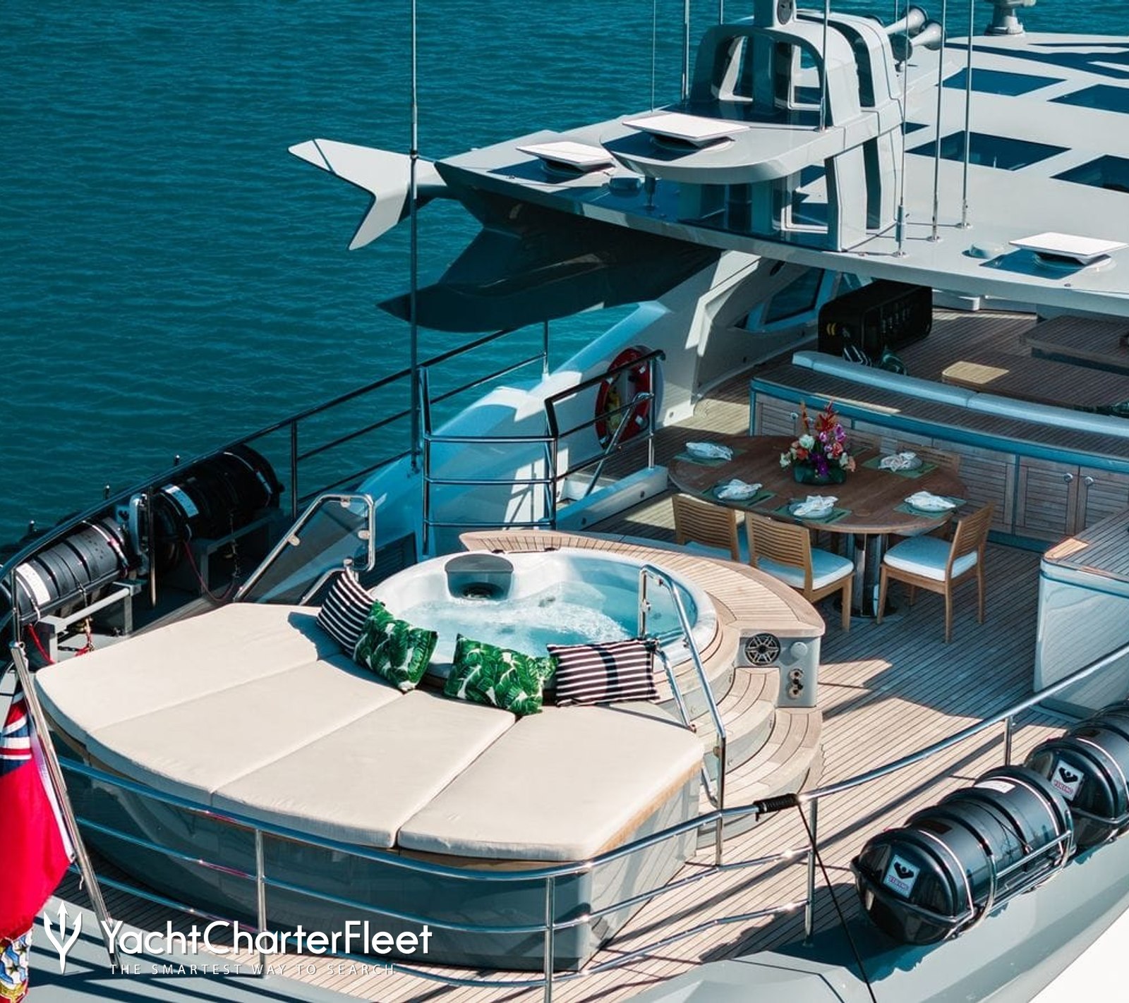 The addition of a deck Jacuzzi enhances time spent on board, offering a place to unwind while taking in coastal views. With a shallow draft of just 1.77m, the yacht is also well-equipped to access secluded bays and anchorages that are often out of reach for larger motor yacht charters.