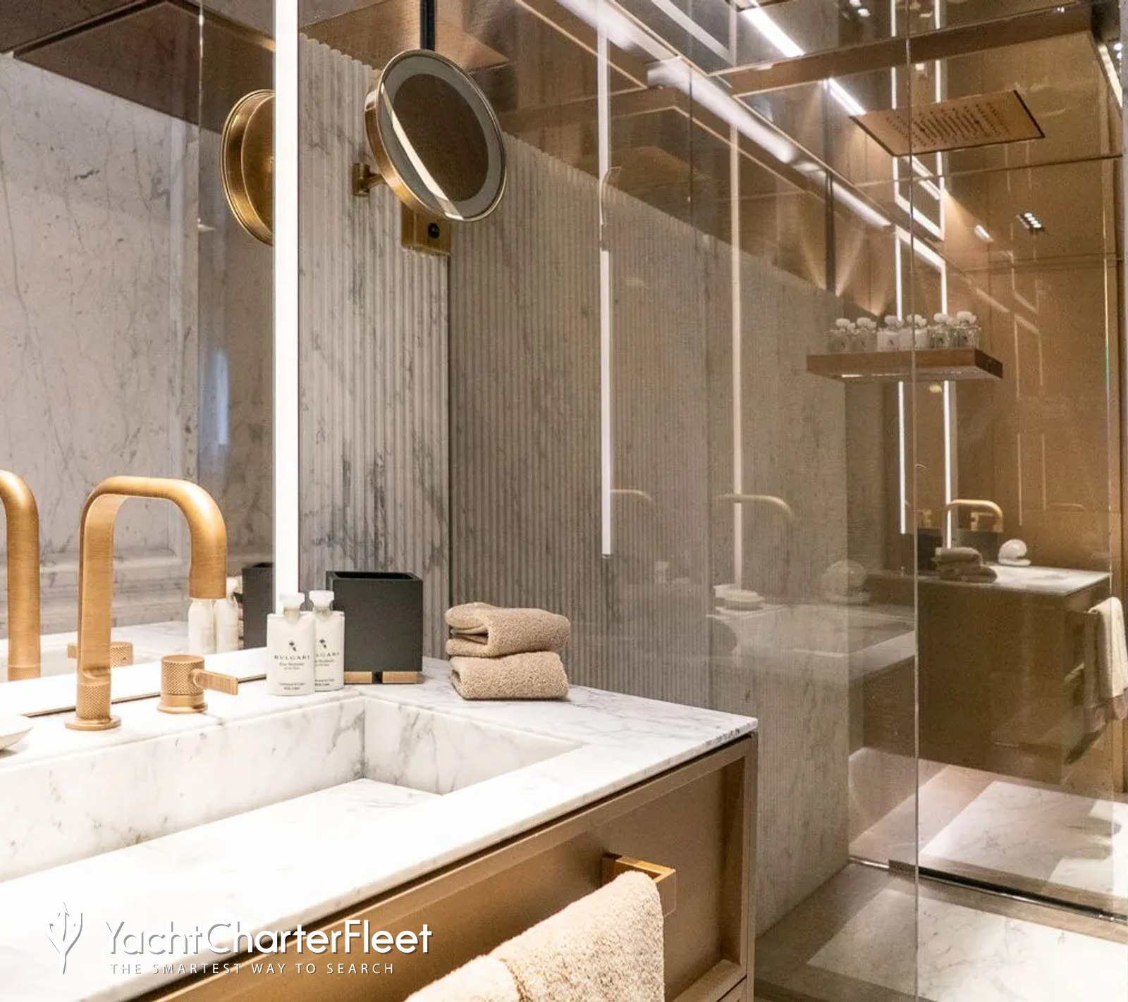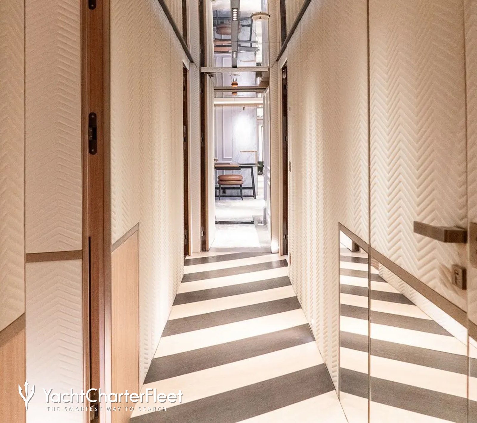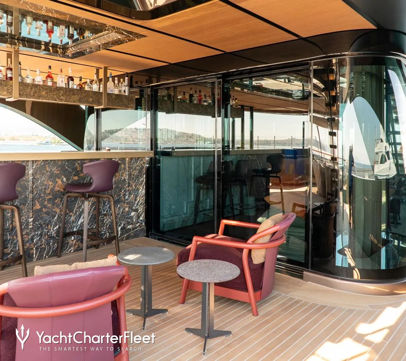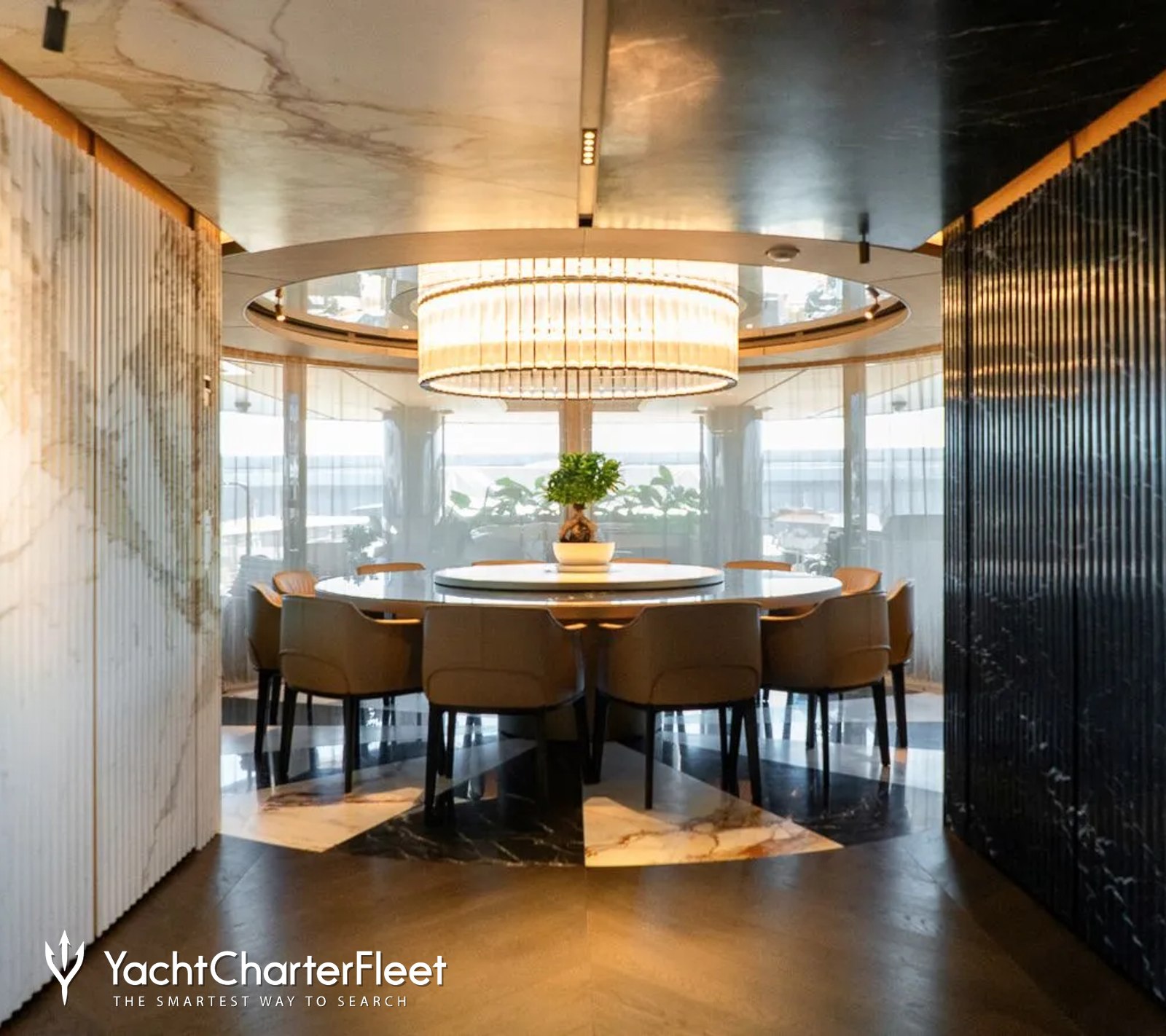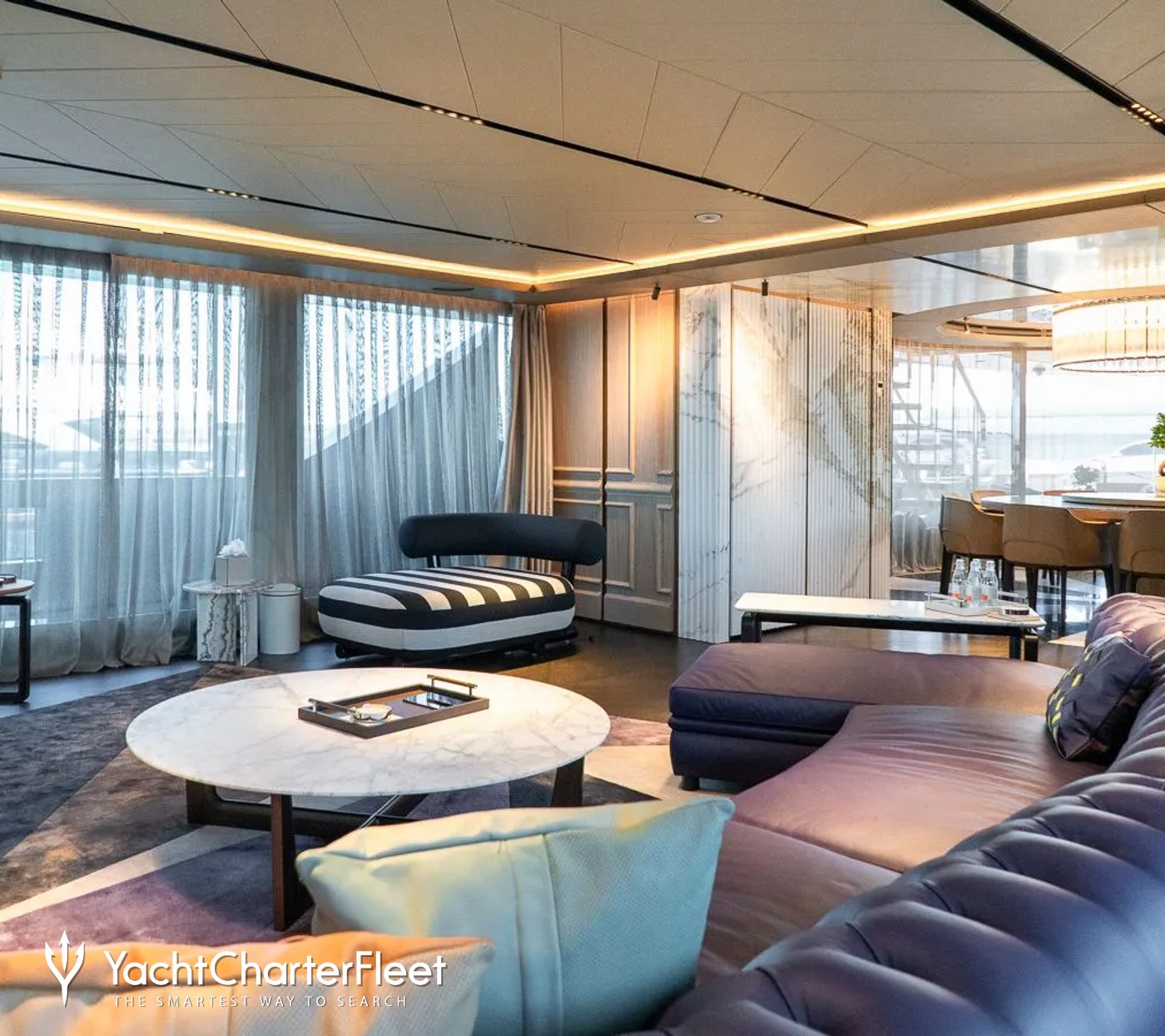 Sporting rich hues and an open-plan layout, she's an ideal match for family yacht charters, with Wi-Fi connectivity for streaming the latest films and keeping in touch with loved ones, plus an intimate dining area and comfortable lounge spaces.