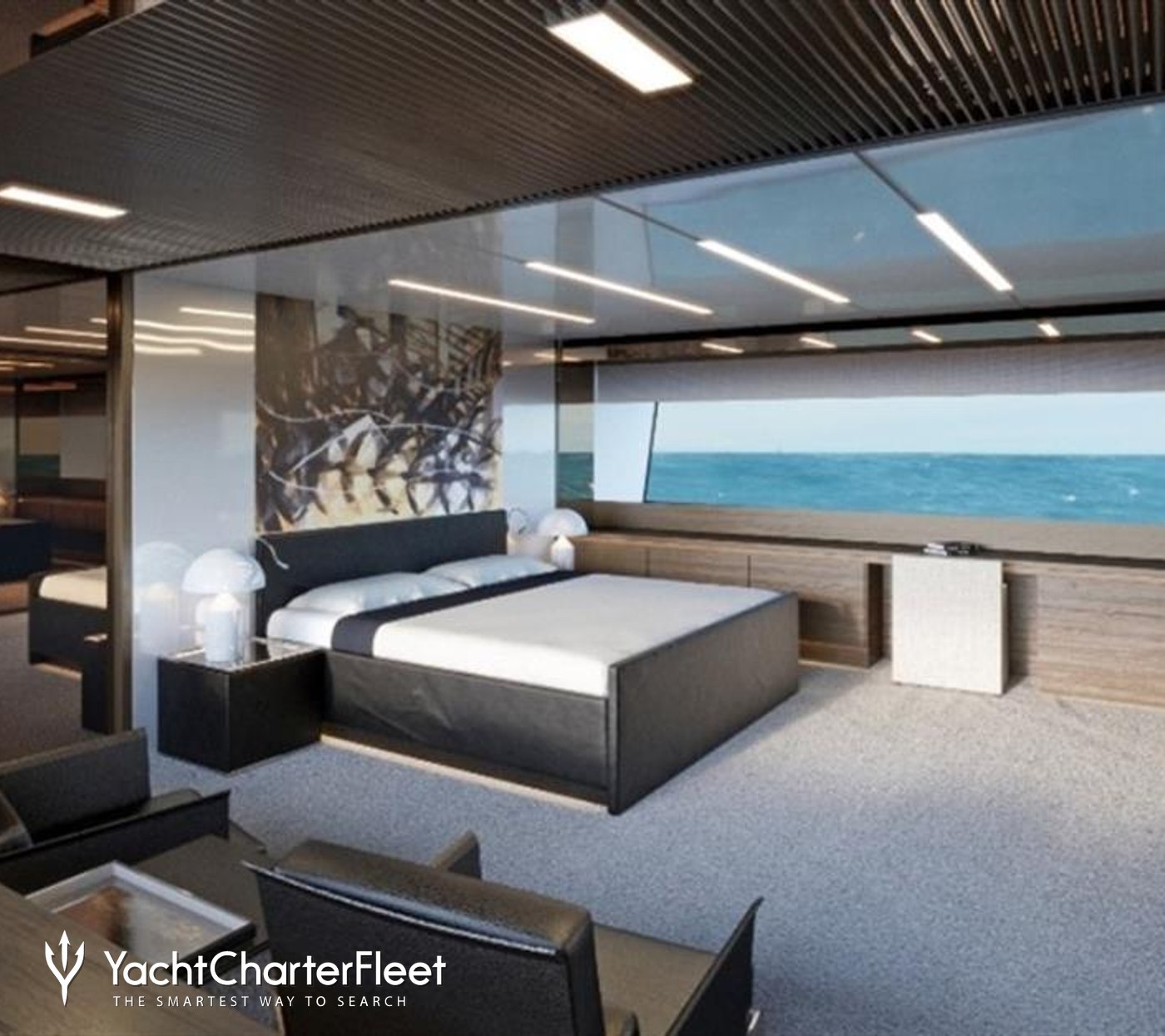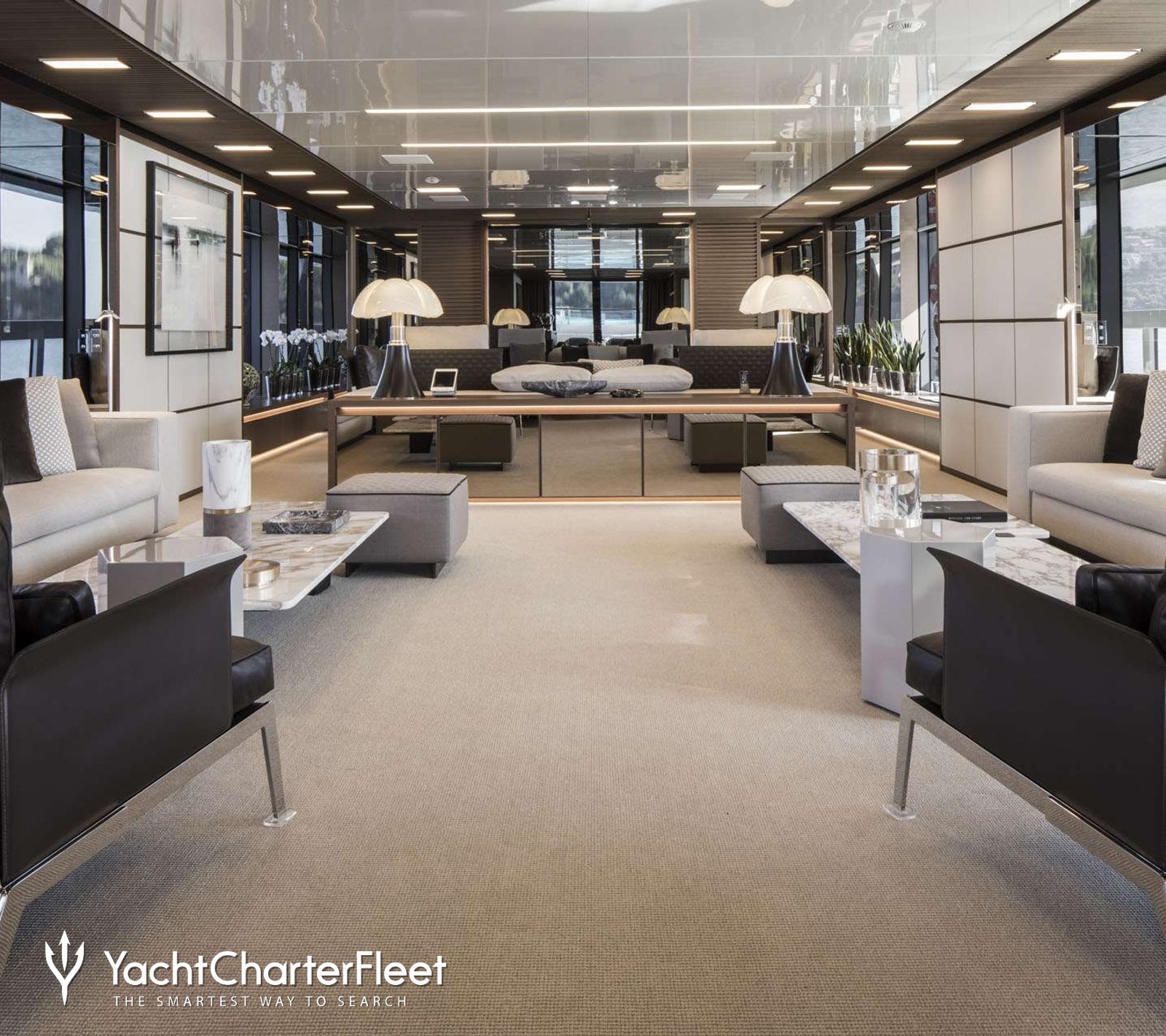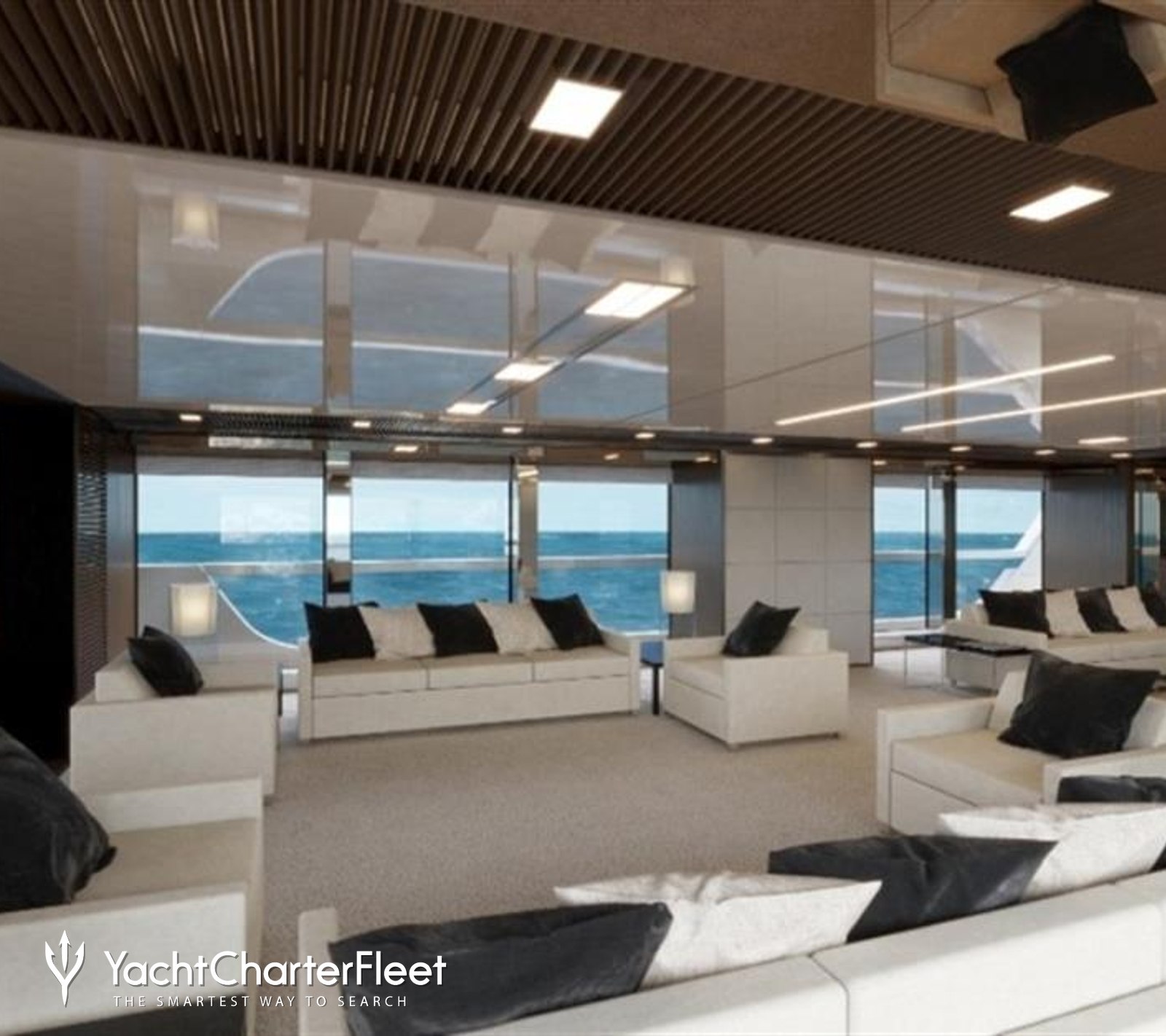 The modern interiors of the Sanlorenzo charter yacht, penned by Officina Italiana Design, feature clean lines, high-quality materials, and plenty of natural light for a sophisticated yet approachable atmosphere.
