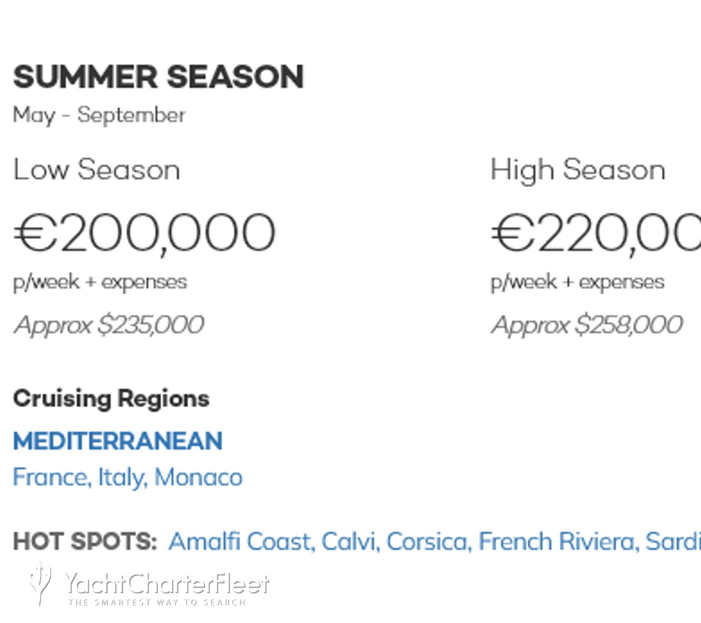 | Charter Fee | VAT (21%) | APA (35%) | Total Charter Cost (Before Tips) | |
