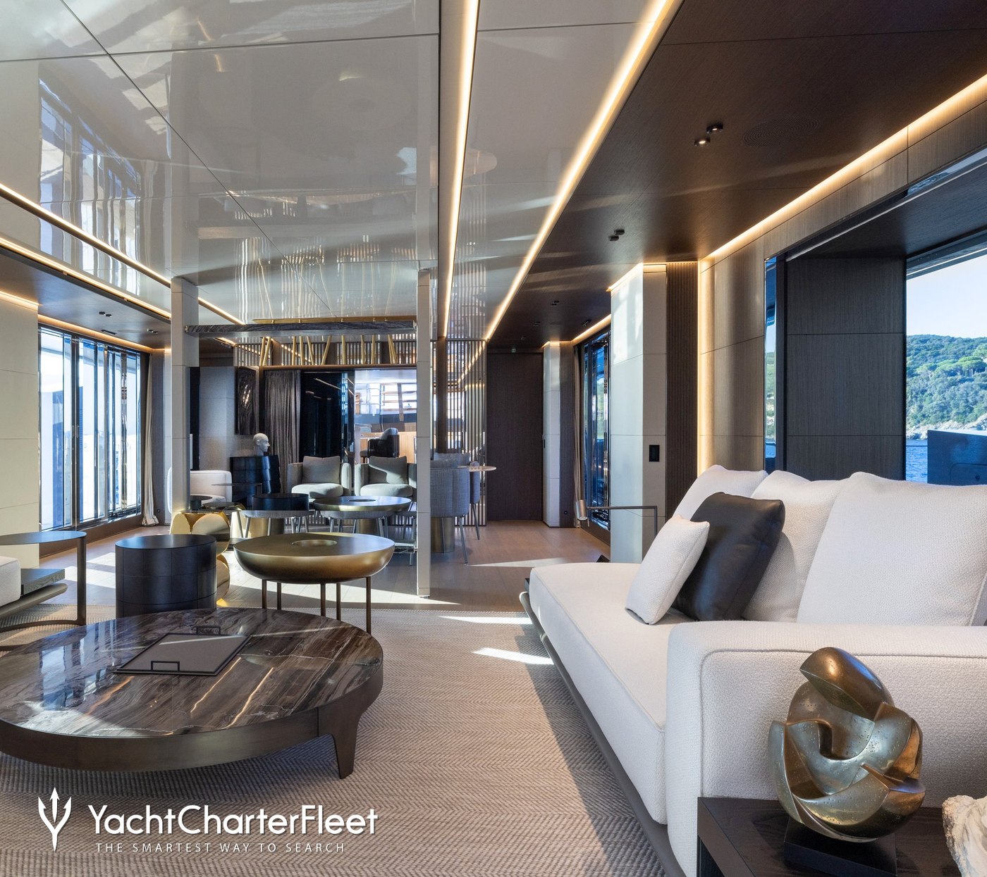 With the main salon featuring comfortable lounge areas, a formal dining setup, and cozy nooks, guests on board the Rossinavi charter yacht have a choice of where to spend their time, with further indulgent spaces in the upper salon.