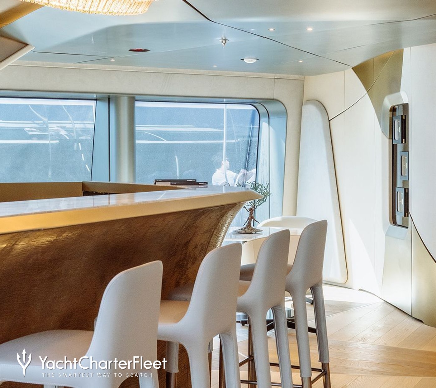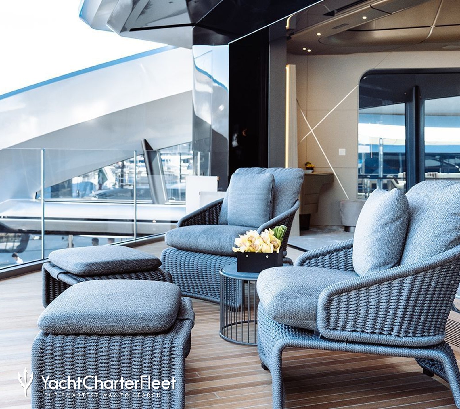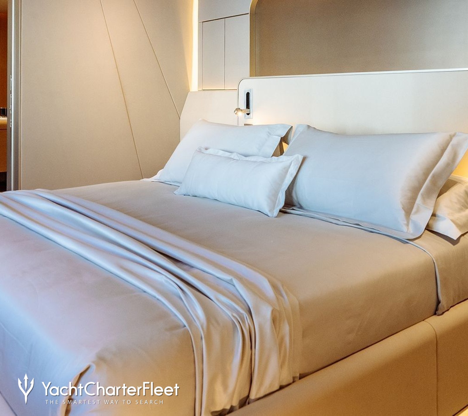 Each cabin reflects the yacht’s contemporary styling, offering a tranquil sanctuary with refined finishes and ample space. Supported by a professional crew of 12, the onboard experience is seamless from start to finish, ensuring every detail of the charter is handled with precision and care.