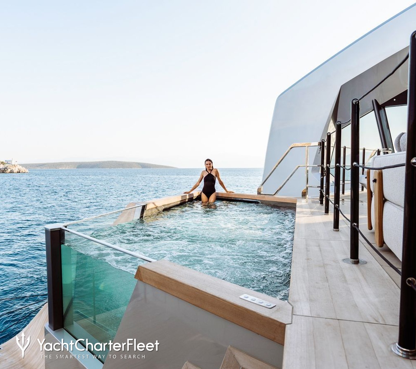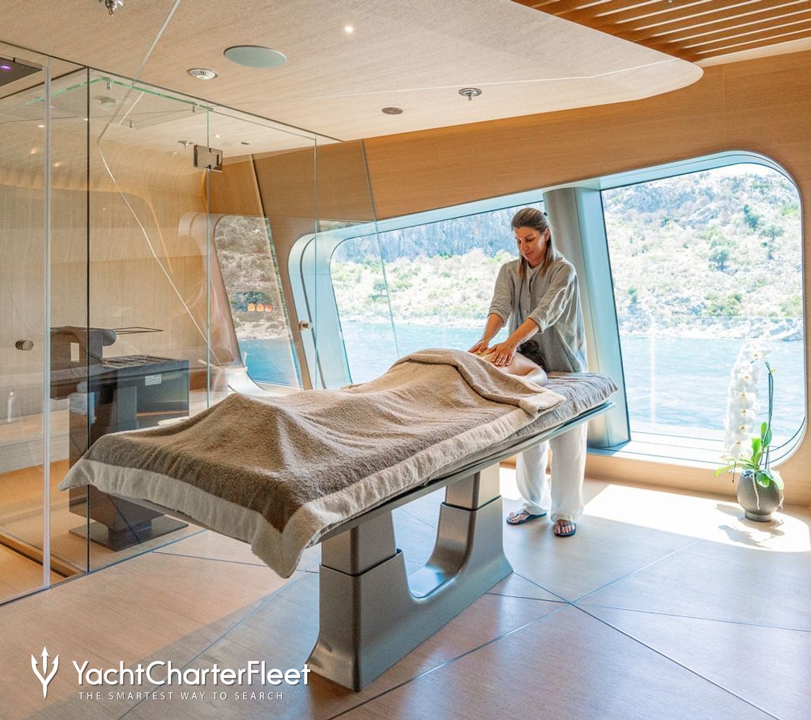 Wellness is a defining feature onboard, with a dedicated spa area offering a serene retreat after a day on the water. Guests can unwind in the sauna, indulge in massage treatments, or relax in the deck Jacuzzi while taking in panoramic views.