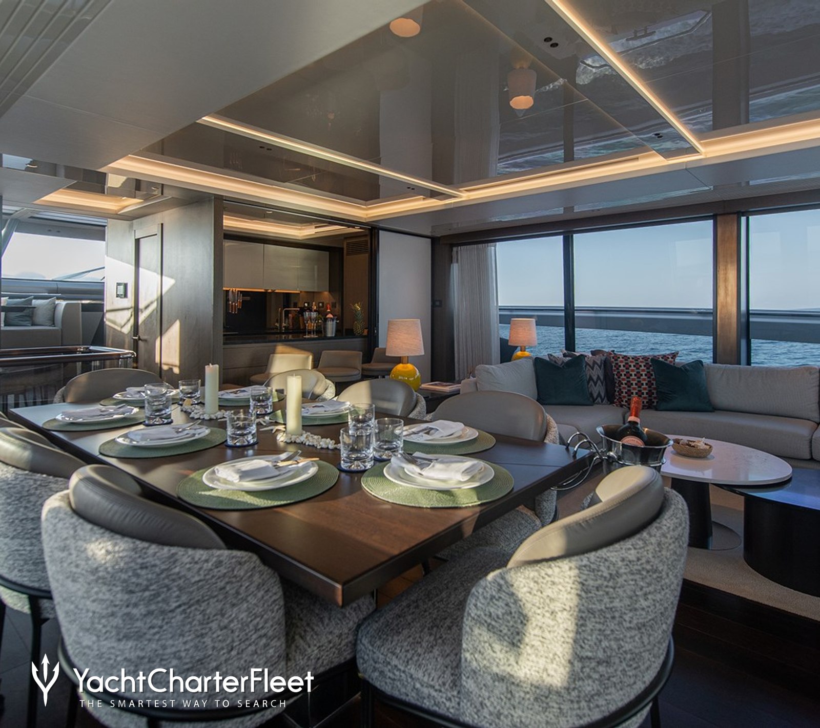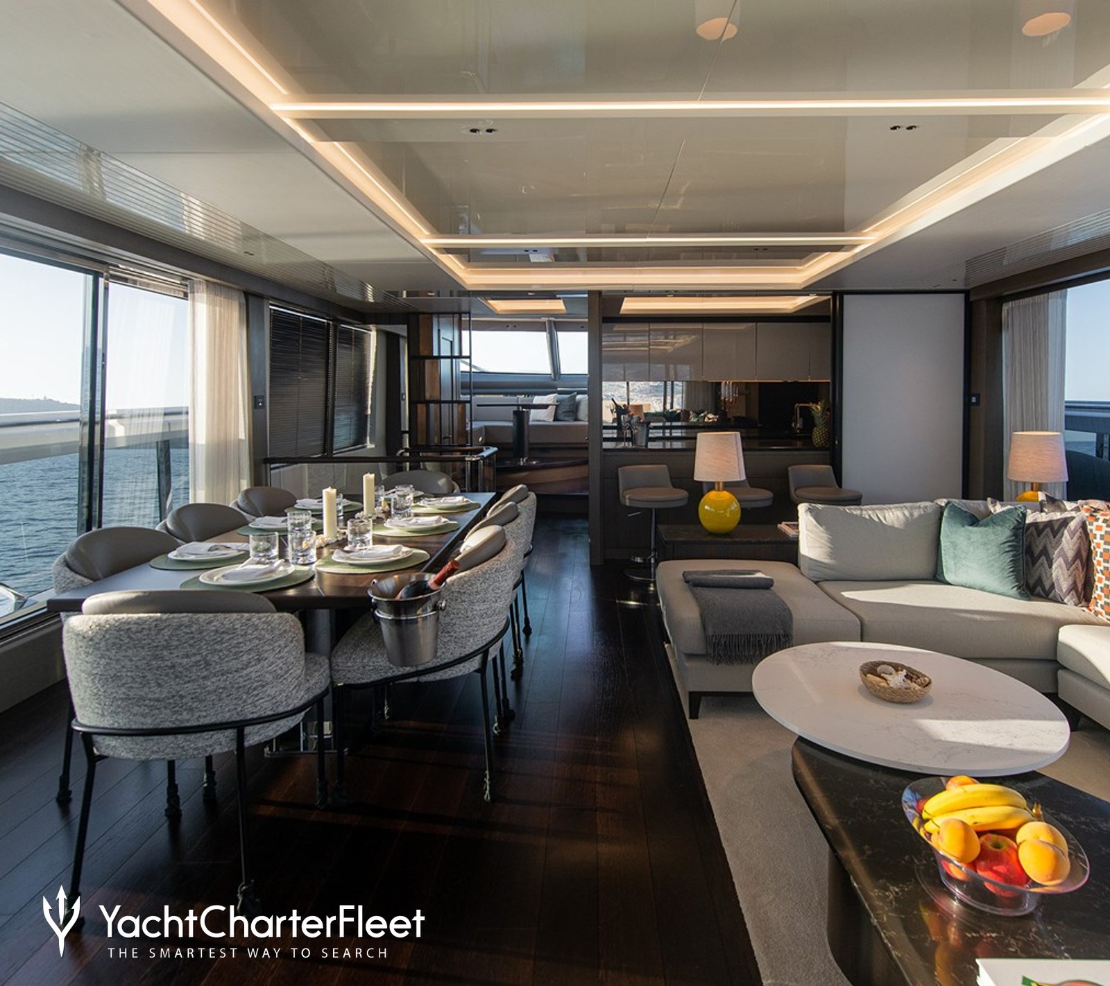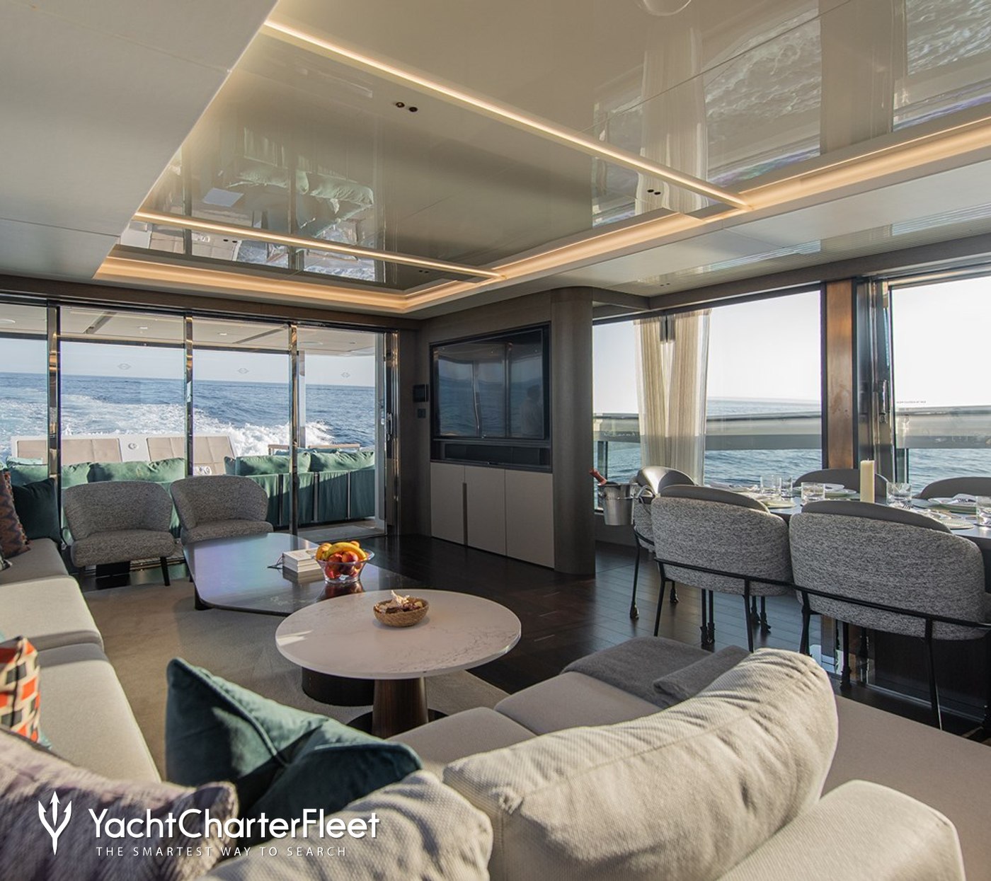 Interiors onboard charter yacht WYLDECREST follow a clean, contemporary aesthetic with large windows bringing in natural light throughout the main salon and accommodation areas.