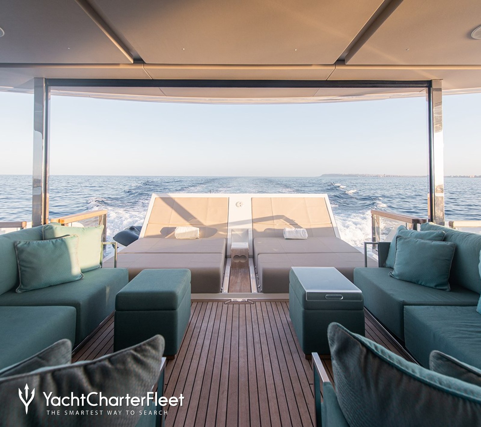 Her exterior layout is designed with flexibility in mind. A standout feature is the custom X-Tend sunbed system, which can be adjusted to extend the cockpit space or create a larger beach club area aft. This setup works particularly well when anchored, creating a seamless connection between the deck and the water.