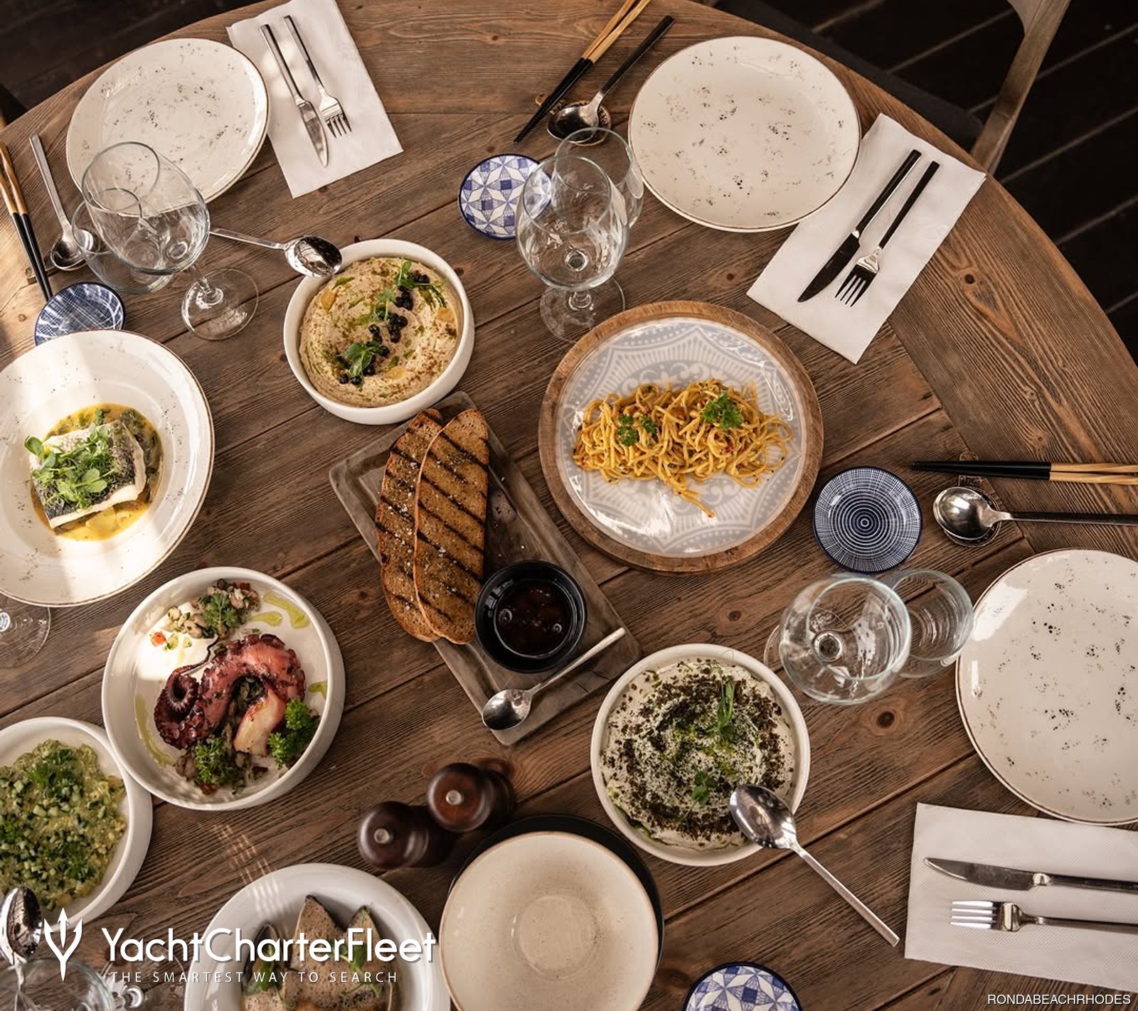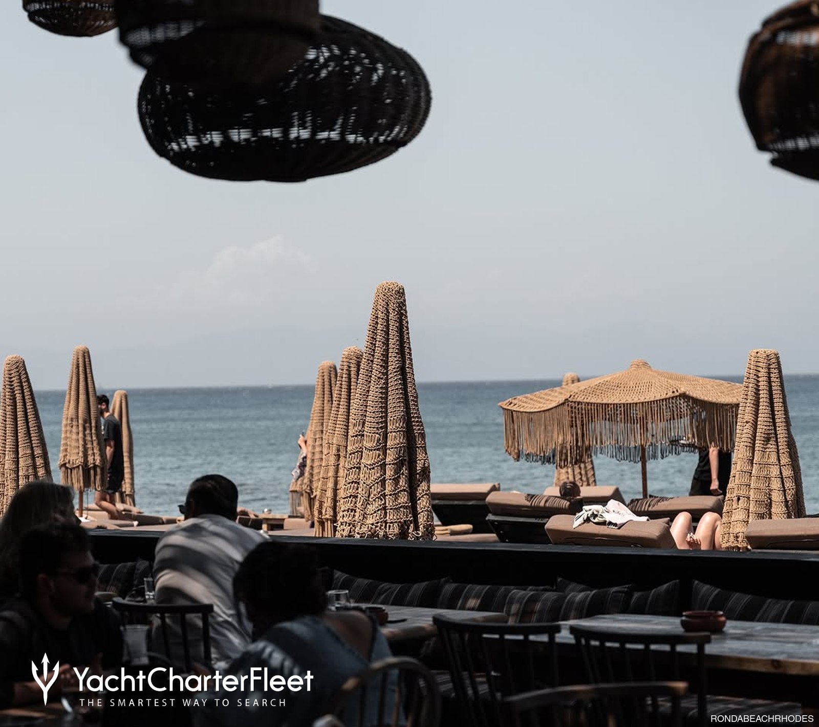 Start your day at Ronda with a relaxed breakfast on the beach. The menu includes snacks, fresh fruit salads, and light bites perfect for hot summer mornings. With shaded areas and table service available, it is easy to settle in for a leisurely start to the day. This accessibility is a significant highlight for guests on a Greece yacht charter looking for a premium land based breakfast or brunch option.
