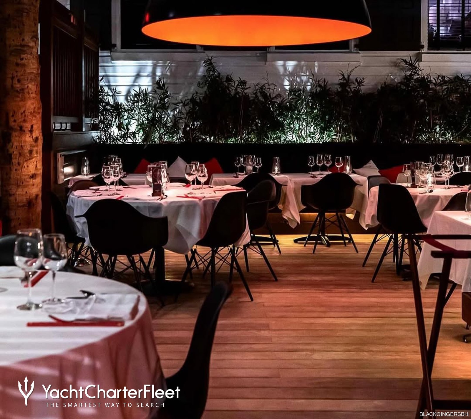 The restaurant’s centerpiece is an open-air courtyard where diners can enjoy their meal under the sky. This feature blends the natural climate of the island with the restaurant’s contemporary aesthetic. It provides a sheltered yet outdoor environment that is well suited for an evening during a Caribbean yacht charter.