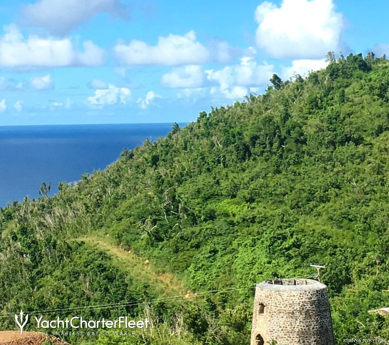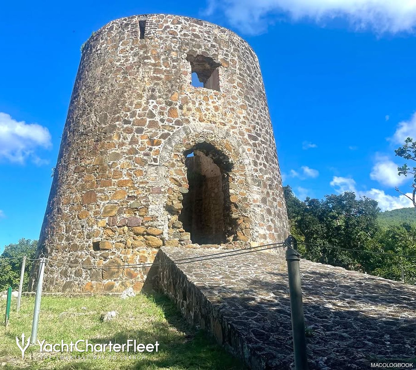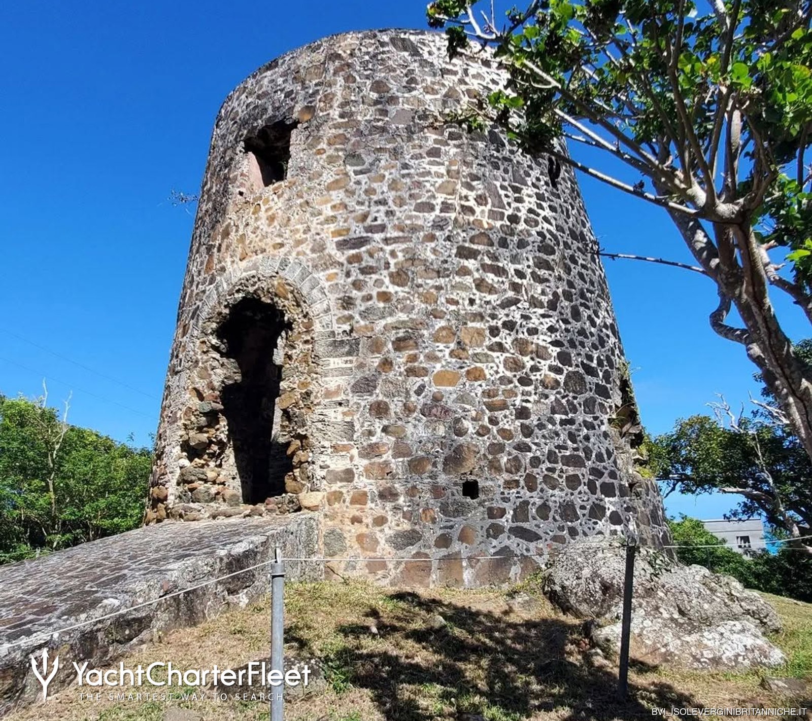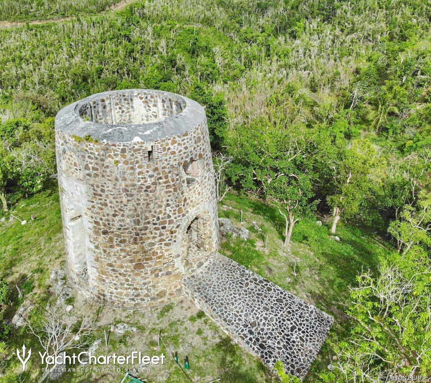 The windmill’s thick, circular walls and strategic openings give a sense of how the plantation operated. Those exploring the site as part of a yacht charter often take time to walk through nearby remnants of the boiling house, factory, and quarters that formed the wider estate.