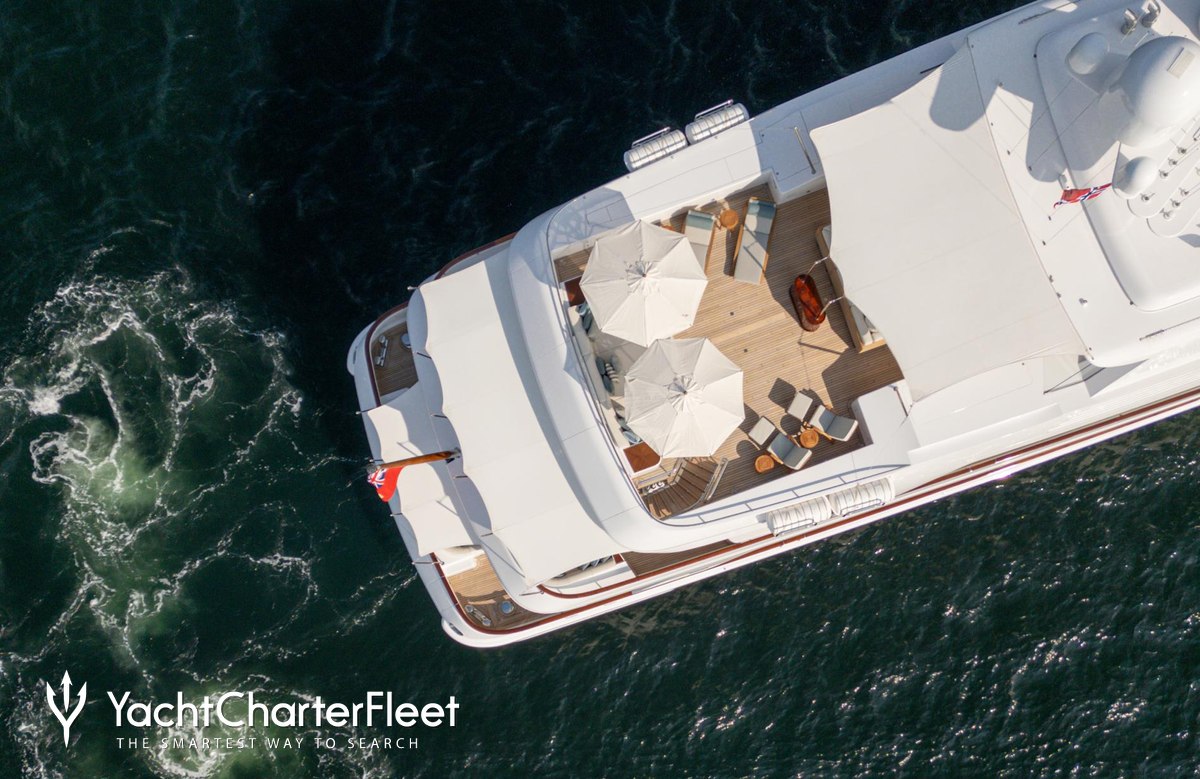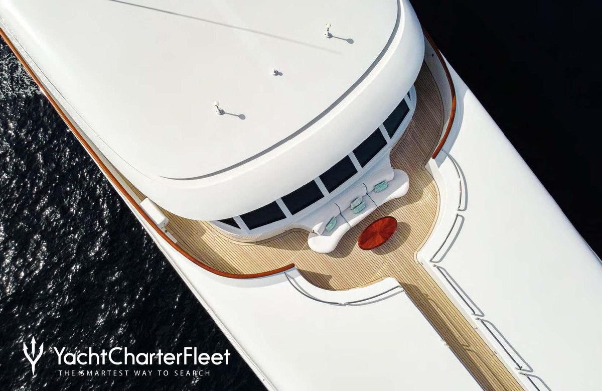 Built with a steel hull and aluminium superstructure, she offers greater on-board space and is more stable when at anchor thanks to her full-displacement hull. Powered by twin Caterpillar engines, she comfortably cruises at 12 knots, reaches a maximum speed of 16 knots with a range of up to 3,500 nautical miles from her 128,000 litre fuel tanks at cruising speed. An advanced stabilisation system on board reduces the side-to-side roll of the yacht and promises guests exceptional comfort levels at anchor or when underway.