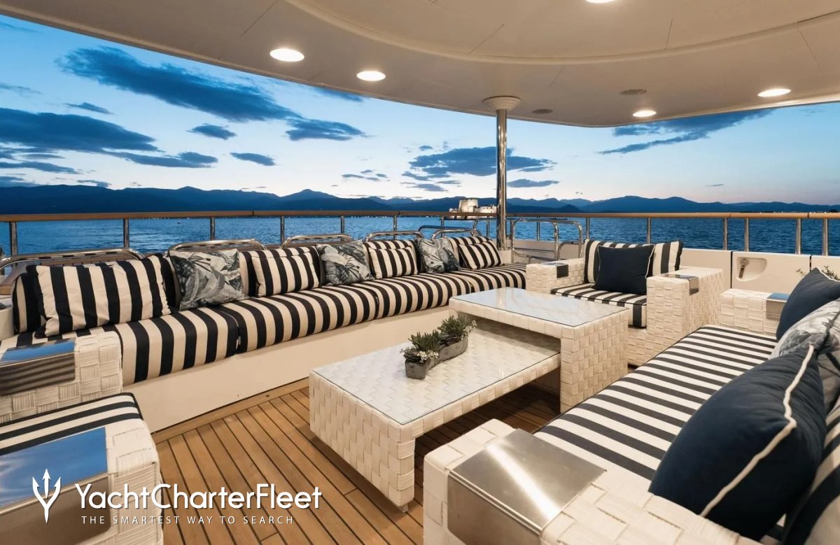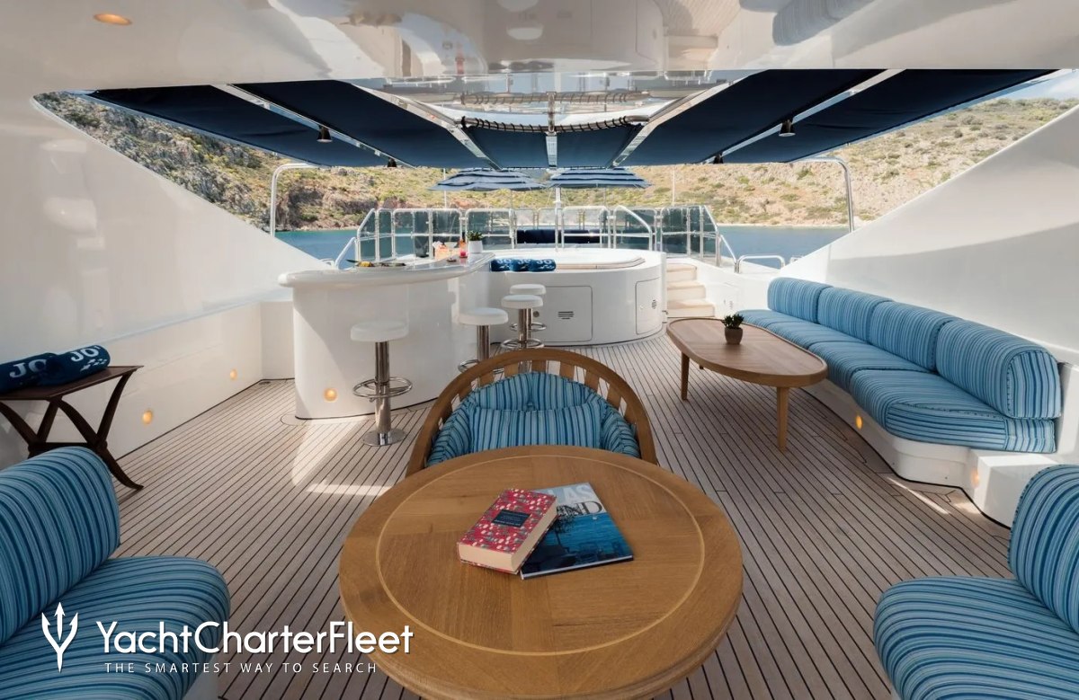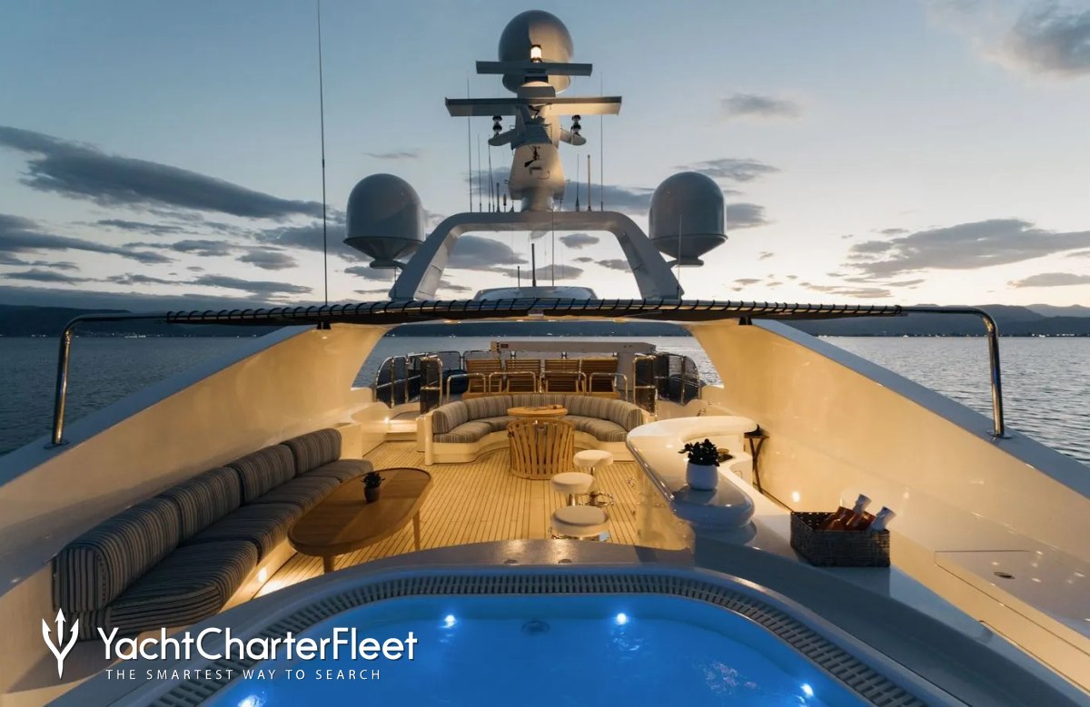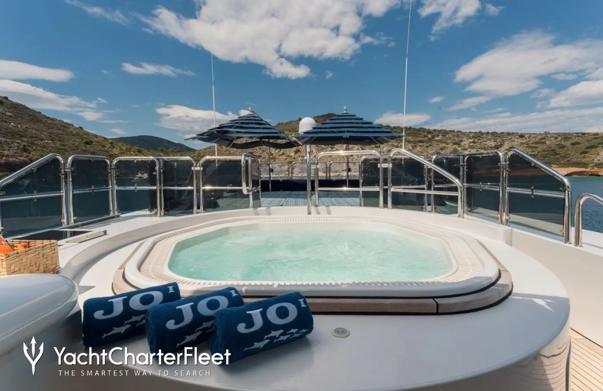 Keeping comfortable and entertained on Jo I is easy thanks to the available amenities including a dancefloor where you and your guests can celebrate in style. Head to the beach club and take advantage of indoor-outdoor living and entertaining plus retreat to the deck jacuzzi and soak up the scenery.