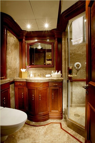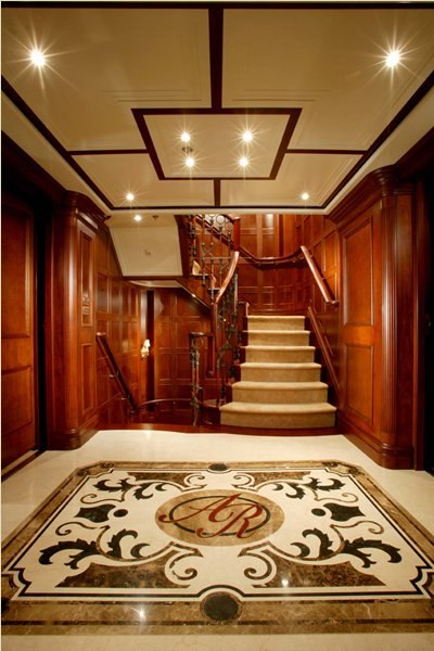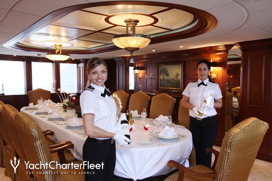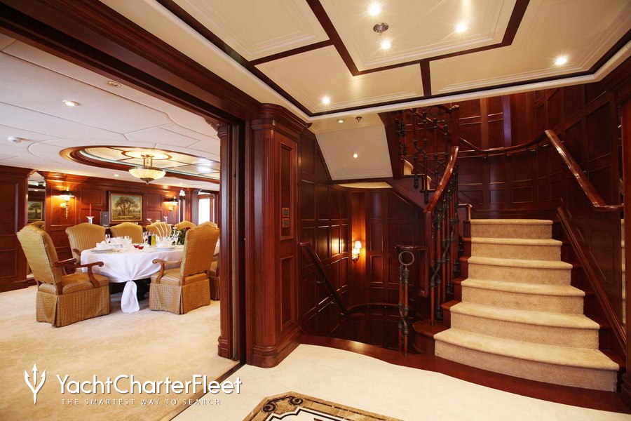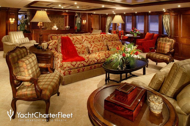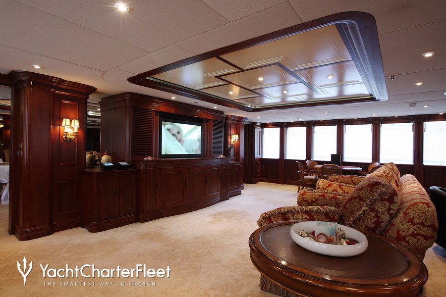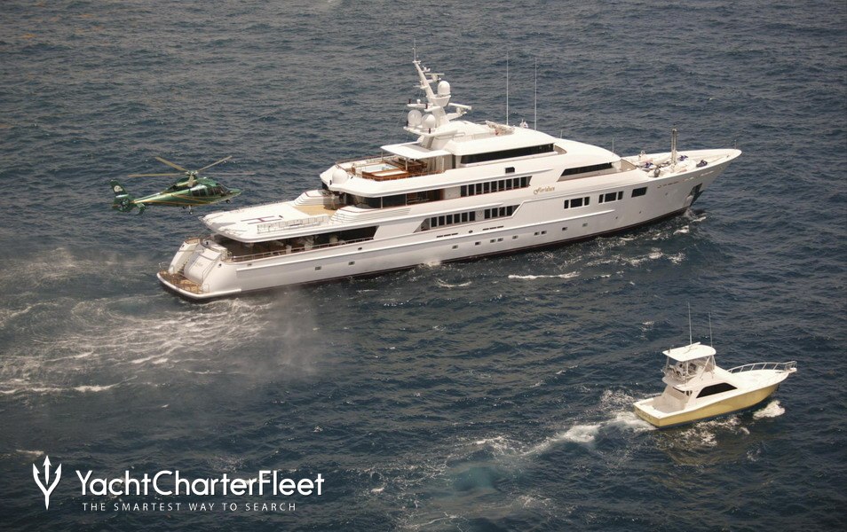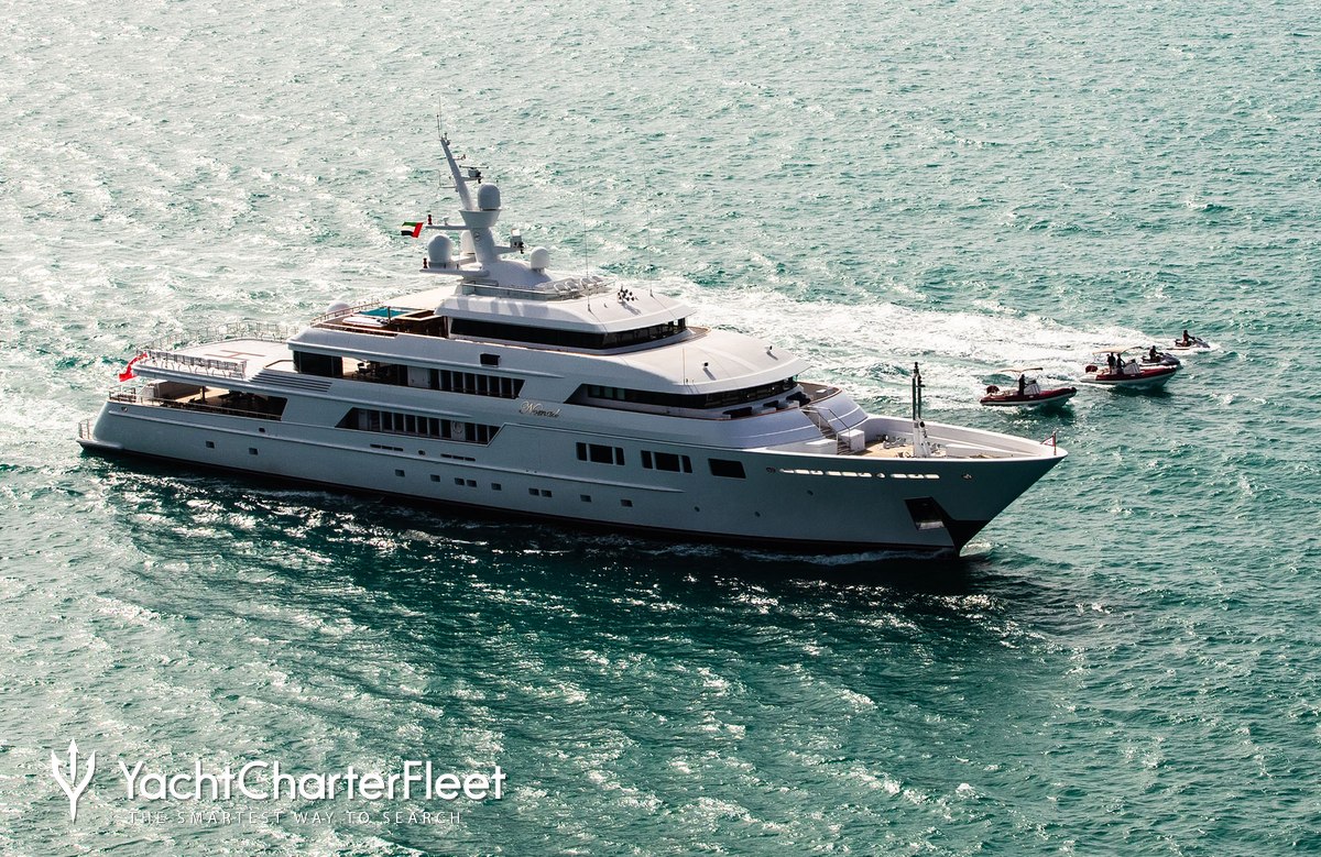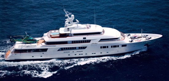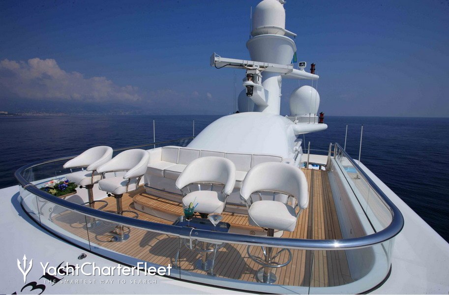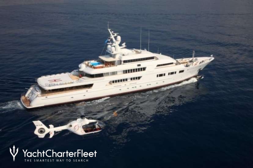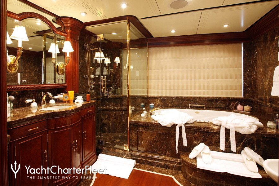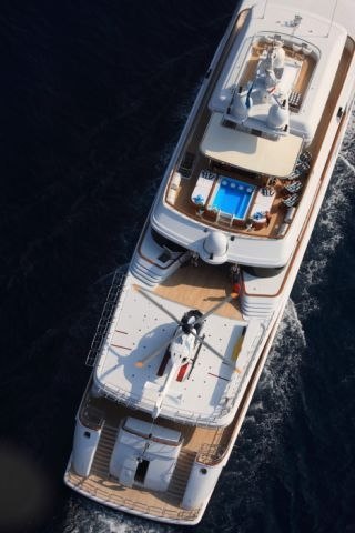 Built with a aluminium hull and aluminium / grp superstructure, she offers greater on-board space and is more stable when at anchor thanks to her full-displacement hull. Powered by twin Caterpillar engines, she comfortably cruises at 15 knots, reaches a maximum speed of 16 knots with a range of up to 9,789 nautical miles from her 220,000 litre fuel tanks at 12 knots. An advanced stabilisation system on board reduces the side-to-side roll of the yacht and promises guests exceptional comfort levels at anchor or when underway.