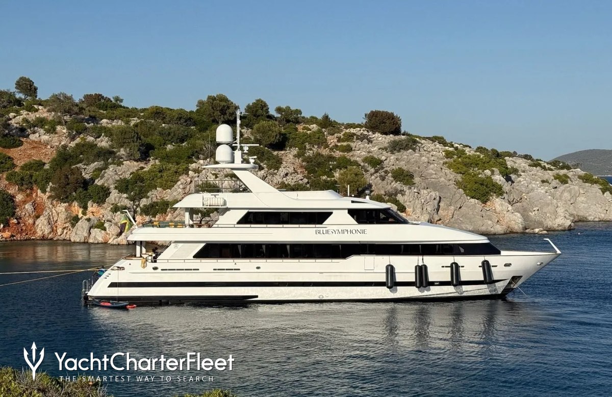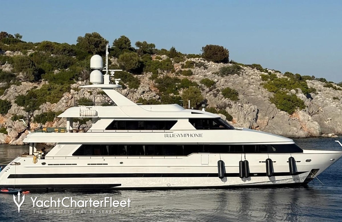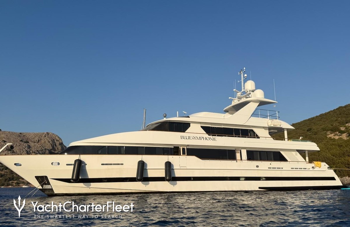 The 36.9m/121'1" motor yacht 'Blue Symphonie' (ex. Rearden Steel) by the Dutch shipyard Moonen offers flexible accommodation for up to 10 guests in 5 cabins and features interior styling by Dee Robinson Interiors.