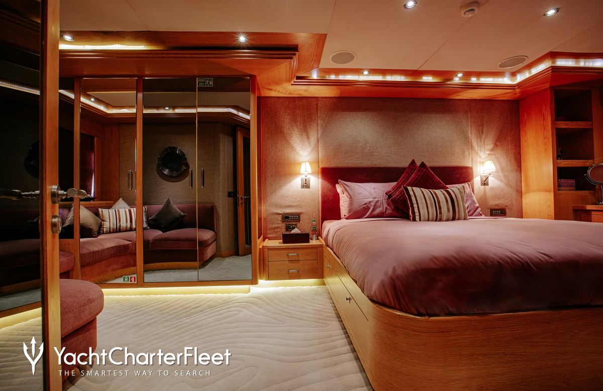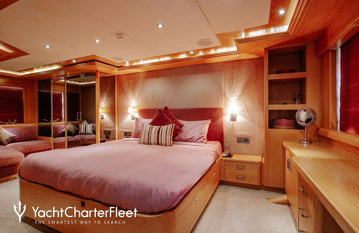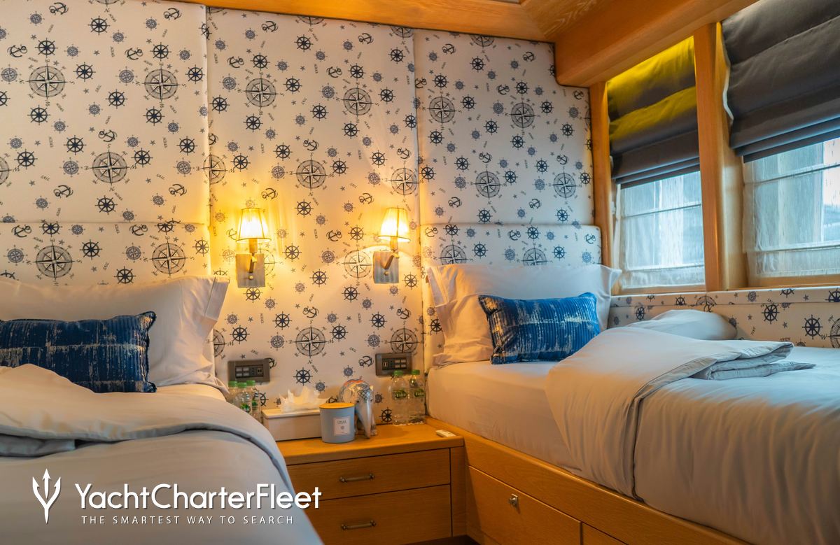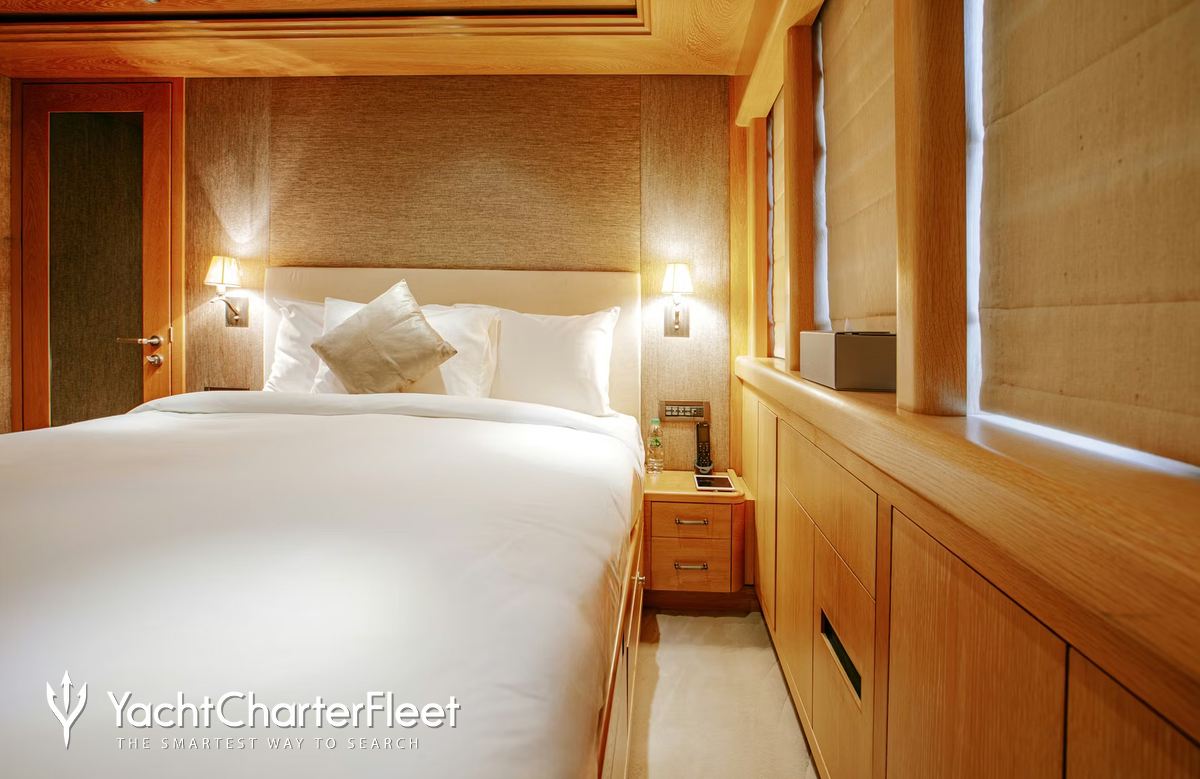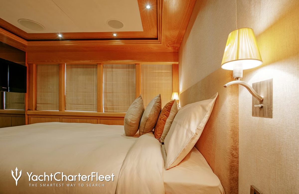 Built in 2010, Indiana offers guest accommodation for up to 8 guests in 4 suites comprising a master suite located on the main deck, one VIP cabin, two double cabins and one twin cabin. There are 6 beds in total, including 1 king, 2 doubles and 2 singles. She is also capable of carrying up to 7 crew onboard to ensure a relaxed luxury yacht charter experience.