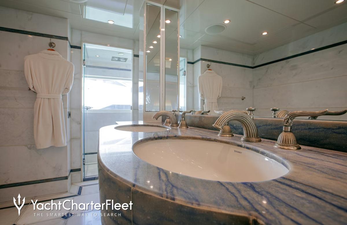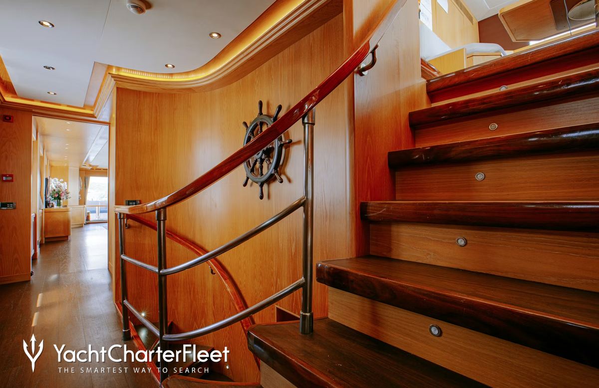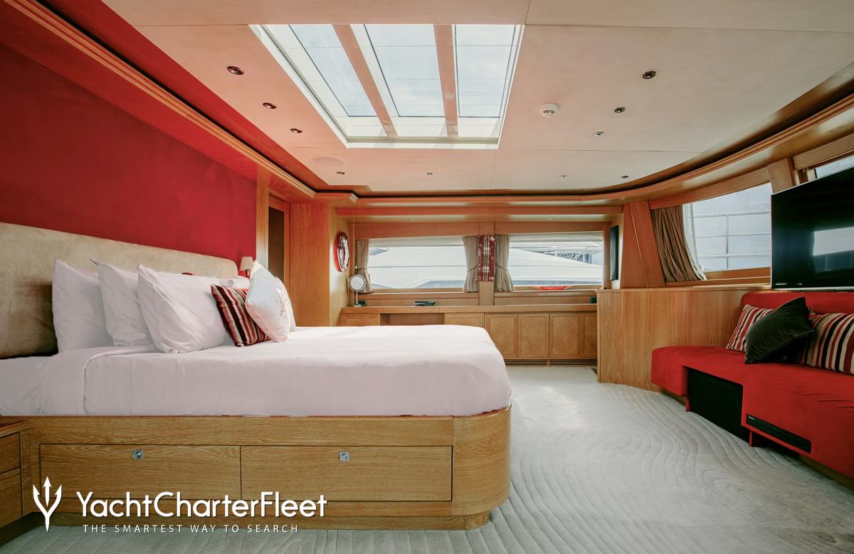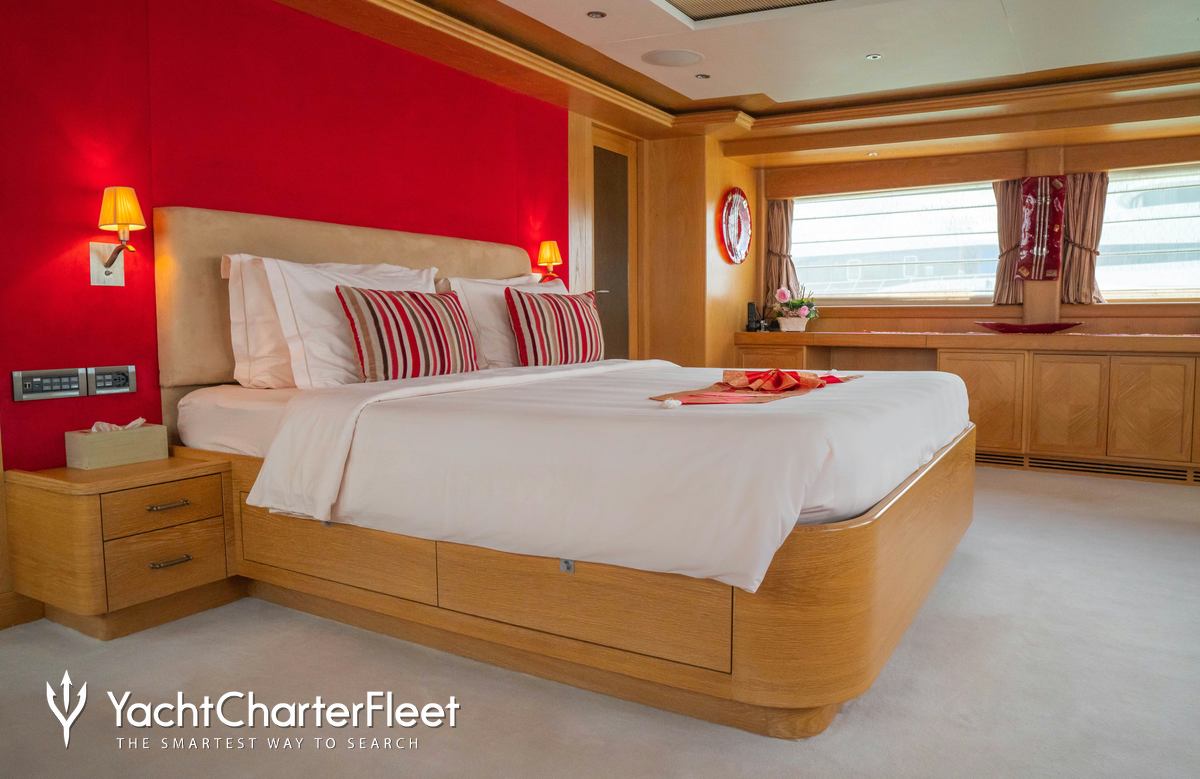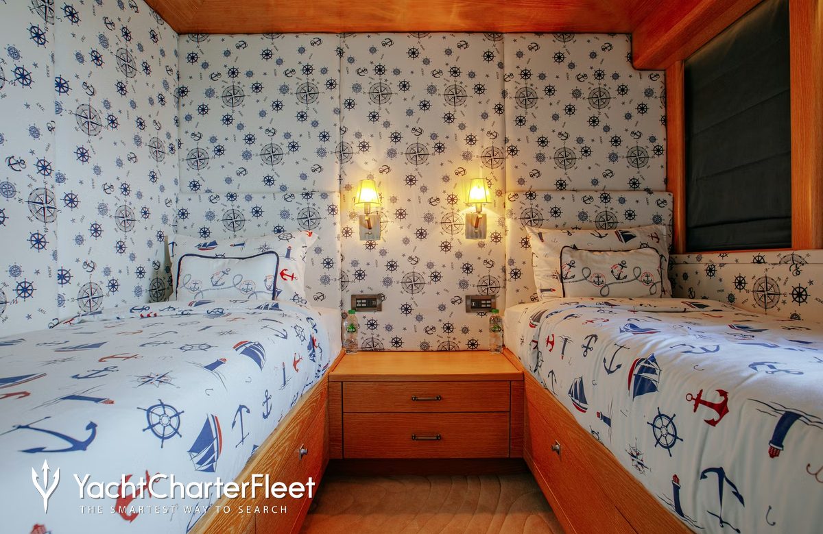 Built in 2010, Indiana offers guest accommodation for up to 8 guests in 4 suites comprising a master suite located on the main deck, one VIP cabin, two double cabins and one twin cabin. There are 6 beds in total, including 1 king, 2 doubles and 2 singles. She is also capable of carrying up to 7 crew onboard to ensure a relaxed luxury yacht charter experience.