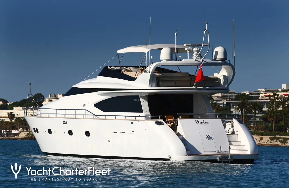 The 21.5m/70'6" 'Yakos' motor yacht built by the Italian shipyard Maiora is available for charter for up to 10 guests in 4 cabins. This yacht features interior styling by Italian designer Maiora.