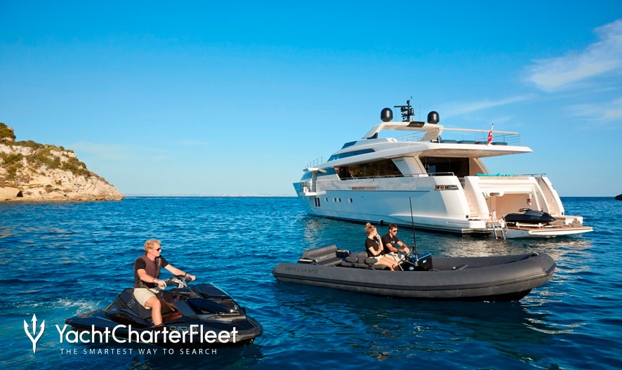 Onboard Riana II has a large selection of toys and accessories to keep you and your guests entertained on the water throughout your stay. Take to the sea on a Jet Ski offering you power and control on the water. Also there are two waterskis that are hugely entertaining whether you are a beginner or a seasoned pro. Another excellent feature are two SEABOBs, that allow you to skim along the surface or steer under the crystal water and experience life swimming with the fish. If that isn't enough Riana II also features wakeboards, canoes, fishing equipment, kneeboards and paddleboards. Riana II features two tenders, but leading the pack is a 9.9m/32'6" Onda Chase Tender to transport you in style.