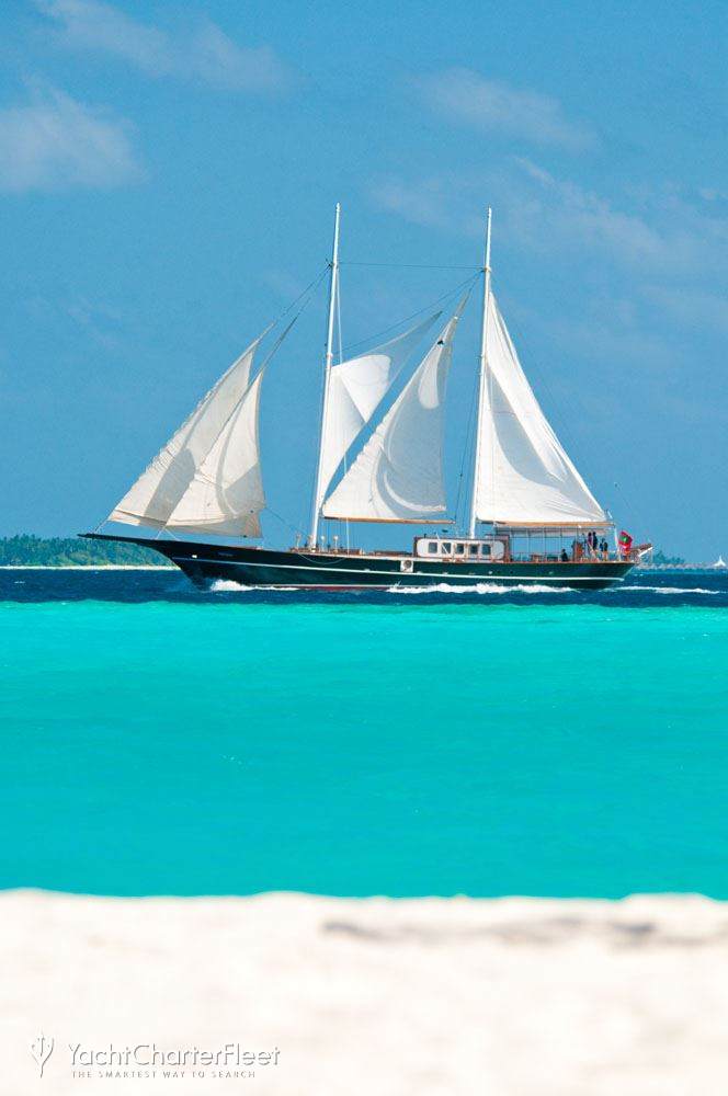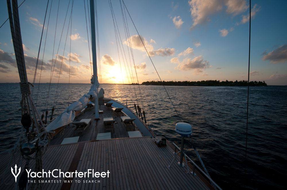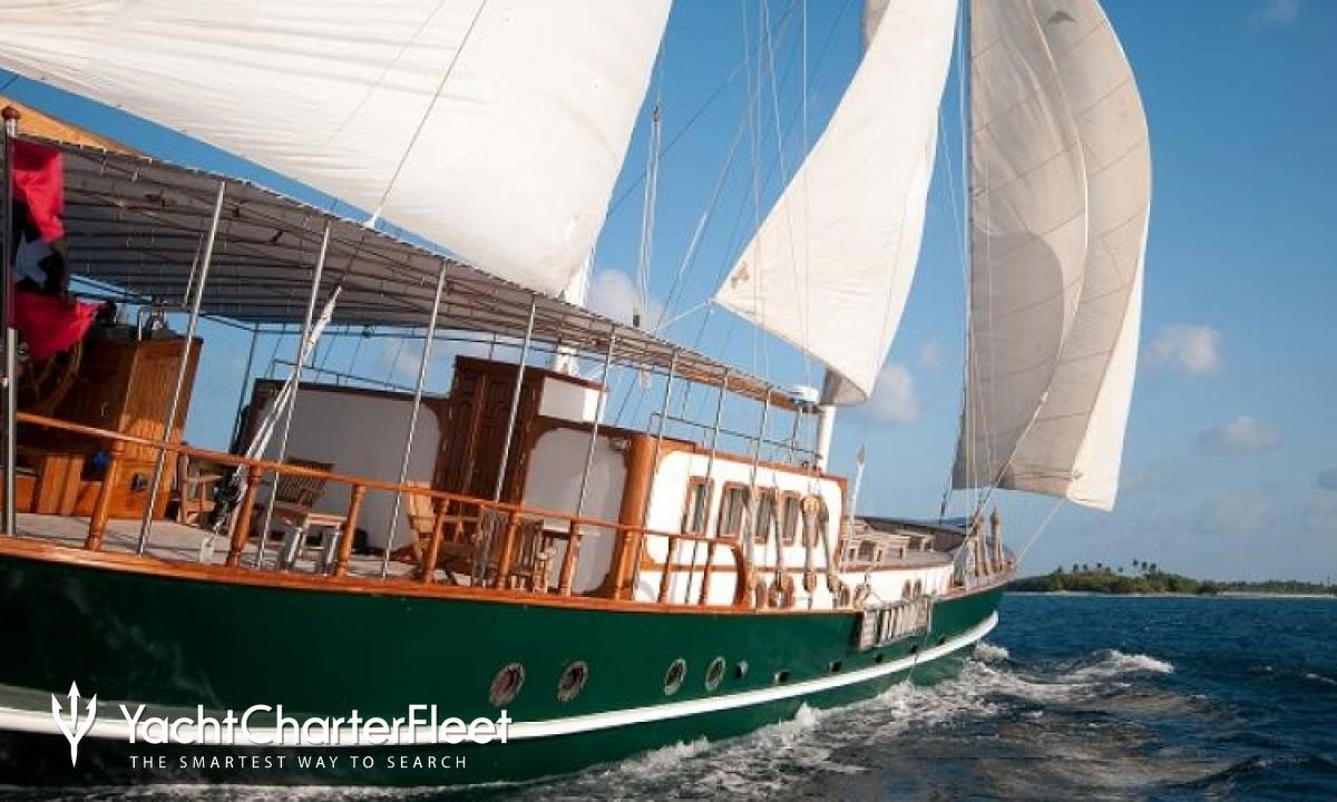 The 29m/95'2" 'Dream Voyager' sail yacht built by shipyard Custom is available for charter for up to 12 guests in 6 cabins.