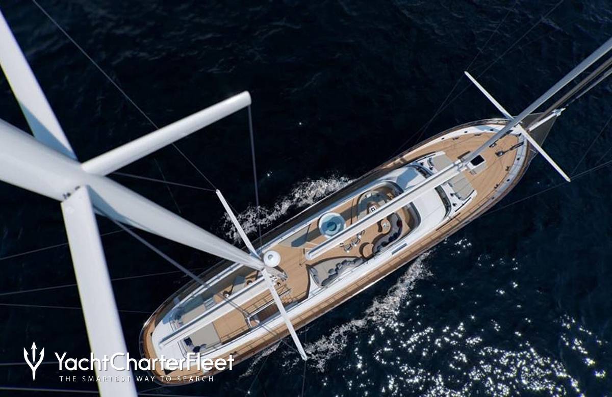 The 49m/160'9" sail yacht 'Acapella' by shipyard Custom offers flexible accommodation for up to 12 guests in 5 cabins and features interior styling by Salt & Water Studio.