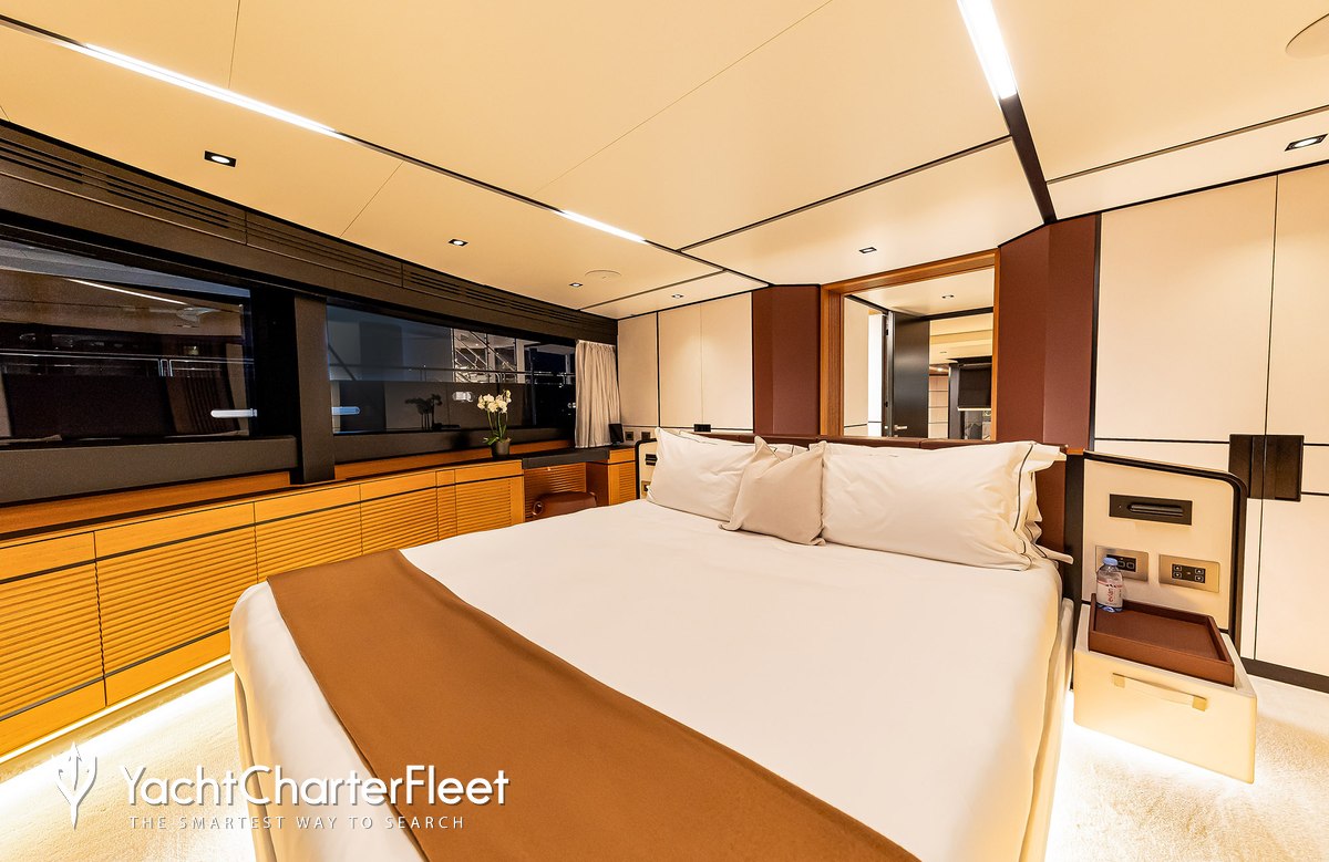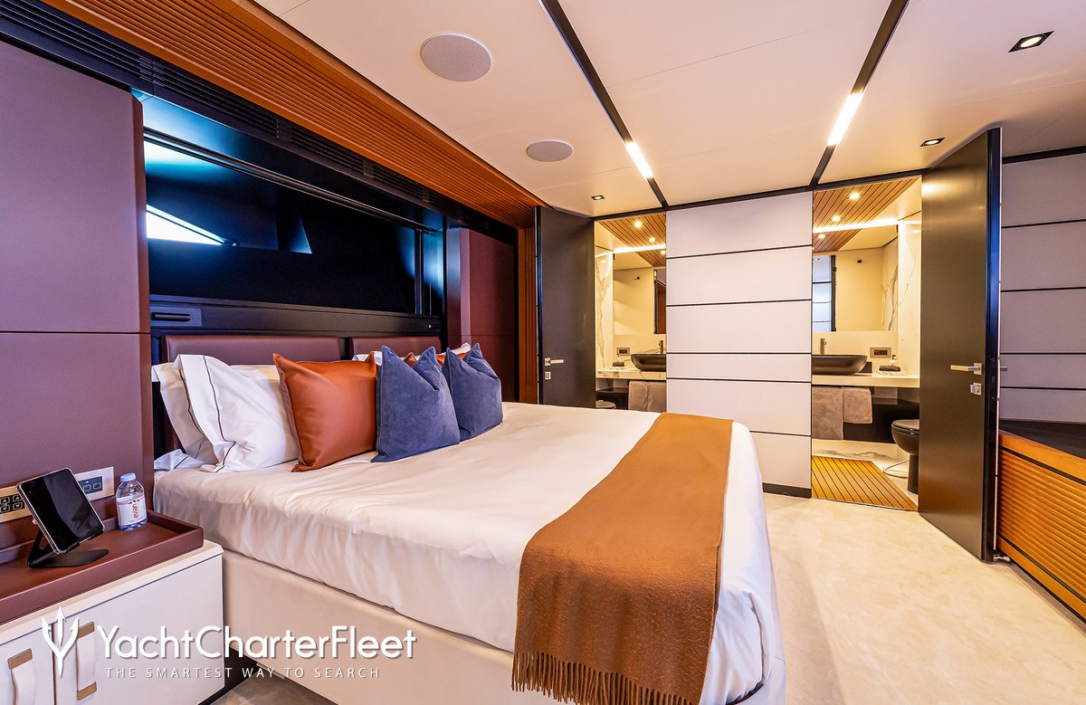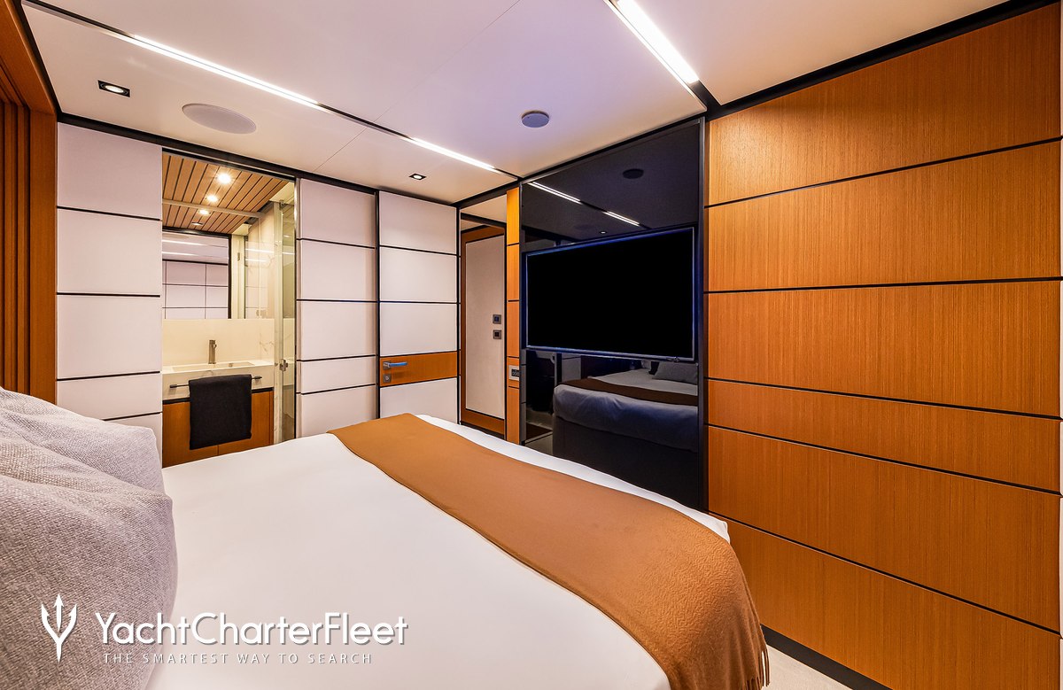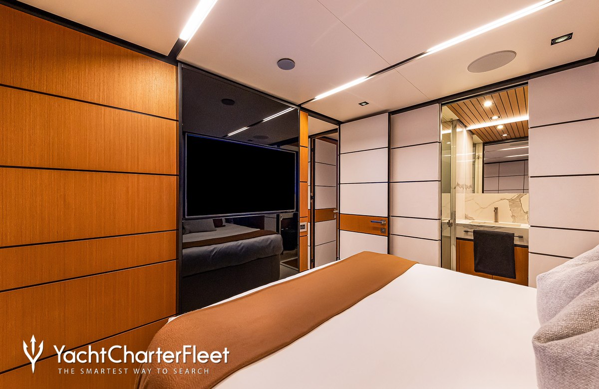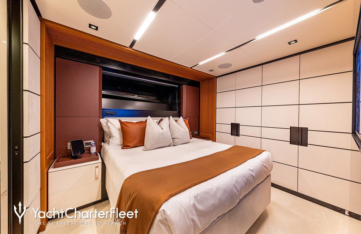 Bad Mutha offers guest accommodation for up to 8 guests in 4 suites comprising a master suite, one VIP cabin and two double cabins. There are 4 beds in total, including 2 king and 2 queen. She is also capable of carrying up to 5 crew onboard to ensure a relaxed luxury yacht charter experience.