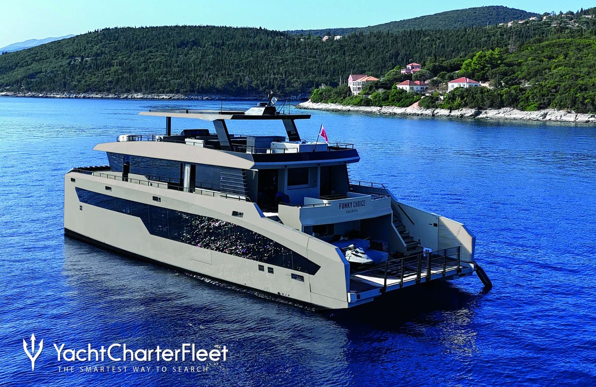 The 27m/88'7" catamaran yacht 'Funky Choice' is an excellent new superyacht for the luxury charter market. Delivered by shipyard Floeth Yachts she can comfortably accommodate up to 8 guests in 4 cabins.